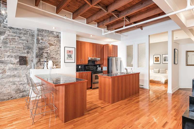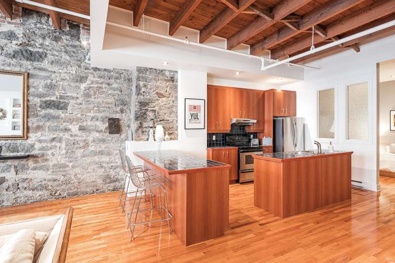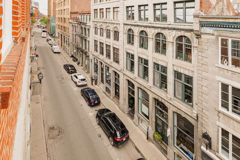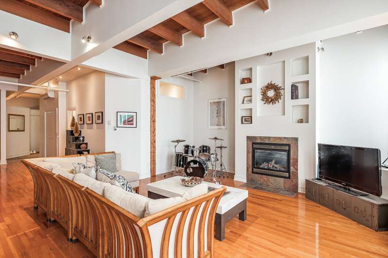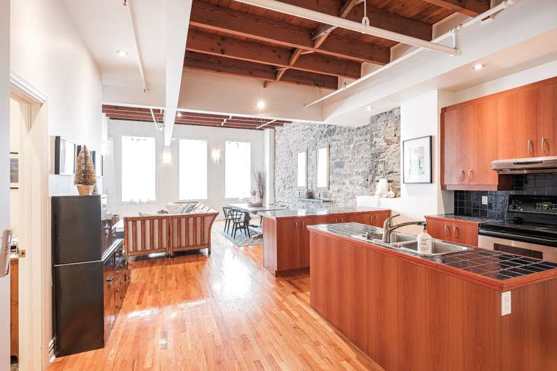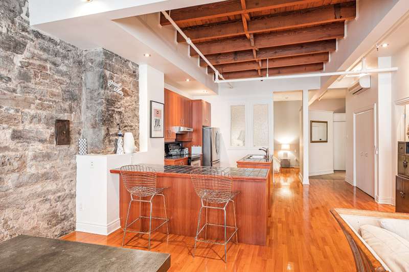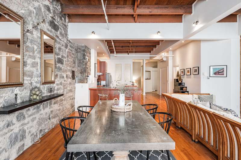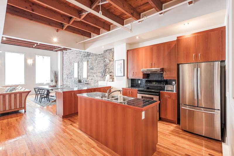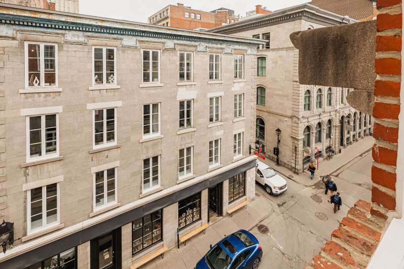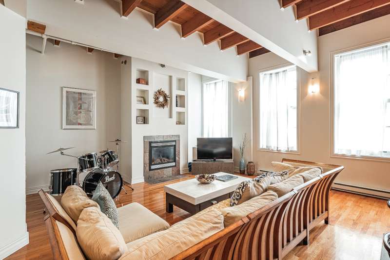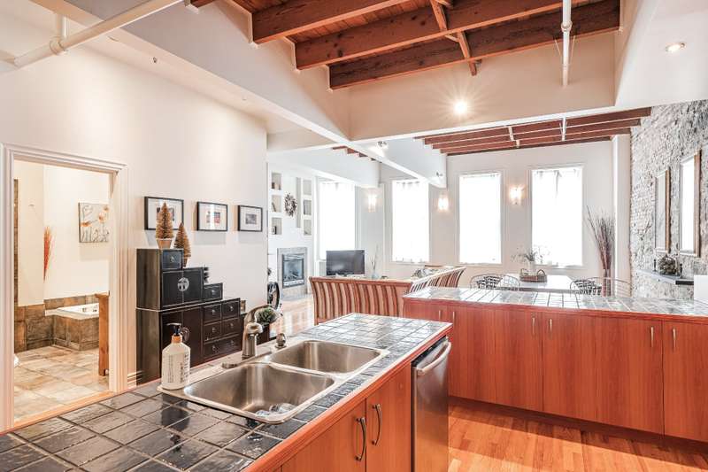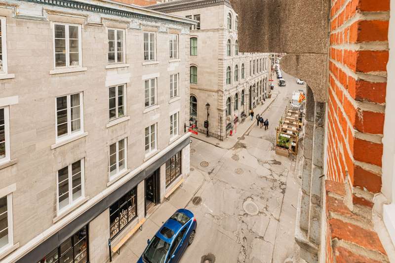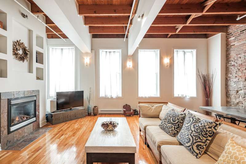 Iconic top-floor loft on Place d'Youville in Old Montreal. Soaring 15' ceilings, exposed beams, hardwood floors, stone wall, and French windows overlooking Olive & Gourmando. Open-concept living with gas fireplace, dining area, and dual-island kitchen. Spacious bathroom with soaker tub and separate shower. Located in a quiet 11-unit historic building with elevator, private locker, and nearby parking. Steps from the Old Port, Notre-Dame Basilica, top restaurants, Square Victoria metro and future REM station. Possibility to build your own private rooftop terrace. A rare opportunity!