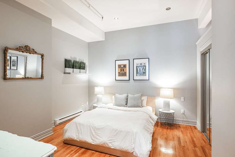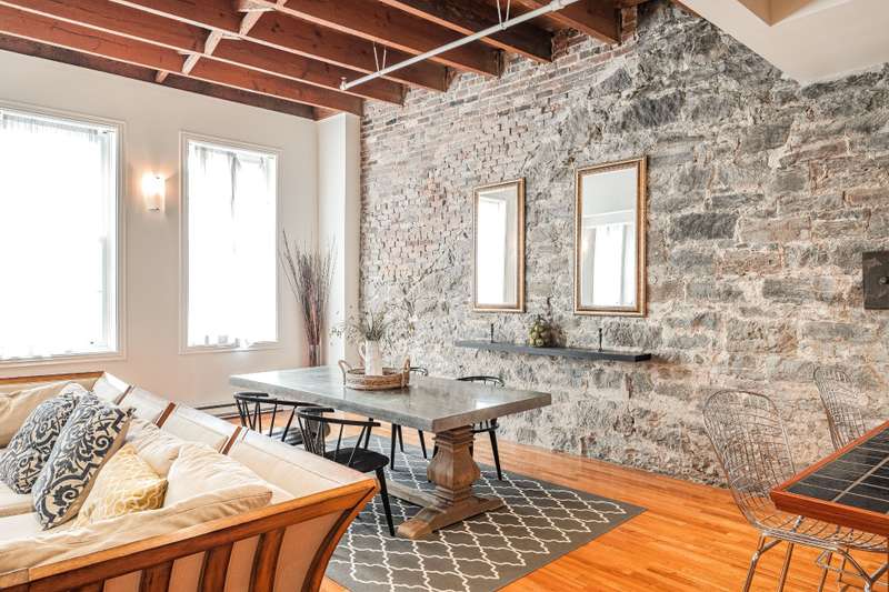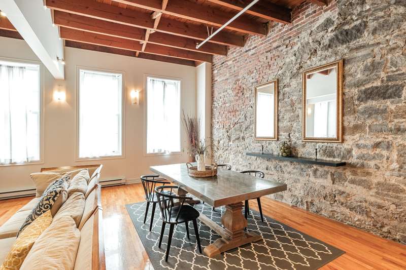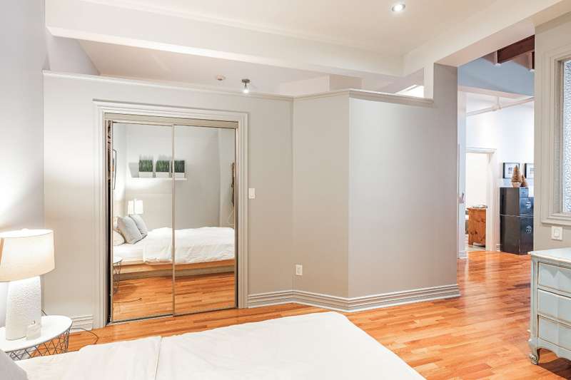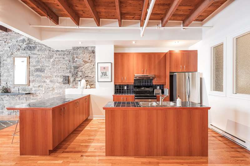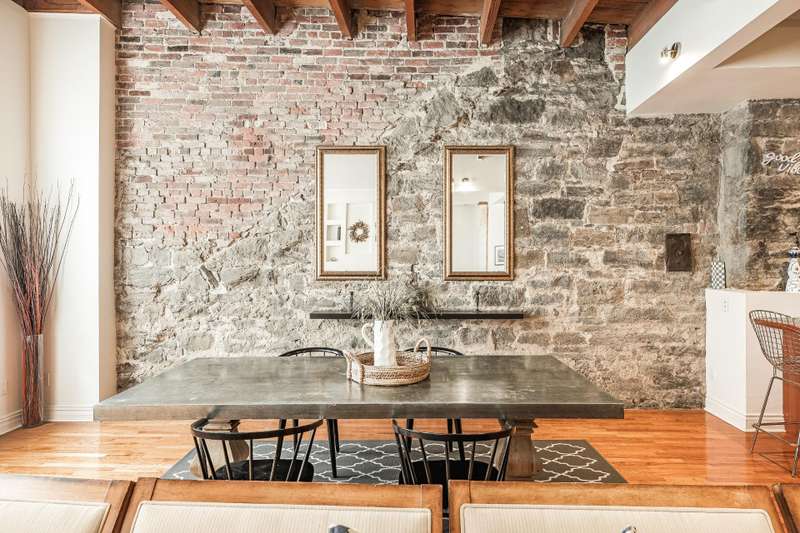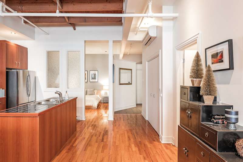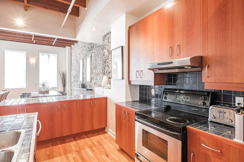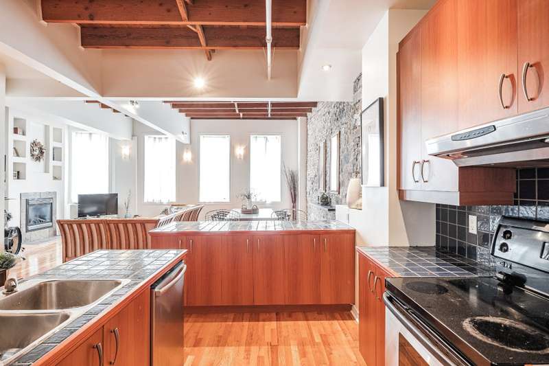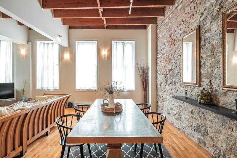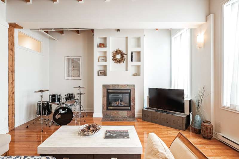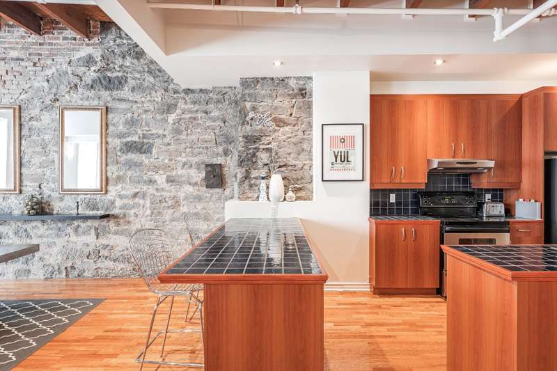 Iconic top-floor loft on Place d'Youville in Old Montreal. Soaring 15' ceilings, exposed beams, hardwood floors, stone wall, and French windows overlooking Olive & Gourmando. Open-concept living with gas fireplace, dining area, and dual-island kitchen. Spacious bathroom with soaker tub and separate shower. Located in a quiet 11-unit historic building with elevator, private locker, and nearby parking. Steps from the Old Port, Notre-Dame Basilica, top restaurants, Square Victoria metro and future REM station. Possibility to build your own private rooftop terrace. A rare opportunity!