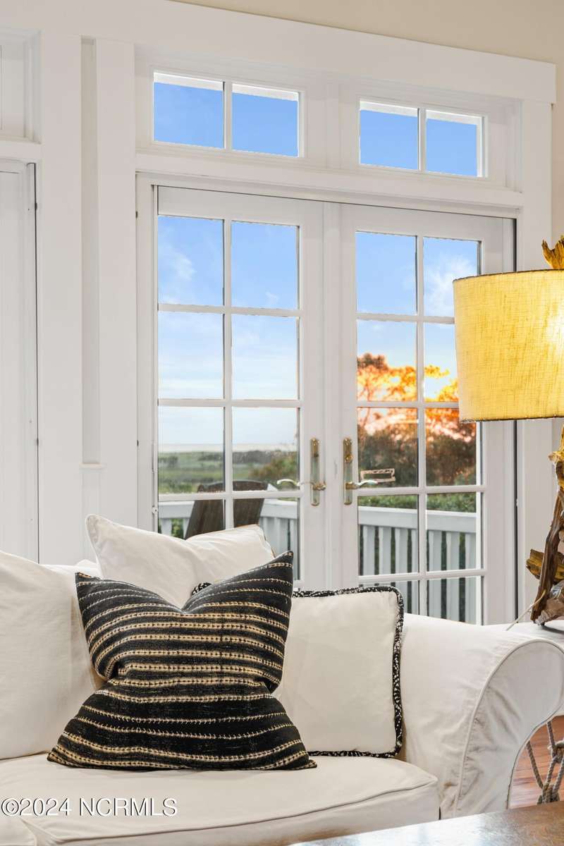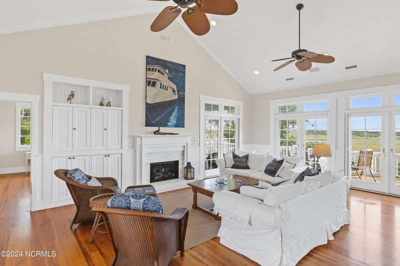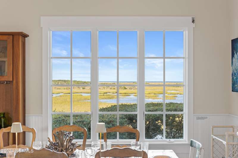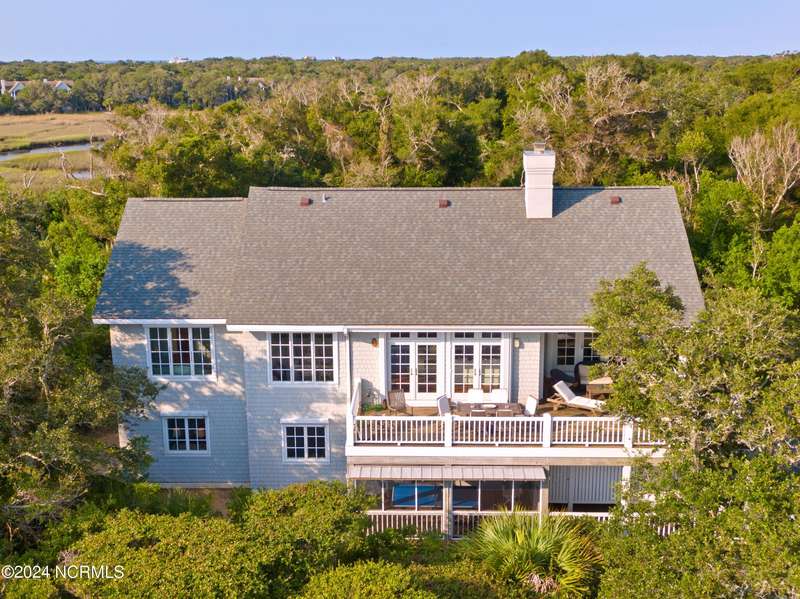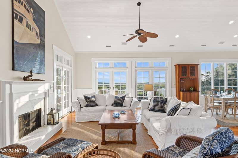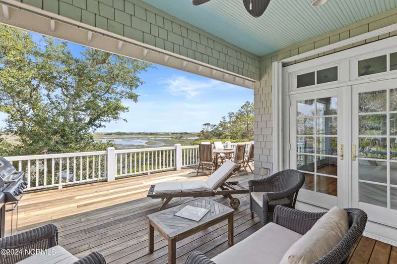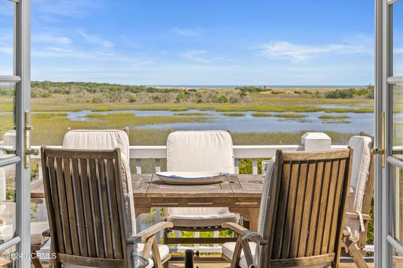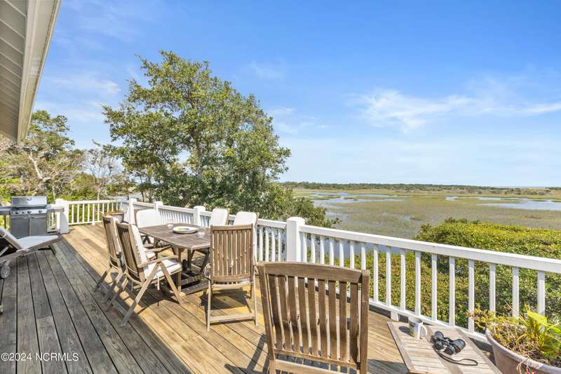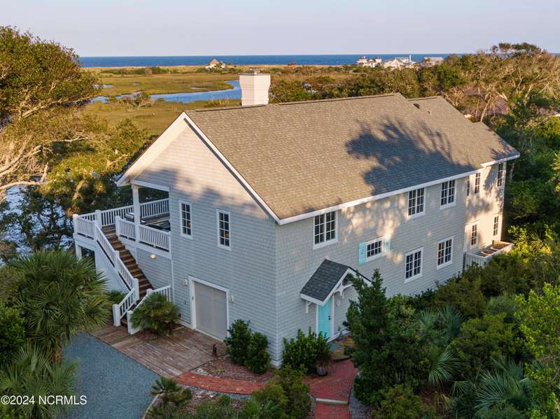 Overlooking Bald Head's estuary, with views of the Atlantic, this 6BR, 6.5BA reverse floorplan's warm hardwoods lead to a comfortable TV/living area across from a dinette. Wake to treats from the nearby coffee station with wet bar and mini fridge. Down the hall, a sunlit Queen suite grants marsh perspectives, accesses a screened porch housing a ping pong table and furnishes an ensuite BA. Next door, a bunk room also bestows BHI Creek scenes and uses the hall bath with tub. Nearby, a large, bright Twin suite, cornered by windows, harbors another full bath. Down the hall, a sundrenched corner Queen suite brings the outdoors in with its three sides of windows and indulges with a private bath. A laundry finishes this level. Upstairs, the natural light-filled, vaulted open floor plan showcases estuary panoramas and ocean vistas through its wall of French doors. The spacious wainscoted living area is anchored by a gas fireplace and opens to both a covered outdoor conversation space and a sunny lounging and dining deck. Savor alfresco meals observing egrets and watching the waves. Or dine at the elegant indoor table with places for ten and four more at the adjacent breakfast bar. The gourmet kitchen boasts yards of granite bar space, butcher block counters, stainless appliances and an oversize walk-in pantry. On each end of this floor is a Primary suite. The first tenders an ante chamber that can be closed off from the bedroom-proffering an additional gathering spot for all or closed to become a private sitting area. This sunlit Primary Queen shares marsh tableaus from three sides and a pampering bath with a sunken tub, benched shower and double vanity. The Primary King spotlights estuary and ocean prospects, accesses the covered deck and has a private full bath. Located on exclusive Middle Island, this well cared for, tastefully appointed sanctuary boasts a great rental history and conveys with three carts. Club memberships are available for separate purchase.