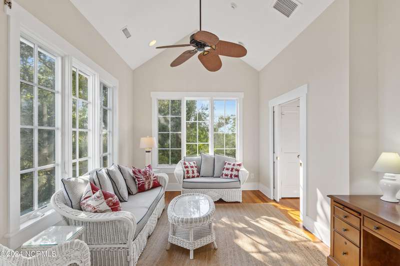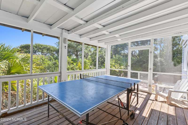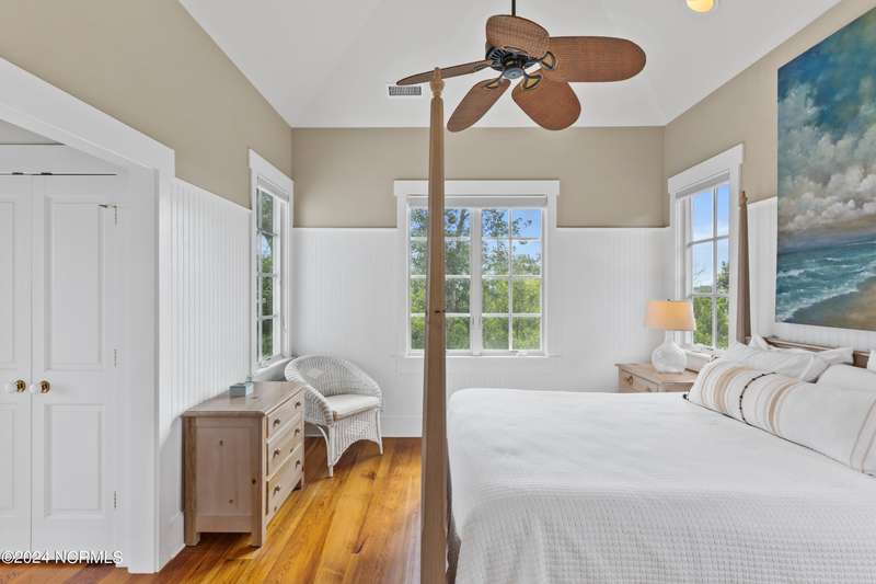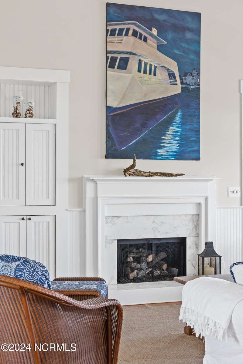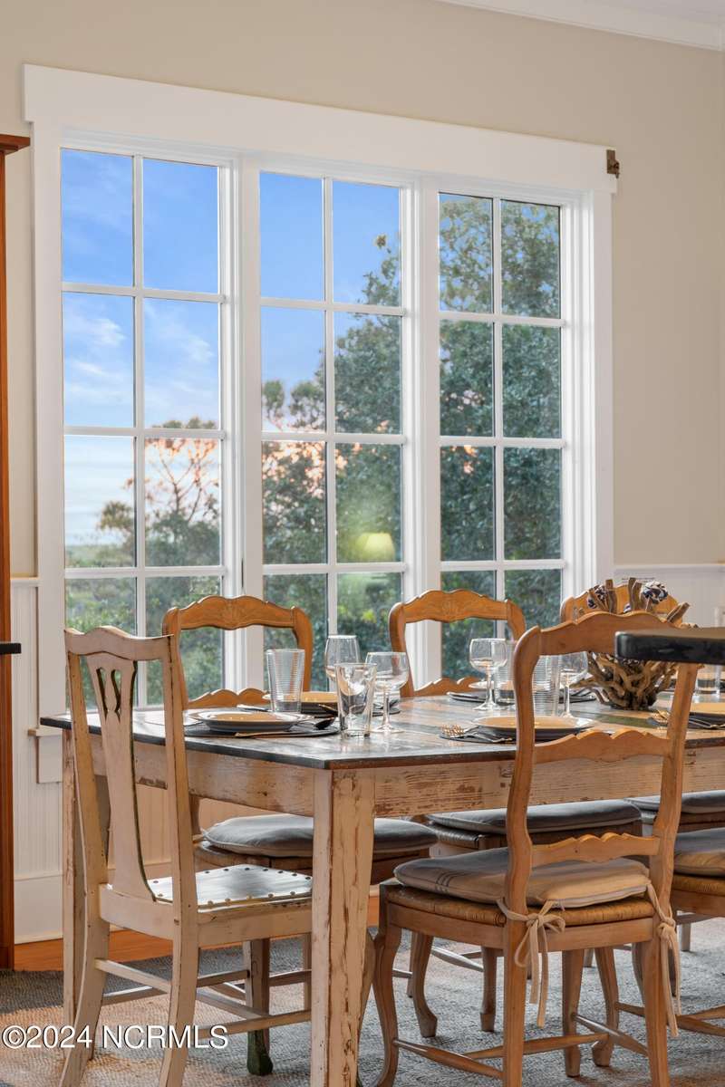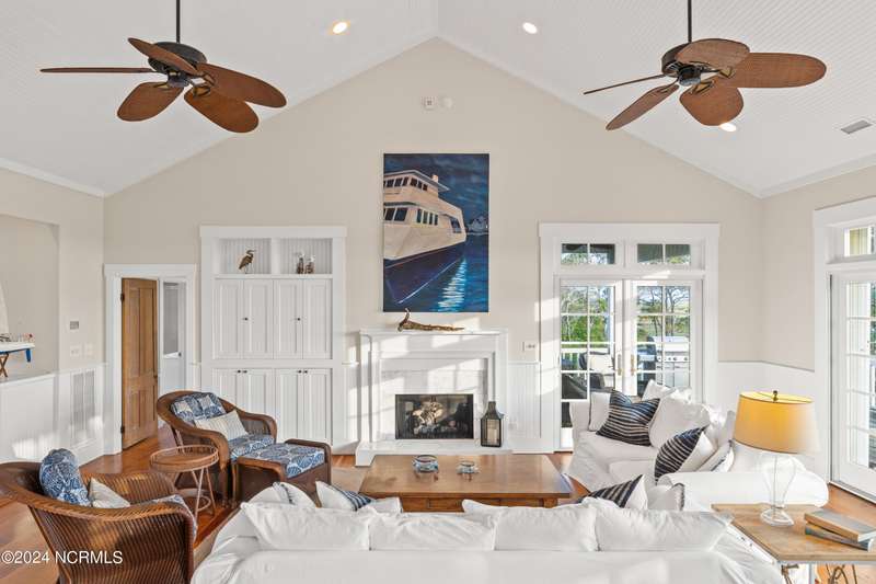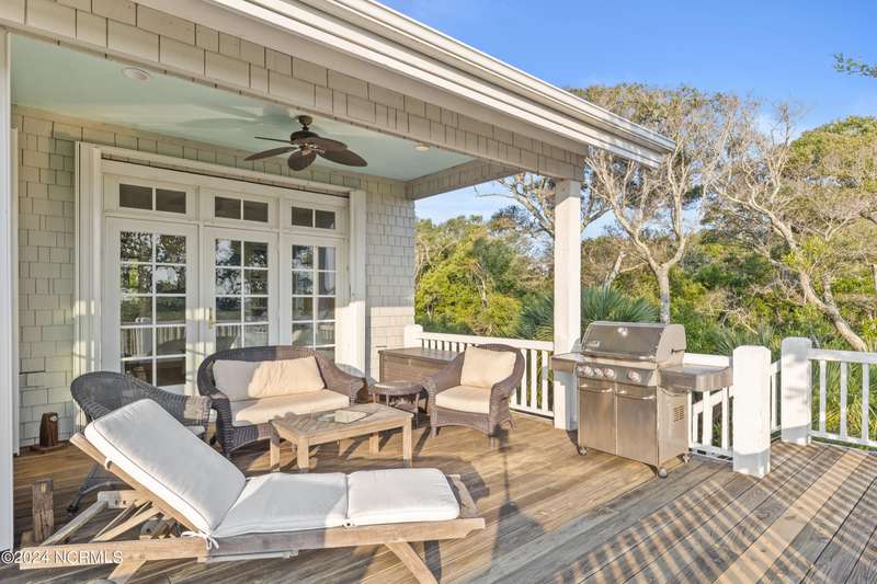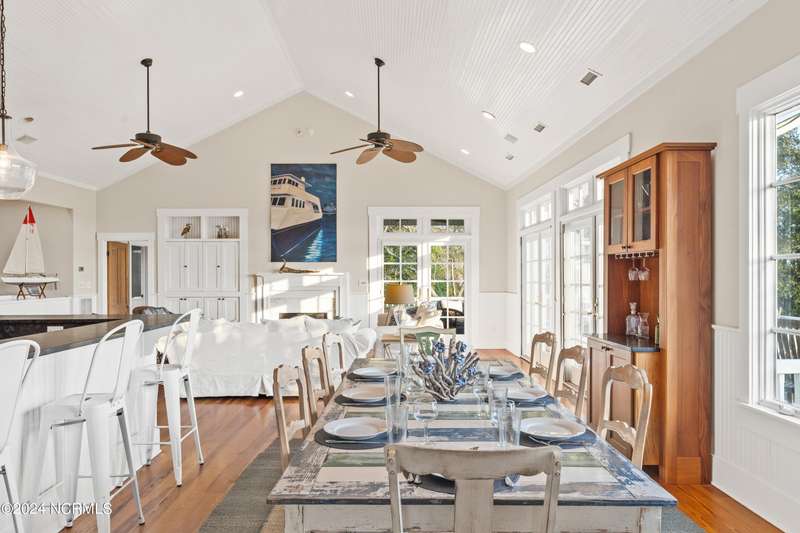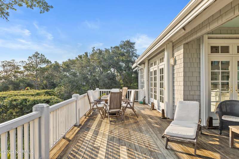 Overlooking Bald Head's estuary, with views of the Atlantic, this 6BR, 6.5BA reverse floorplan's warm hardwoods lead to a comfortable TV/living area across from a dinette. Wake to treats from the nearby coffee station with wet bar and mini fridge. Down the hall, a sunlit Queen suite grants marsh perspectives, accesses a screened porch housing a ping pong table and furnishes an ensuite BA. Next door, a bunk room also bestows BHI Creek scenes and uses the hall bath with tub. Nearby, a large, bright Twin suite, cornered by windows, harbors another full bath. Down the hall, a sundrenched corner Queen suite brings the outdoors in with its three sides of windows and indulges with a private bath. A laundry finishes this level. Upstairs, the natural light-filled, vaulted open floor plan showcases estuary panoramas and ocean vistas through its wall of French doors. The spacious wainscoted living area is anchored by a gas fireplace and opens to both a covered outdoor conversation space and a sunny lounging and dining deck. Savor alfresco meals observing egrets and watching the waves. Or dine at the elegant indoor table with places for ten and four more at the adjacent breakfast bar. The gourmet kitchen boasts yards of granite bar space, butcher block counters, stainless appliances and an oversize walk-in pantry. On each end of this floor is a Primary suite. The first tenders an ante chamber that can be closed off from the bedroom-proffering an additional gathering spot for all or closed to become a private sitting area. This sunlit Primary Queen shares marsh tableaus from three sides and a pampering bath with a sunken tub, benched shower and double vanity. The Primary King spotlights estuary and ocean prospects, accesses the covered deck and has a private full bath. Located on exclusive Middle Island, this well cared for, tastefully appointed sanctuary boasts a great rental history and conveys with three carts. Club memberships are available for separate purchase.