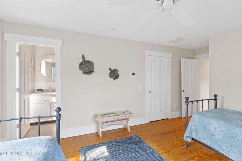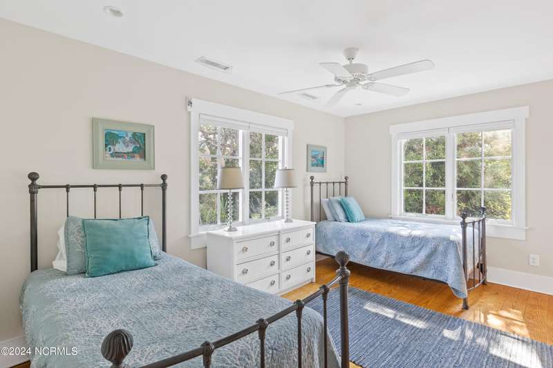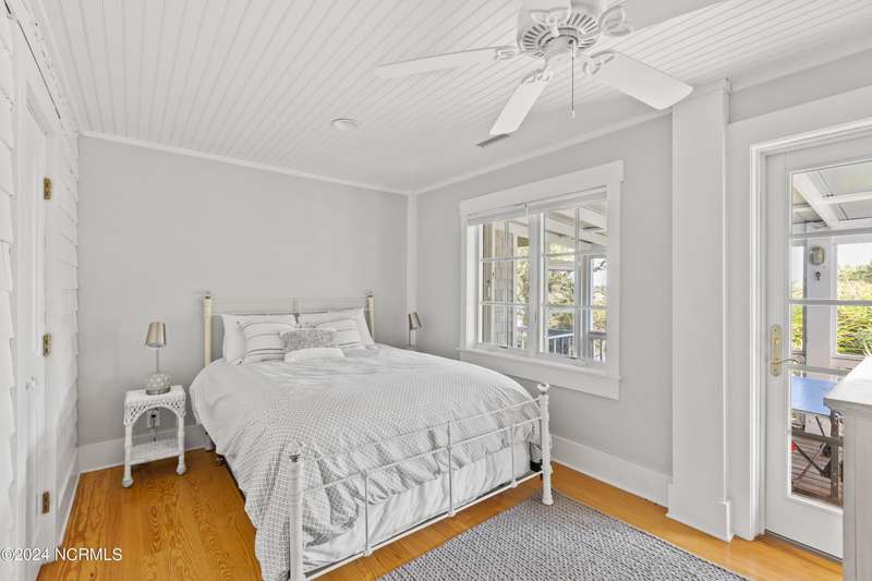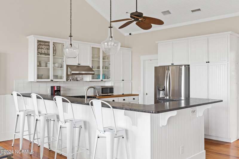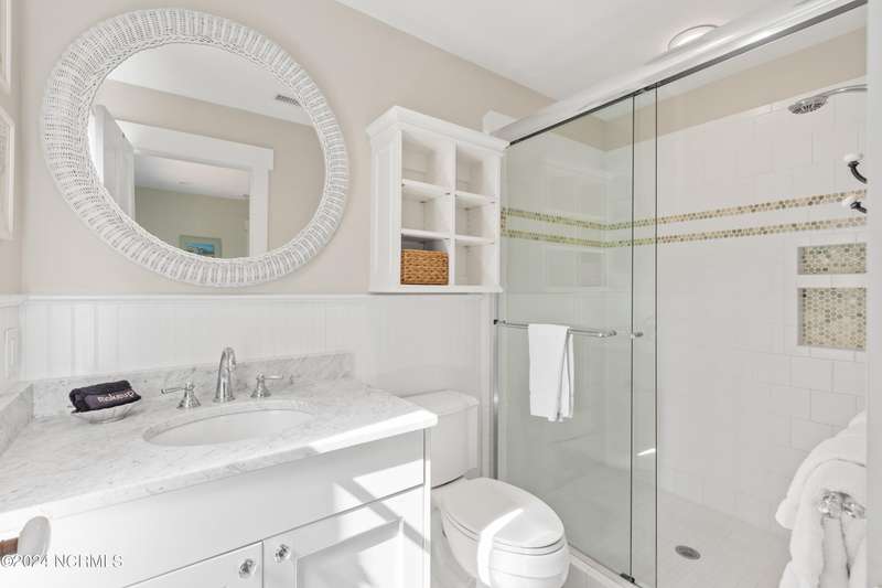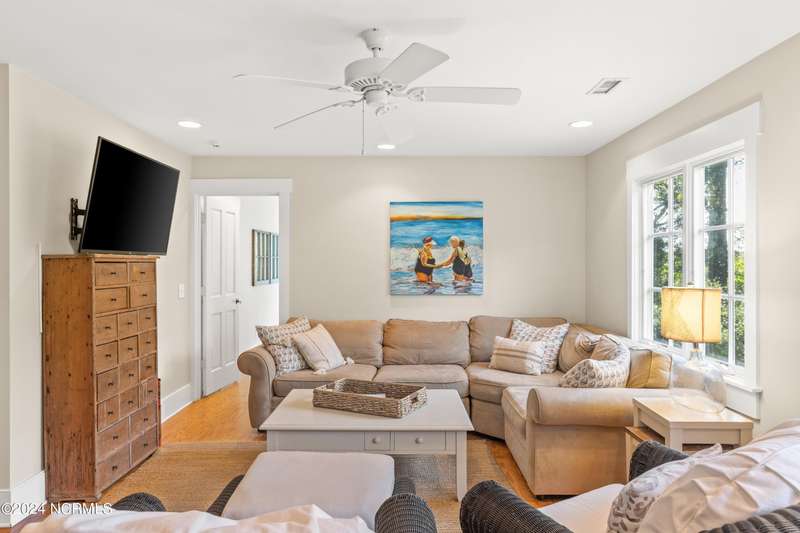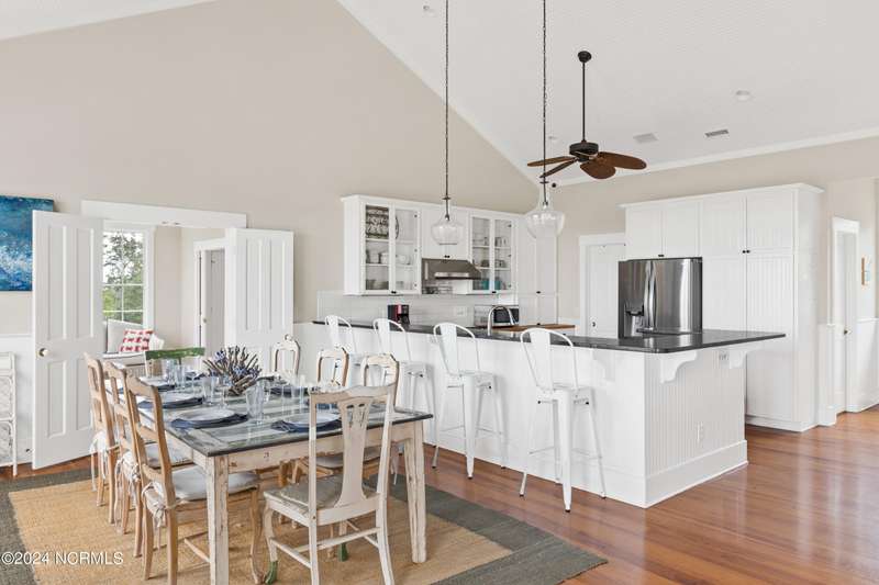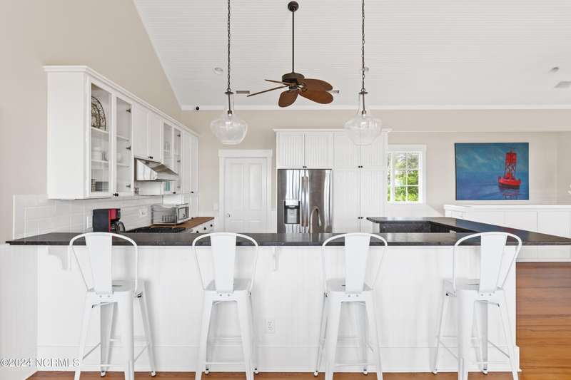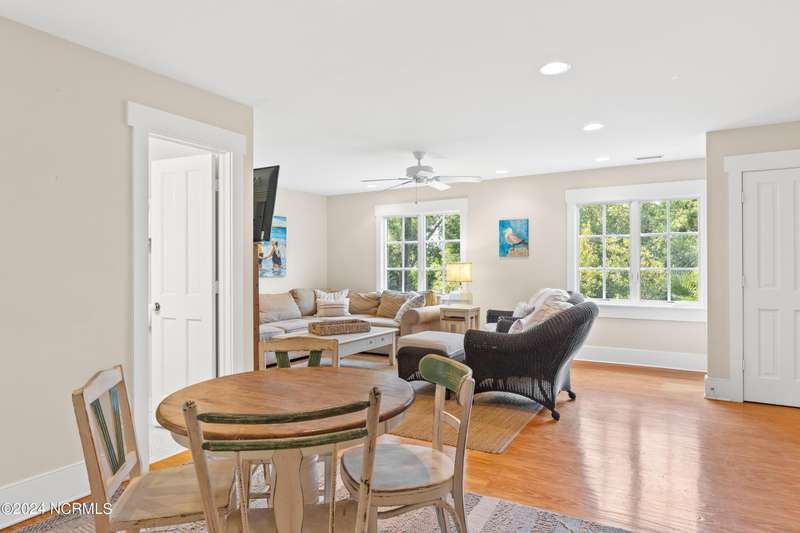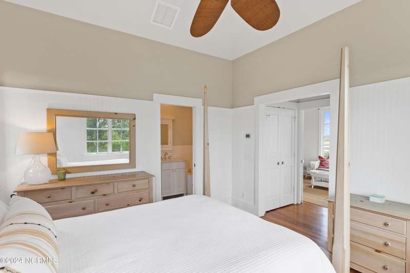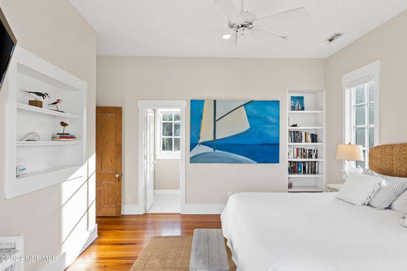 Overlooking Bald Head's estuary, with views of the Atlantic, this 6BR, 6.5BA reverse floorplan's warm hardwoods lead to a comfortable TV/living area across from a dinette. Wake to treats from the nearby coffee station with wet bar and mini fridge. Down the hall, a sunlit Queen suite grants marsh perspectives, accesses a screened porch housing a ping pong table and furnishes an ensuite BA. Next door, a bunk room also bestows BHI Creek scenes and uses the hall bath with tub. Nearby, a large, bright Twin suite, cornered by windows, harbors another full bath. Down the hall, a sundrenched corner Queen suite brings the outdoors in with its three sides of windows and indulges with a private bath. A laundry finishes this level. Upstairs, the natural light-filled, vaulted open floor plan showcases estuary panoramas and ocean vistas through its wall of French doors. The spacious wainscoted living area is anchored by a gas fireplace and opens to both a covered outdoor conversation space and a sunny lounging and dining deck. Savor alfresco meals observing egrets and watching the waves. Or dine at the elegant indoor table with places for ten and four more at the adjacent breakfast bar. The gourmet kitchen boasts yards of granite bar space, butcher block counters, stainless appliances and an oversize walk-in pantry. On each end of this floor is a Primary suite. The first tenders an ante chamber that can be closed off from the bedroom-proffering an additional gathering spot for all or closed to become a private sitting area. This sunlit Primary Queen shares marsh tableaus from three sides and a pampering bath with a sunken tub, benched shower and double vanity. The Primary King spotlights estuary and ocean prospects, accesses the covered deck and has a private full bath. Located on exclusive Middle Island, this well cared for, tastefully appointed sanctuary boasts a great rental history and conveys with three carts. Club memberships are available for separate purchase.