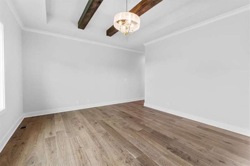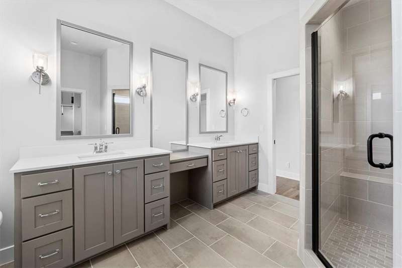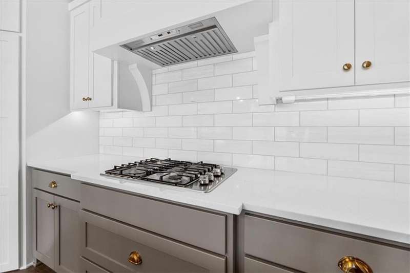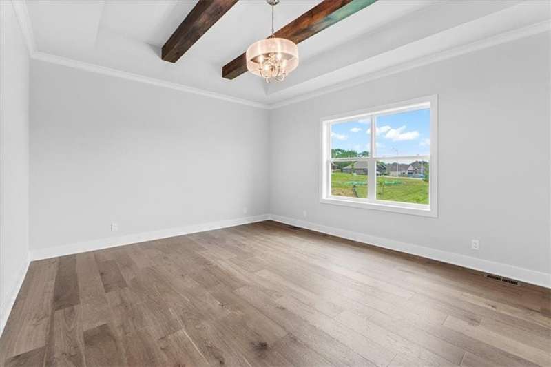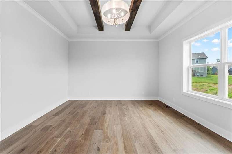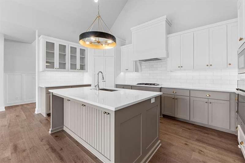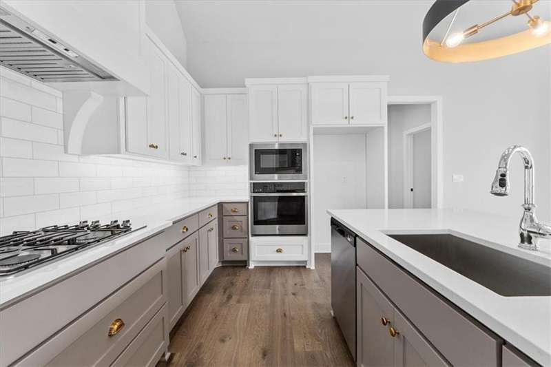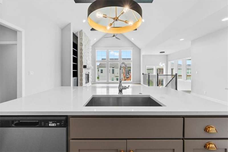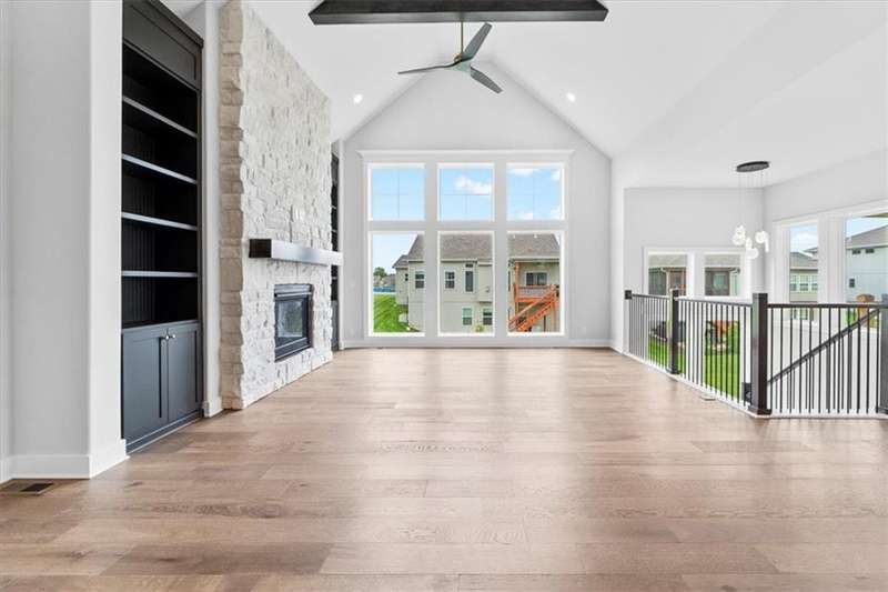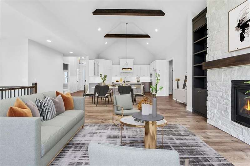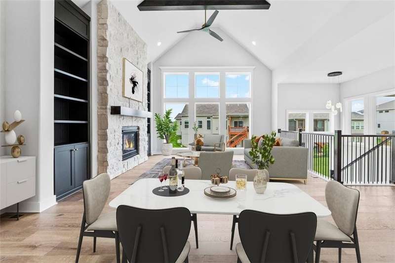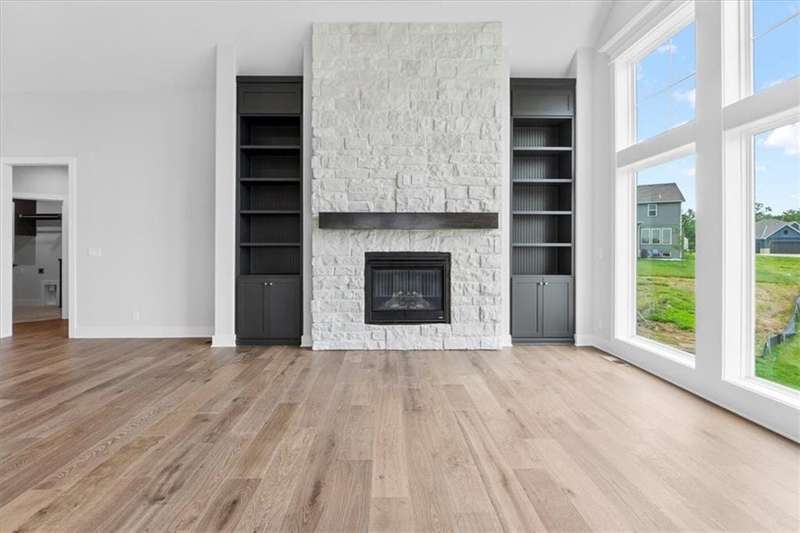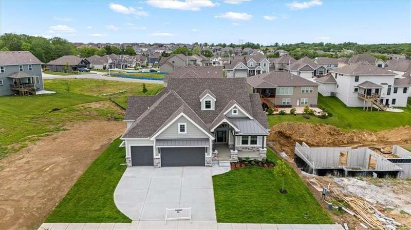 The Santa Barbara by SAB Homes is a thoughtfully designed ranch plan that blends everyday functionality with upscale finishes. The vaulted great room, anchored by a striking stone fireplace with built-in shelving, is filled with natural light and flows seamlessly into the kitchen and dining area - ideal for hosting or unwinding. A covered deck expands the living space outdoors. The kitchen is a chefs dream, featuring under-cabinet lighting, concealed outlets, a walk-in pantry, and a 5-piece stainless appliance package. Tucked privately at the rear of the home, the primary bedroom boasts an impressive boxed beam ceiling and wood floors. The ensuite includes a freestanding tub, fully tiled walk-in shower, dual-sink vanity, and a large walk-in closet. Designed with function in mind, the closet includes pull-down hanging rods to take full advantage of the tall ceilings and maximize storage space. Two additional bedrooms, a full bath, and a laundry room with built-ins complete the main level. The unfinished lower level offers an additional 1,224 sq ft of future potential, including space for two more bedroomseach with private vanities and walk-in closetsa shared bath, a half bath, rec room, wet bar, and ample storage. This home is finished and move-in readyschedule your showing today! Benson Place residents enjoy an abundance of amenities including two community swimming pools, a childrens splash park, a fishing lake, a playground, ample green space, and scenic nature trails. Close proximity to major highways and interstates allows for easy access to downtown Kansas City, the new Kansas City International Airport and several of the areas top shopping and entertainment centers.