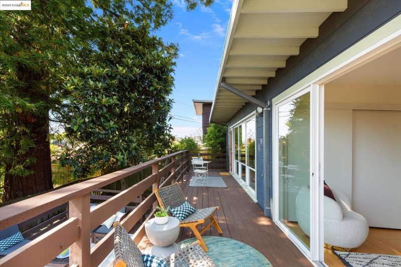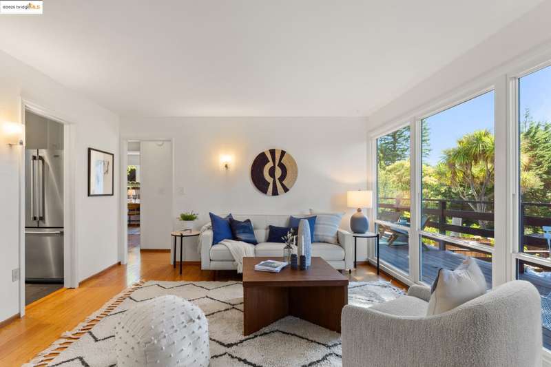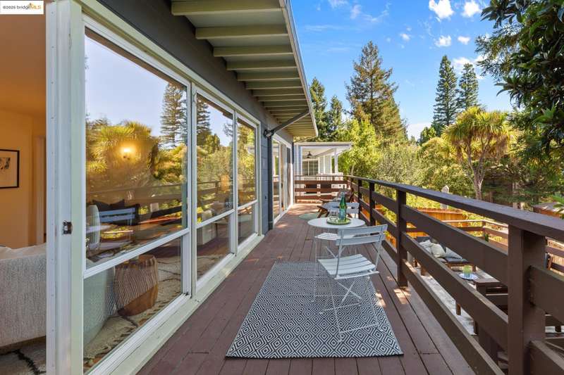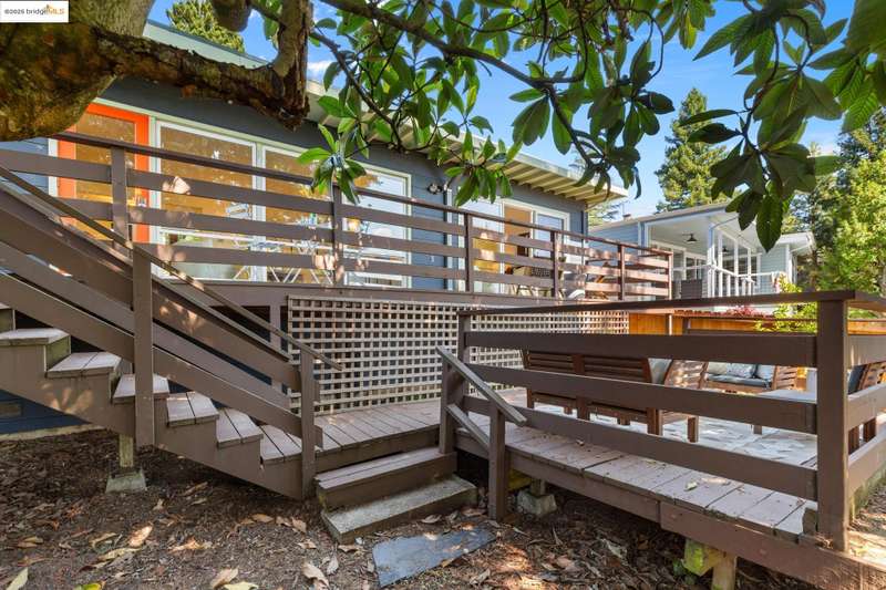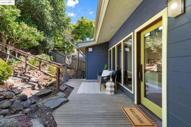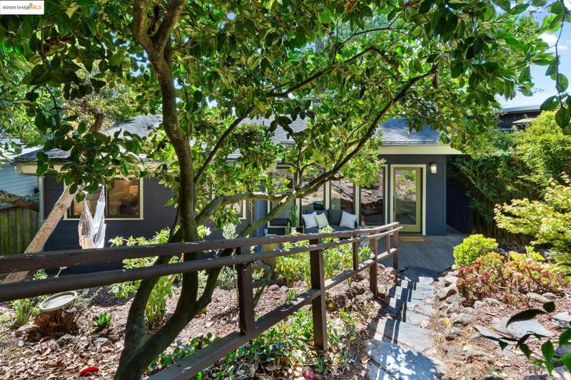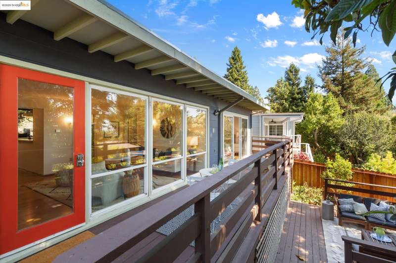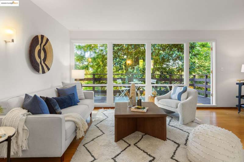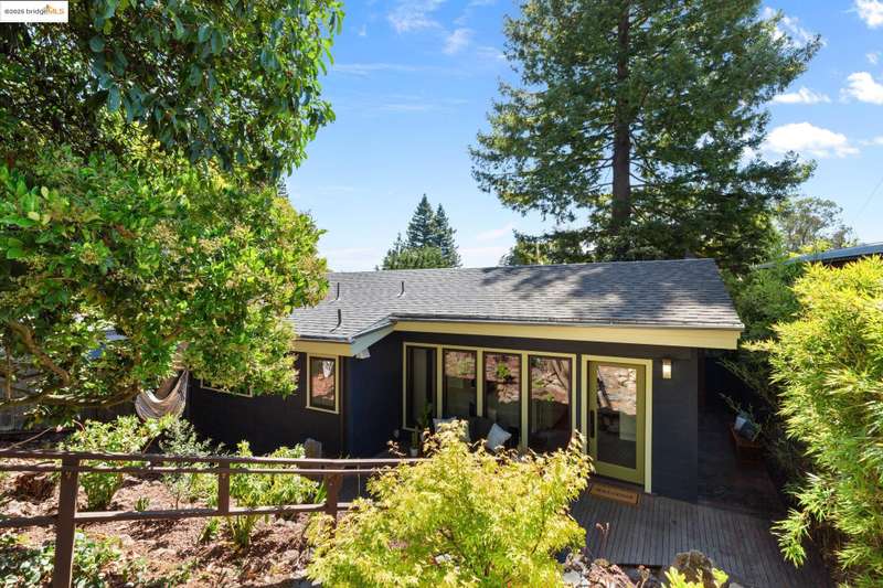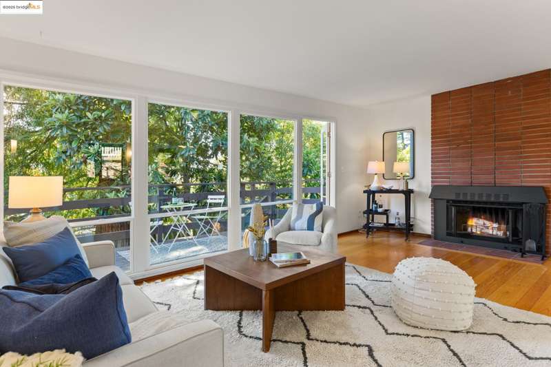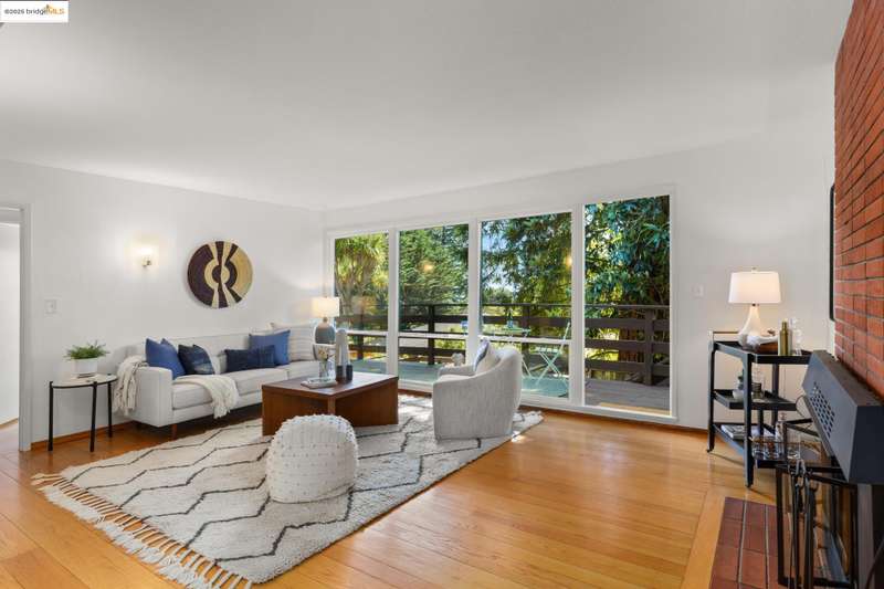 Serene mid-century oasis in the Berkeley Hills! Flooded with light from floor-to-ceiling windows, this airy 3BR/2BA lovingly updated and maintained home features an open floor plan, high ceilings, hardwood floors, a fireplace, and brand-new designer kitchen and bath remodels. Expansive tiered decks under mature foliage and fruit trees offer seamless indoor-outdoor flow, filtered Bay views, and a hot tub retreat. With a 2-car garage, abundant storage, and a private verdant setting, this is Berkeley Hills living at its best. Unbeatable location near parks, schools + top commuter routes, this extraordinary property is a private sanctuary!