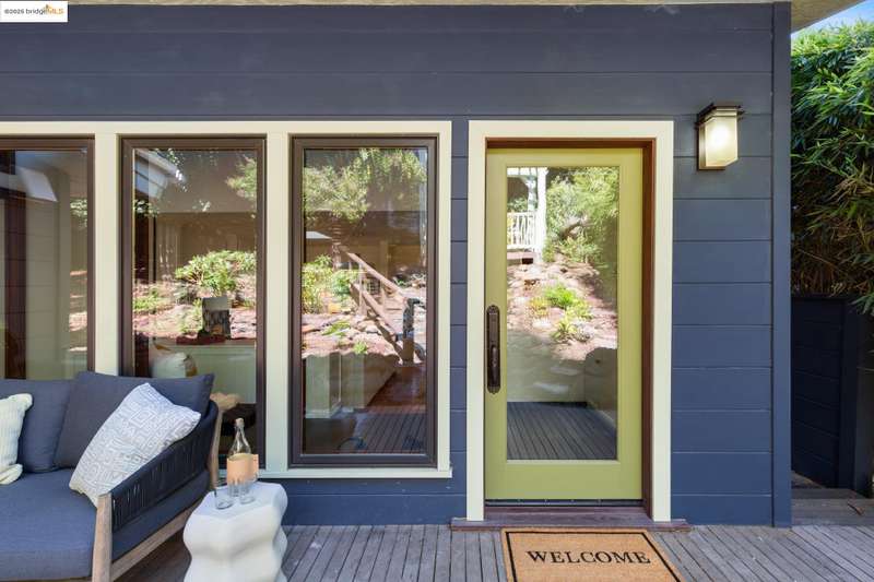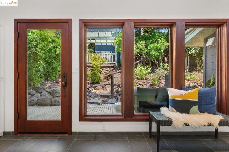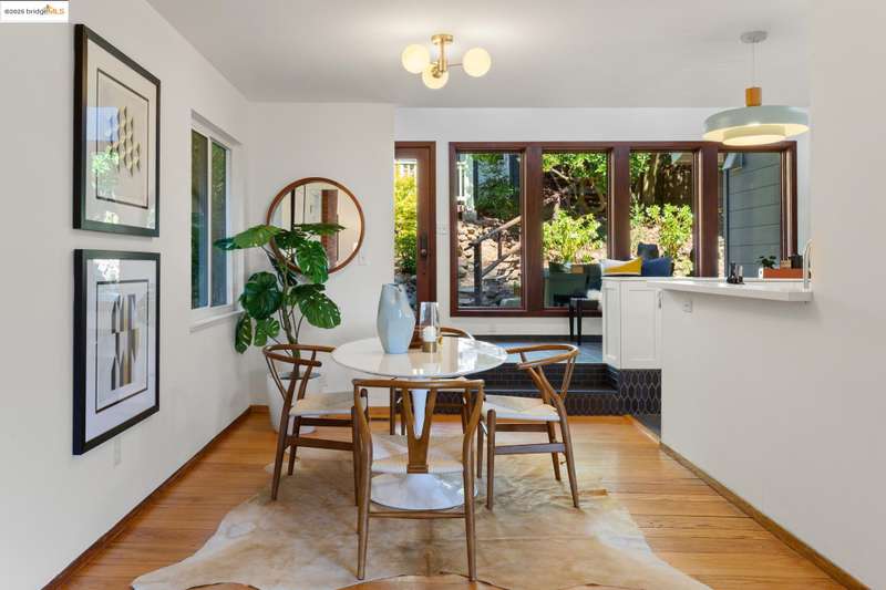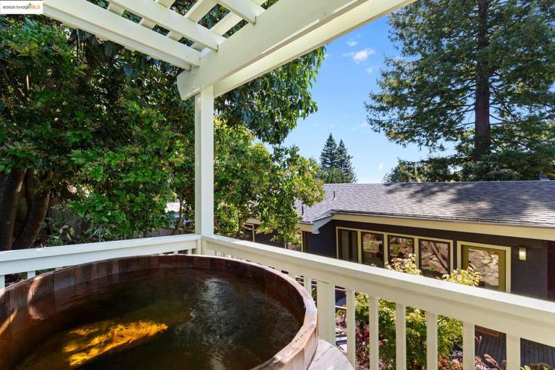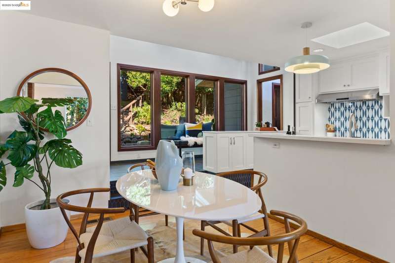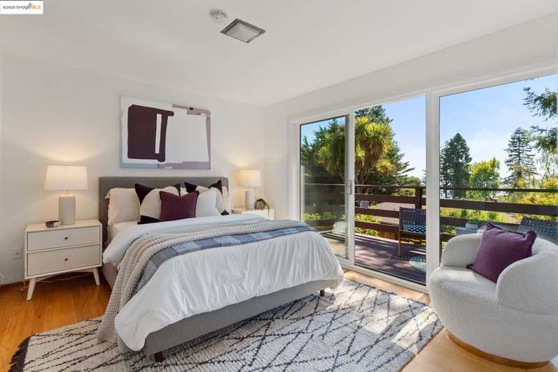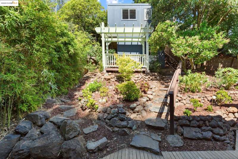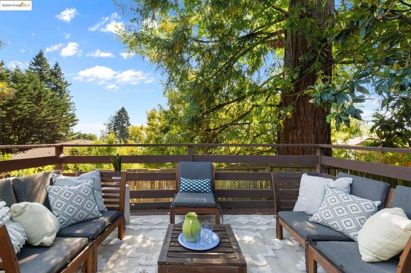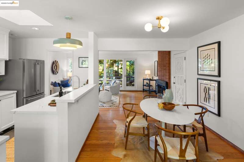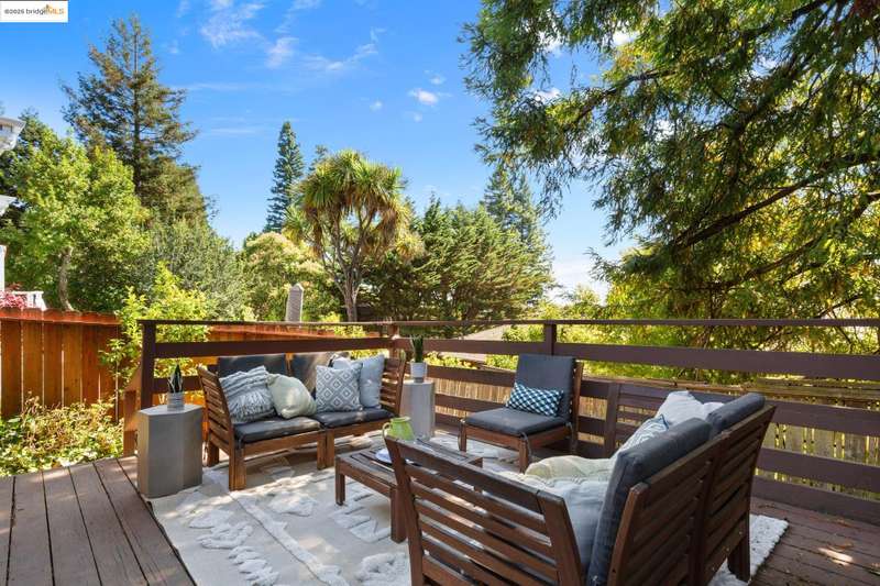 Serene mid-century oasis in the Berkeley Hills! Flooded with light from floor-to-ceiling windows, this airy 3BR/2BA lovingly updated and maintained home features an open floor plan, high ceilings, hardwood floors, a fireplace, and brand-new designer kitchen and bath remodels. Expansive tiered decks under mature foliage and fruit trees offer seamless indoor-outdoor flow, filtered Bay views, and a hot tub retreat. With a 2-car garage, abundant storage, and a private verdant setting, this is Berkeley Hills living at its best. Unbeatable location near parks, schools + top commuter routes, this extraordinary property is a private sanctuary!