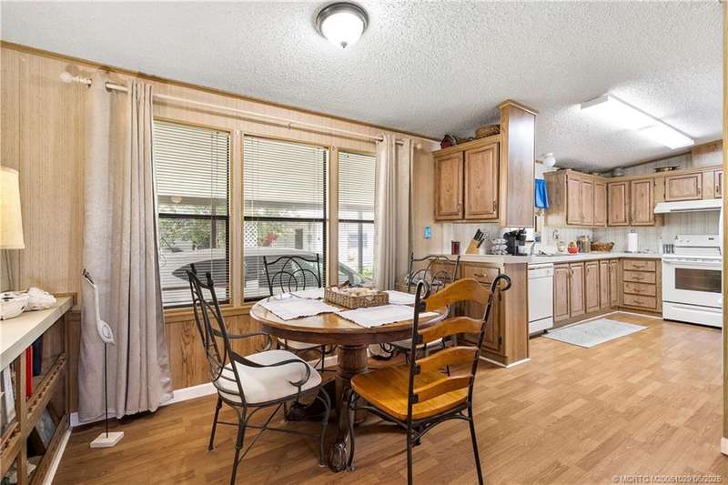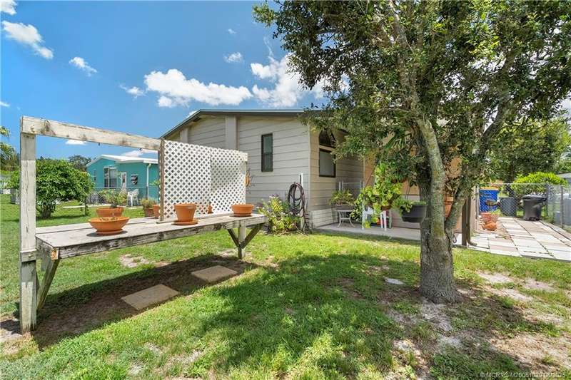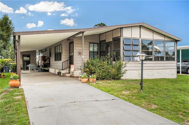 You own the land! Beautiful home in the highly desirable, 55+ St. Lucie Falls community. This home has a large, enclosed Florida Room with a southern exposure. 2 bedrooms and 2 full baths. Plenty of storage space including two separate closets in the primary bedroom. Newer refrigerator and washer and dryer. The roof was replaced in 2020 with a metal roof. Vinyl flooring throughout. Oversized utility shed and carport. The carport allows for 1 covered parking space. The community has 2 clubhouses with heated pools, tennis courts, shuffleboard, bocci ball. RV/boat storage available, first come, first served for small monthly fee. 2 pets allowed. Very popular area convenient to shopping, I-95 and more. Professional Pics coming soon.