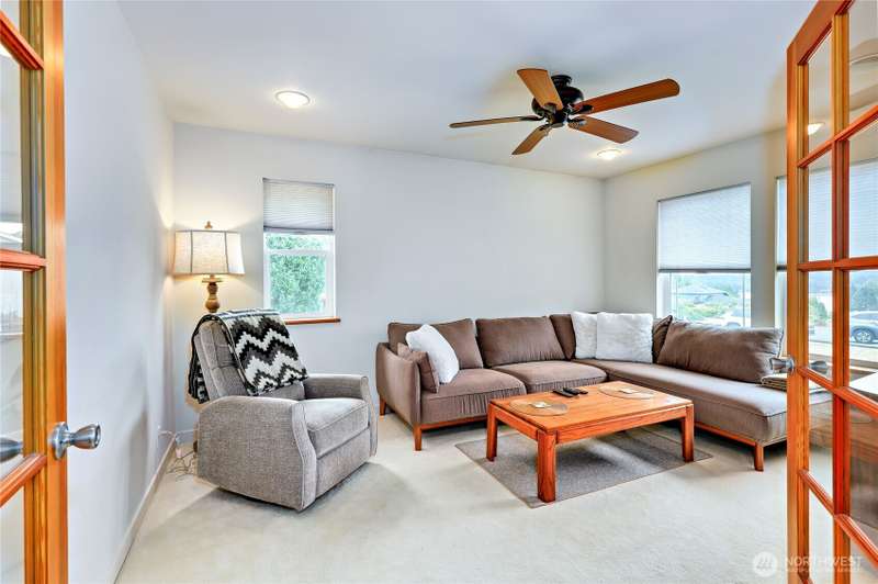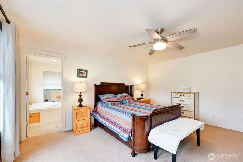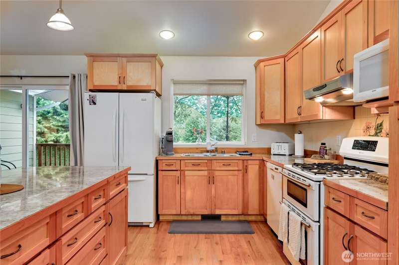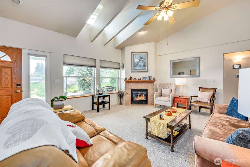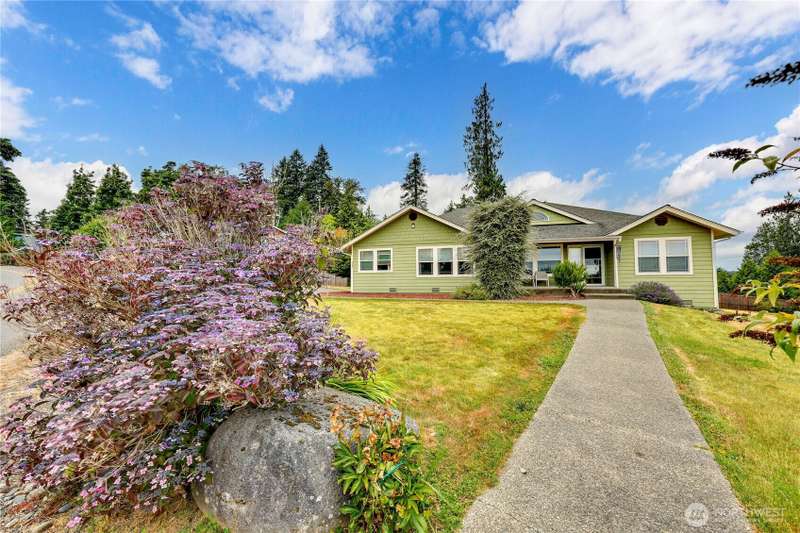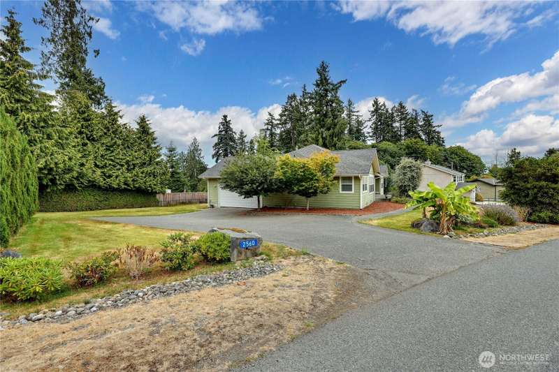 Quietly located this single level, well maintained home, sitting perfectly on .52 acres. Enjoy your mornings from your front deck, watching the amazing sunrises, with view of the water and the mountains. Oversized garage, yellow cedar back deck, partially fenced yard, with new furnace with A/C. Great open floorplan, ceiling fans, vaulted ceilings, allowing natural lighting in. Spacious living room with propane fireplace, beautiful eat in kitchen with double oven, French doors and lots of storage. Primary bedroom with walk in closest, 5-piece bathroom, including jetted tub, and separate shower with dual shower heads. Two additional bedrooms, currently the homeowner uses one of the rooms as den. Close to base, schools and ferries.