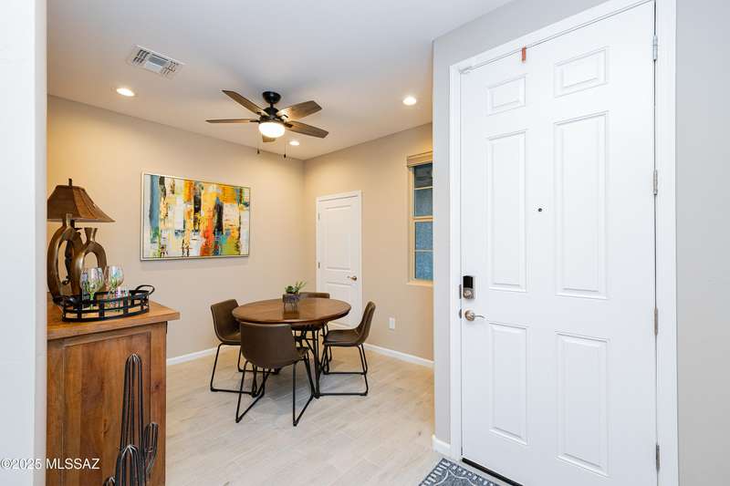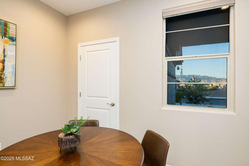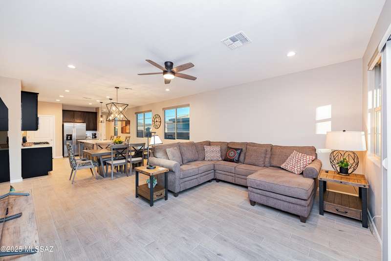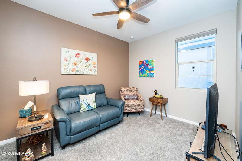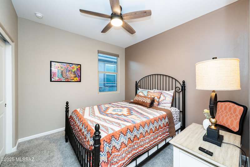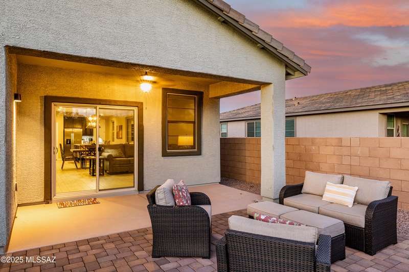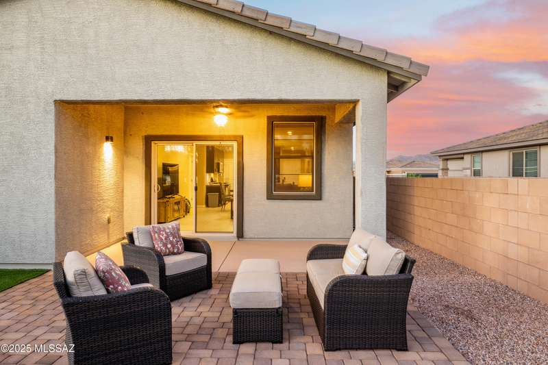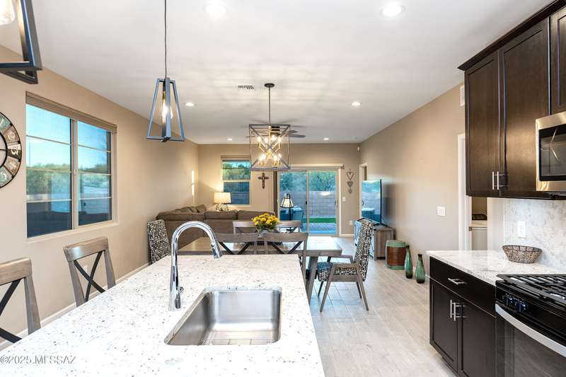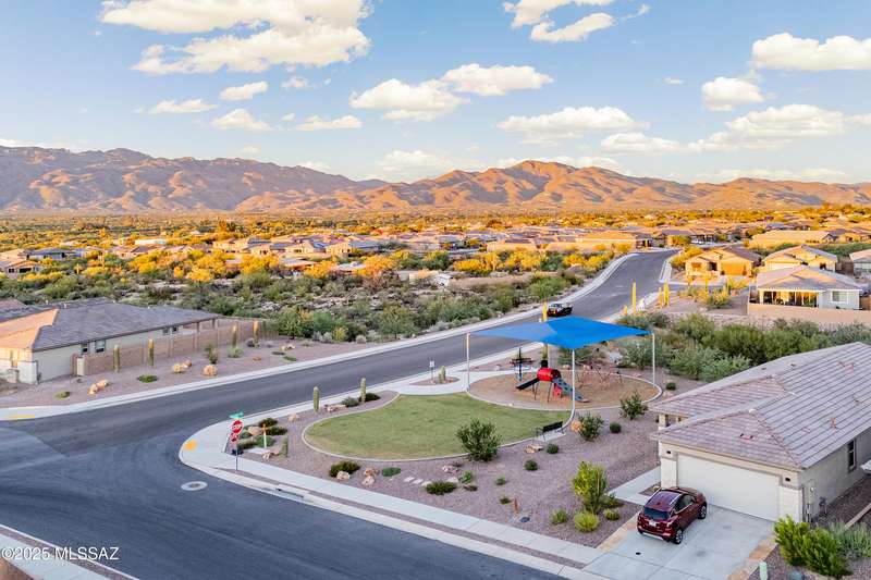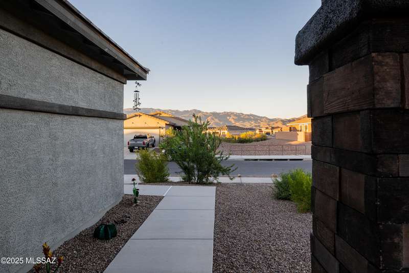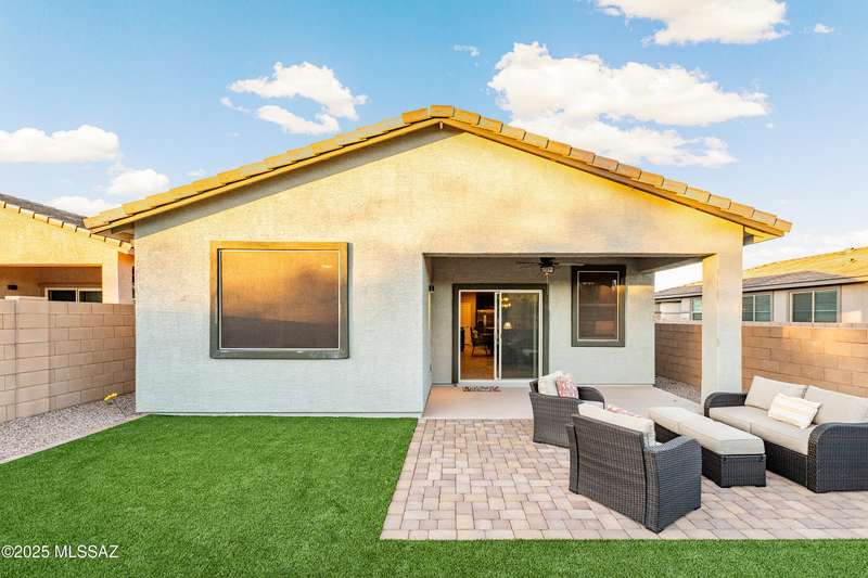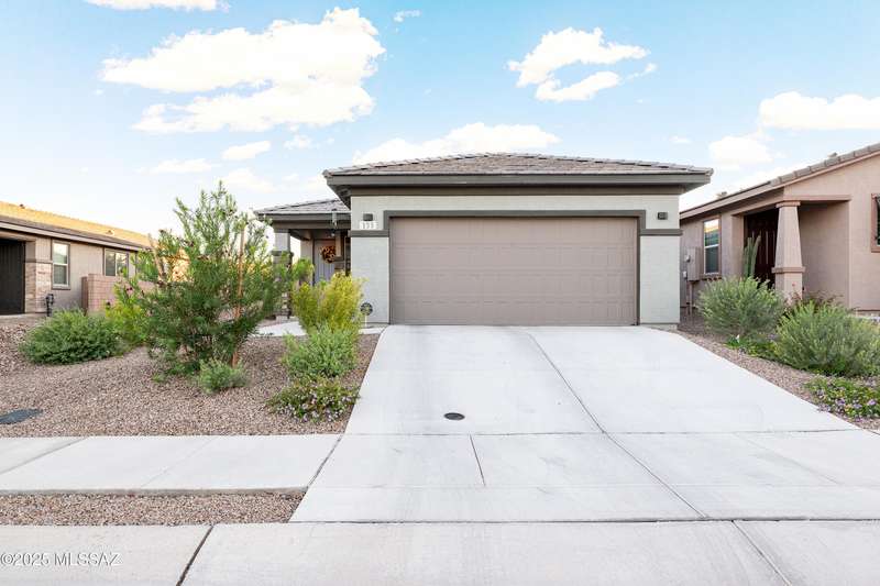 You know what is not often found in a nearly new home? Additional upgrades like these: a beautifully finished rear yard featuring artificial turf, pavers and decorative gravel, high-quality electric window coverings, a water softener, epoxied garage floors and ceiling racks, solar screens, fans in every room and welcoming neutral paint throughout. The sellers have invested over $38k after purchasing and it's your opportunity to enjoy the benefits!Located in the serene, gated eastside community of Houghton Reserve, this 3-bedroom + den, 2-bath home offers 1,602 sq ft of thoughtfully designed space on a premium lot bordering open desert and common area. Enjoy sweeping Catalina Mountain views from your front porch and peaceful desert vistas from the back. Inside, you'll find quartz