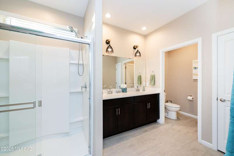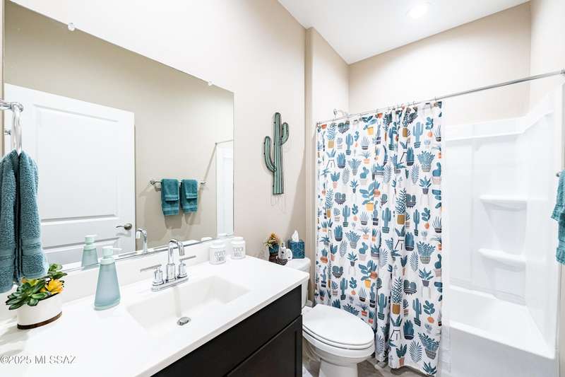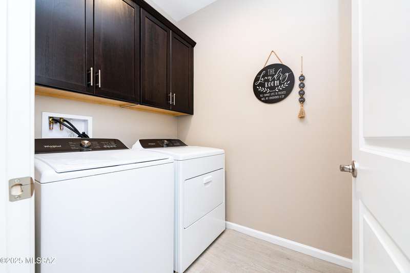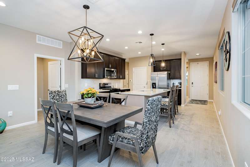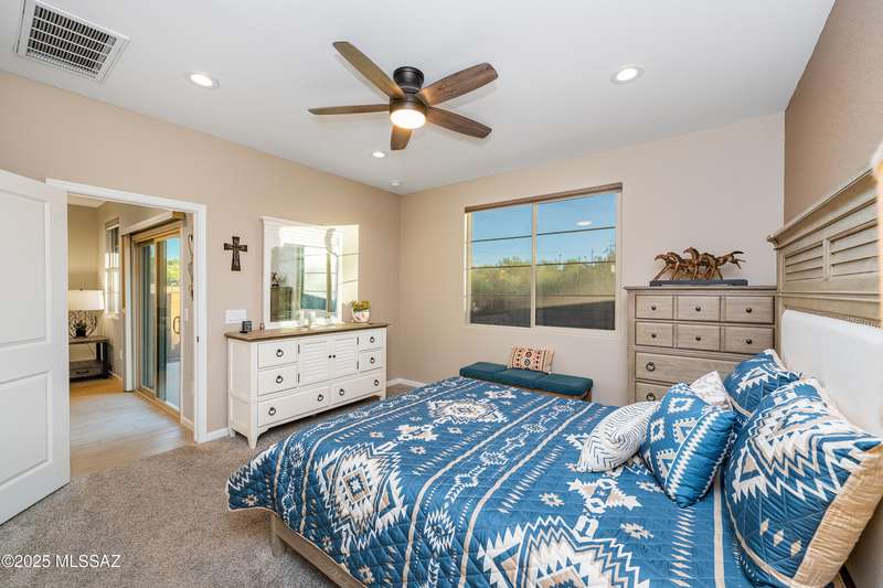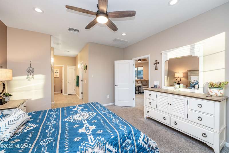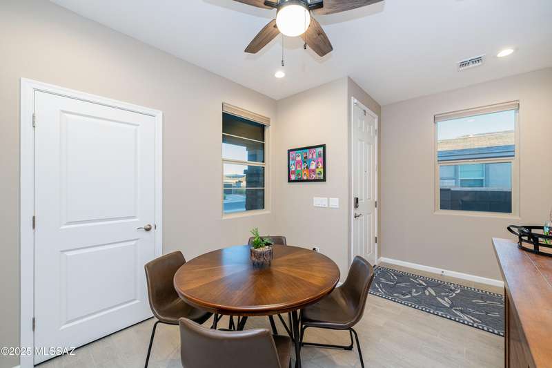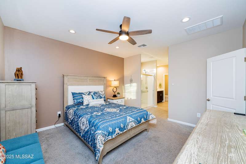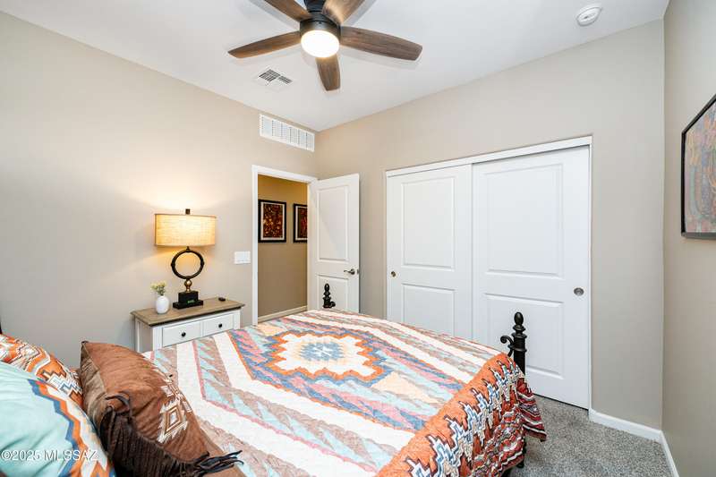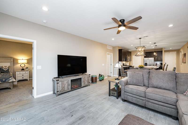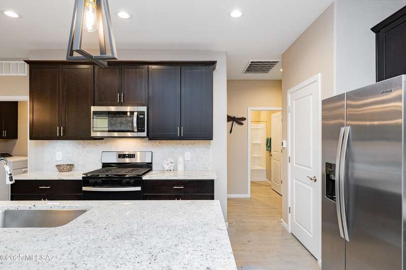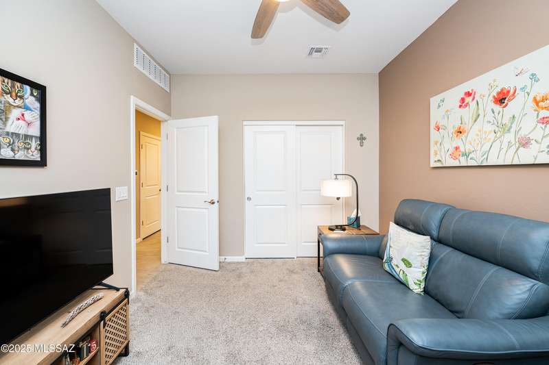 You know what is not often found in a nearly new home? Additional upgrades like these: a beautifully finished rear yard featuring artificial turf, pavers and decorative gravel, high-quality electric window coverings, a water softener, epoxied garage floors and ceiling racks, solar screens, fans in every room and welcoming neutral paint throughout. The sellers have invested over $38k after purchasing and it's your opportunity to enjoy the benefits!Located in the serene, gated eastside community of Houghton Reserve, this 3-bedroom + den, 2-bath home offers 1,602 sq ft of thoughtfully designed space on a premium lot bordering open desert and common area. Enjoy sweeping Catalina Mountain views from your front porch and peaceful desert vistas from the back. Inside, you'll find quartz