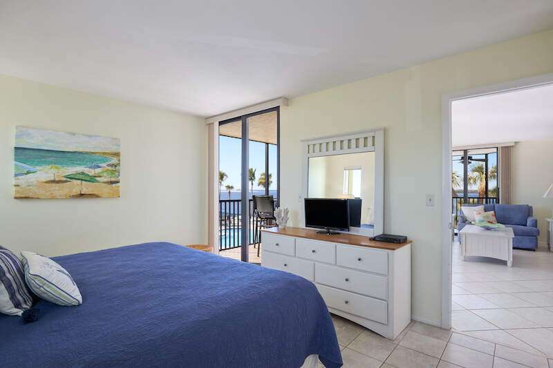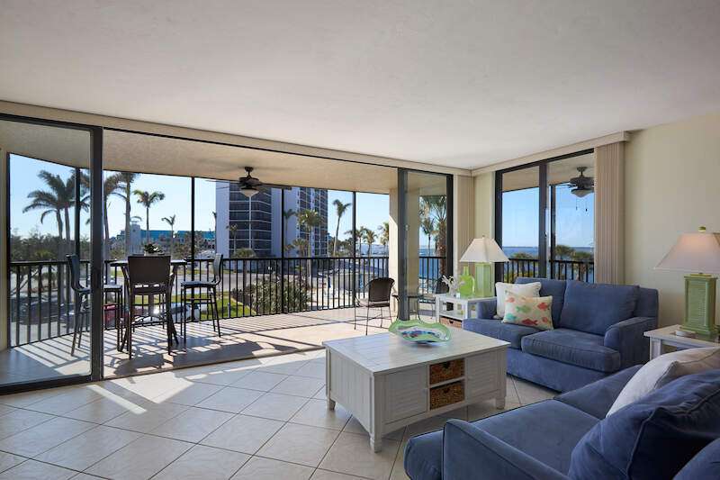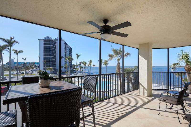 TURNKEY - BAYFRONT - CORNER UNIT! Life is a VACATION at this Coastal theme condo is available in the highly sought after Sanibel Harbour Towers. The 2nd floor 2bedroom, 2 bath, corner, end unit boast spectacular Bay, Gulf and pool views from the wrap around screened balcony. Upgrades this condo offers include New Hurricane Windows in 2024, 2024 Washer / Dryer and AC system, solid surface counter tops in kitchen, and remodeled master bath. Natural light and large tile floors flow throughout this condo. The kitchen is bright with white cabinetry and stainless steel appliances. Sanibel Harbour Towers offers resort style living with its own beautiful pool or walk next door to the Marriott and enjoy several restaurants and bars! Marriott also offers a discounted membership to Sanibel Harbour Towers owners so you can enjoy their Spa & Fitness facilities, Tennis courts and indoor Pool! If you are looking for a great rental income opportunity look no further! High rental income history!