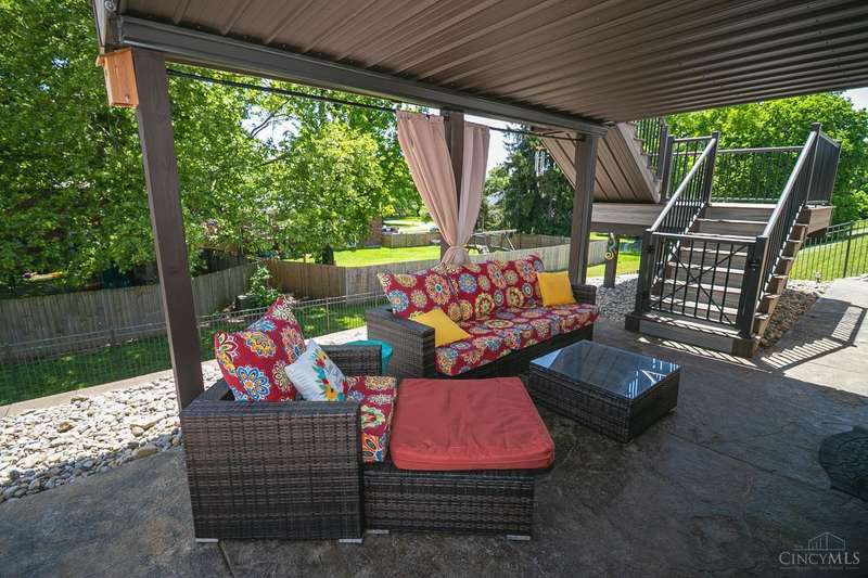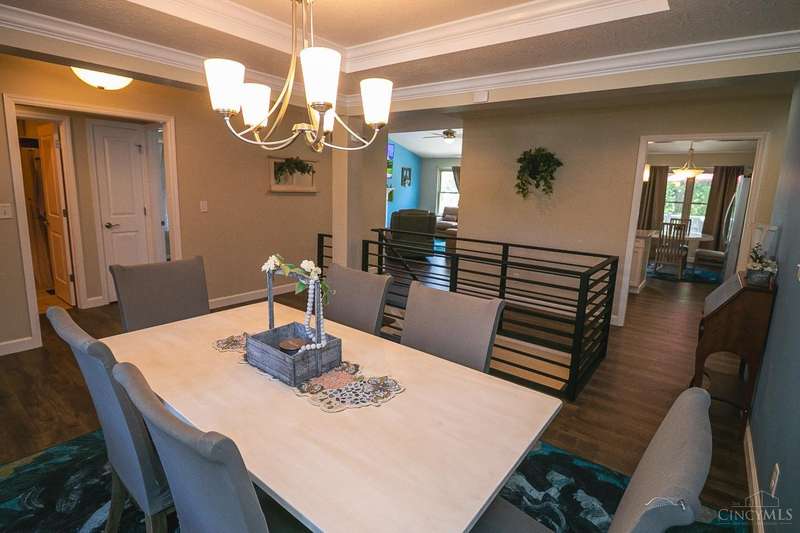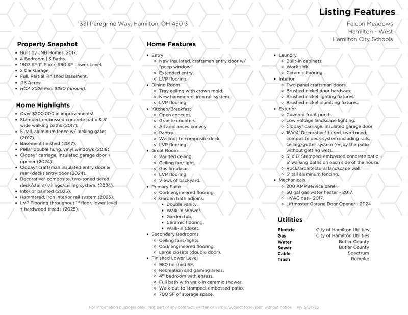 Celebrate the holidays in YOUR new home! Ample space to host friends & family this season! Full of amenities and upgrades throughout. Exceptional main floor living design. Three split bedrooms on the primary floor incl Main Suite w/ Garden Bath and additional bedroom with full bath in the walkout, finished lower level. True 4 bedrooms/3 full baths offering ~2,700 finished SF. From hammered iron railings, open concept Kitchen/Great Room w/ granite counters, vaulted ceiling, neutral color palette to the hardwood look of luxury flooring. 1st floor laundry w/ built-in sink & cabinets. Two-tone, composite deck overlooking the expansive stamped patio (w/ 5' walkways up each side of the house). 5' aluminum fence encases the rear/side yards. Enhanced landscape lighting, upgraded Pella double hung windows, insulated carriage garage door, newer entry doors + more. Close proximity to Hamilton's offerings!