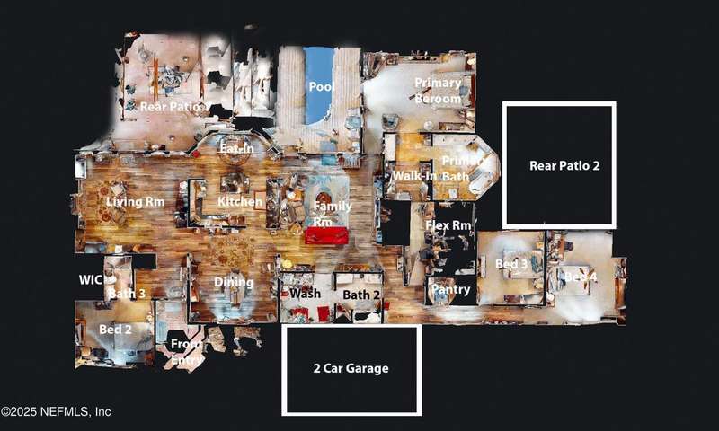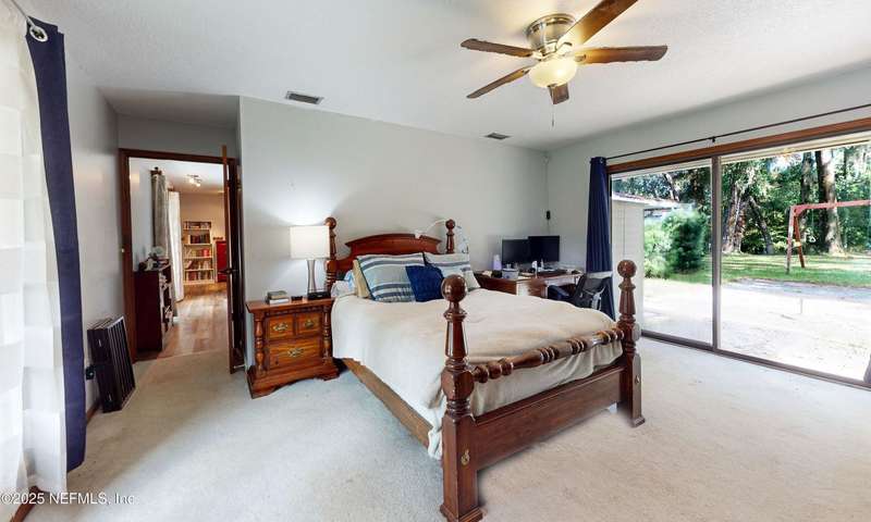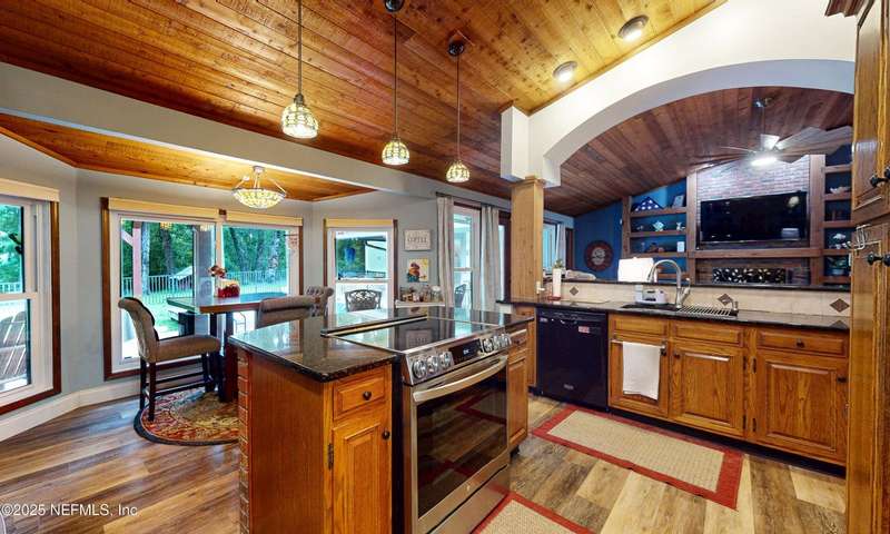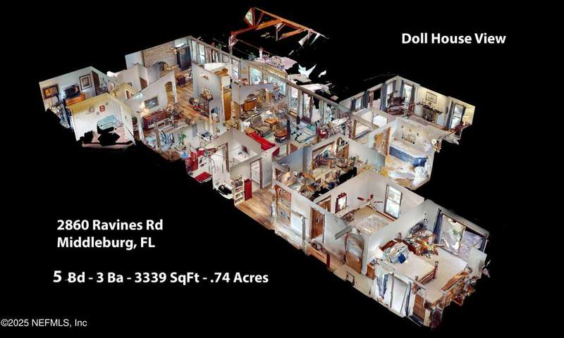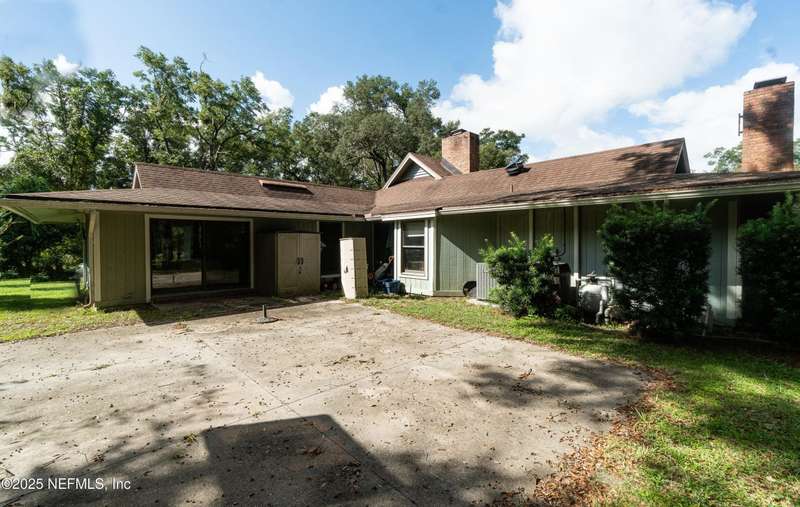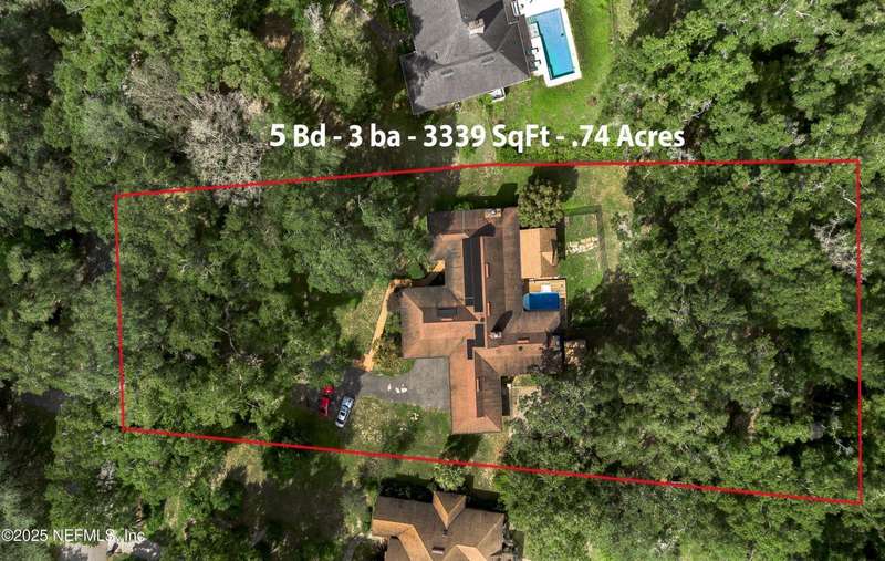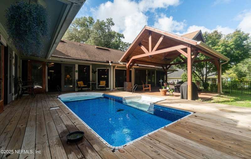 POOL HOME, 3/4 ACRE ESTATE LOT- This cozy 5-bedroom, 3-bath home has plenty of room to spread out, with multiple living areas that are perfect for a growing family or multigenerational living. It's definitely not your typical cookie-cutter house-this one's full of character! Think tongue-and-groove ceilings, built-ins, & 3 fireplaces that give it a warm, mountain-lodge vibe.The bedrooms are thoughtfully laid out in a 3-way split, making it easy for everyone to have their own space. Storage won't be a problem either, with walk-in closets, linen closets, a large laundry room, & a 2-car garage.Step outside & enjoy the peaceful nature views, take a dip in the pool, cookout under the covered patio, or shoot some hoops in the backyard. It's the kind of outdoor space that makes you want to spend all day outside. Recent updates include: 80-gallon solar water heater & solar panels installed in 2022, windows, pool liner replaced 2023, 2 HVAC systems one replaced 2023. Septic pumped 2024.