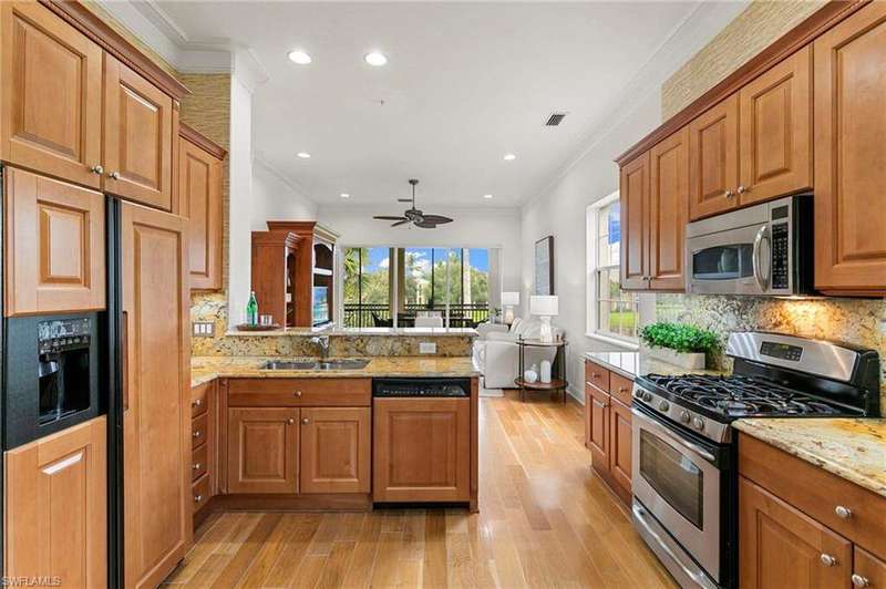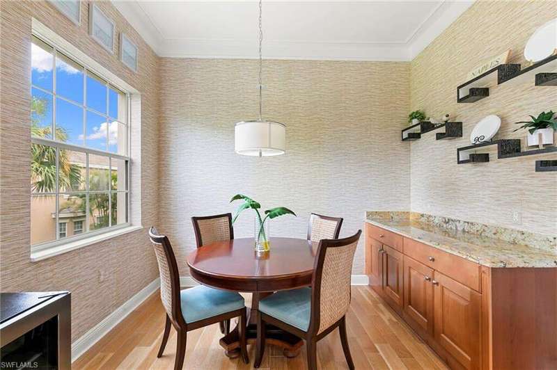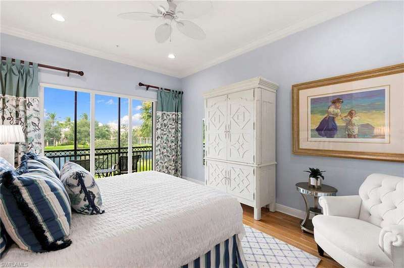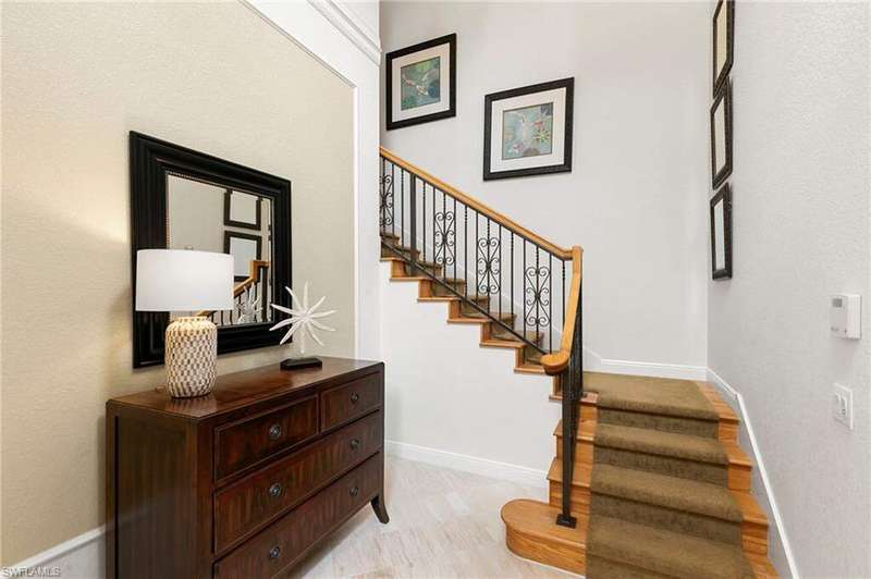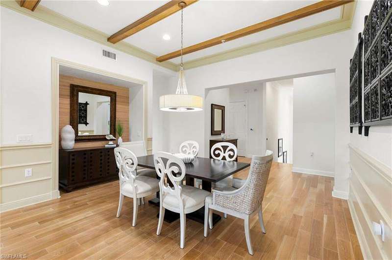 Discover refined living in this beautifully appointed three-bedroom, three-and-a-half-bath end unit, ideally located on the second floor and offering sweeping lake views along with access to exceptional community amenities. This former model has been impeccably cared for and is move-in ready, boasting a variety of high-end upgrades such as a recently installed roof, elegant marble flooring in the entryway, quality engineered hardwood, 8 foot solid-core doors, and upgraded no-see-um lanai screens. Upon entry, you're welcomed into a spacious, open-concept living and dining area that features 11-foot ceilings adorned with detailed wooden beams, intricate wainscoting, and double crown molding that adds a touch of sophistication. The primary suite is a true retreat, highlighted by a custom-built bed accent wall, California-style closets, and a luxurious bathroom outfitted with full-height mirrors. The expansive kitchen is perfect for cooking and entertaining, with granite countertops, extensive cabinetry, a breakfast bar, and a cozy nook for casual dining. A custom built-in enhances the family room, while vertical pleated shades and plantation shutters provide privacy and style throughout. The two-car garage, located on a quiet cul-de-sac, adds both convenience and privacy. Enjoy peaceful lakefront living paired with carefully designed interior details that create a perfect balance of comfort and elegance. The award-winning Fiddler's Creek community has a range of luxury amenities including a resort-style clubhouse and spa, fitness center, multiple pools, two championship golf courses (additional private membership required), tennis and pickleball courts, bocce, fine and casual dining options, and a rich calendar of social events. Optional memberships for a beach club and marina are also available.