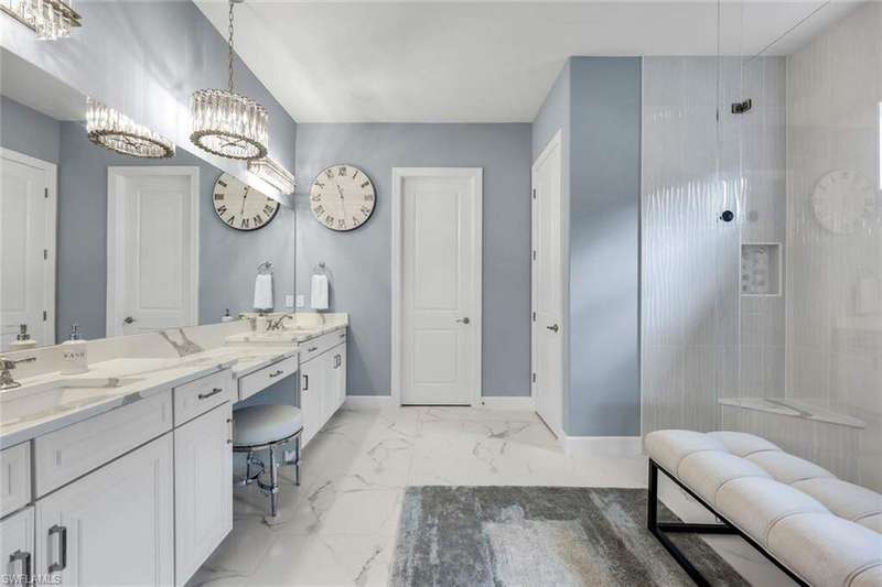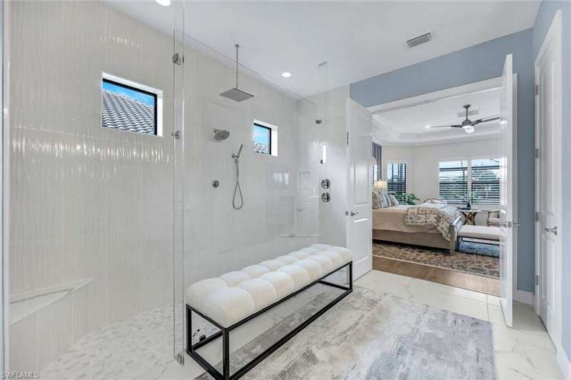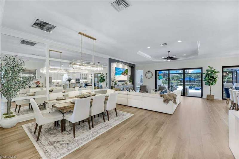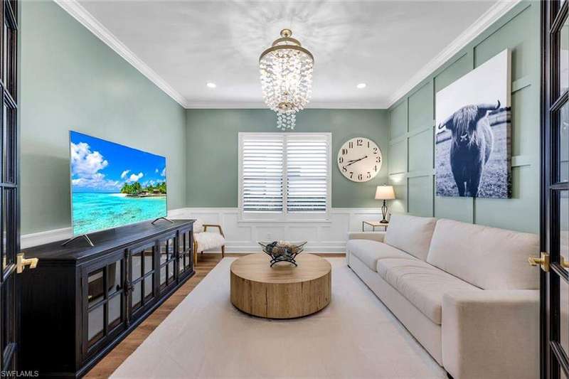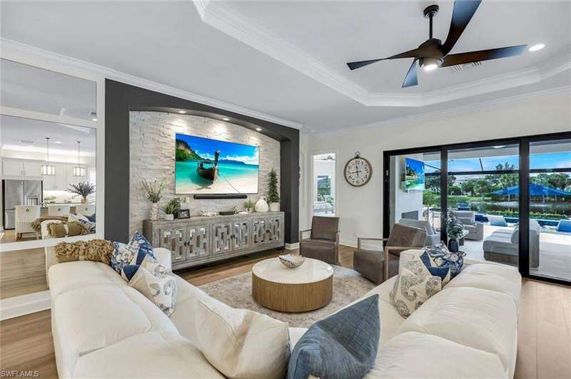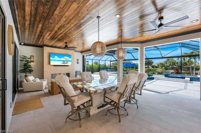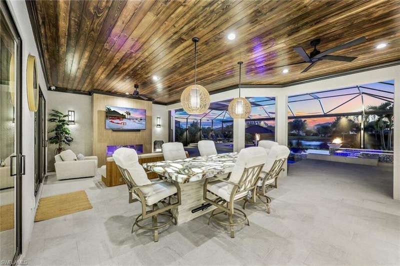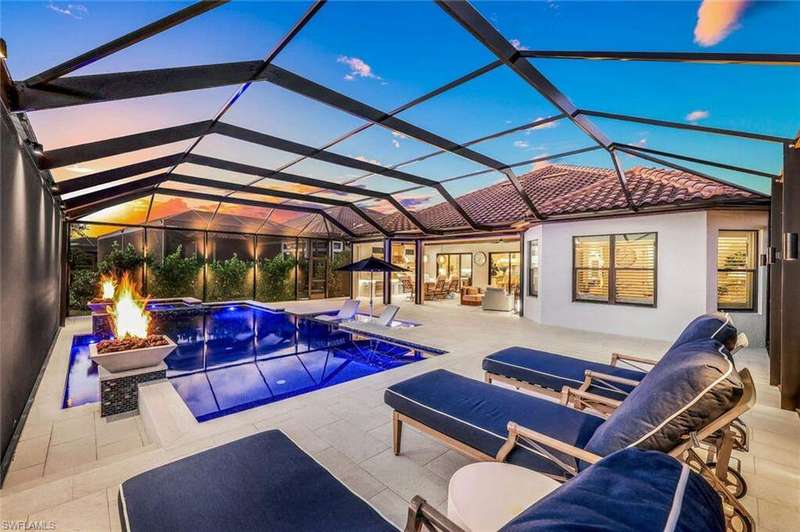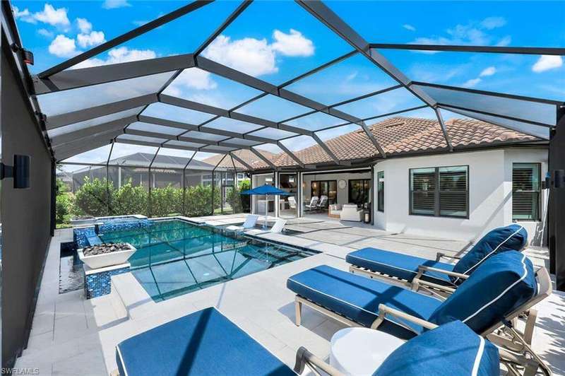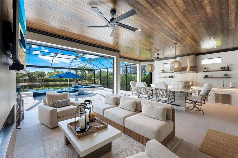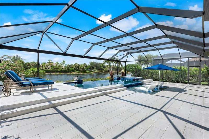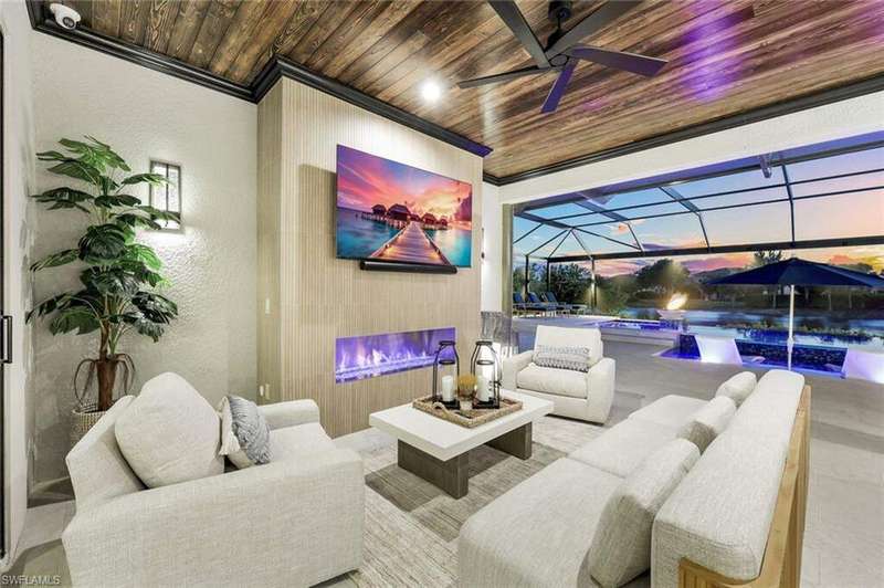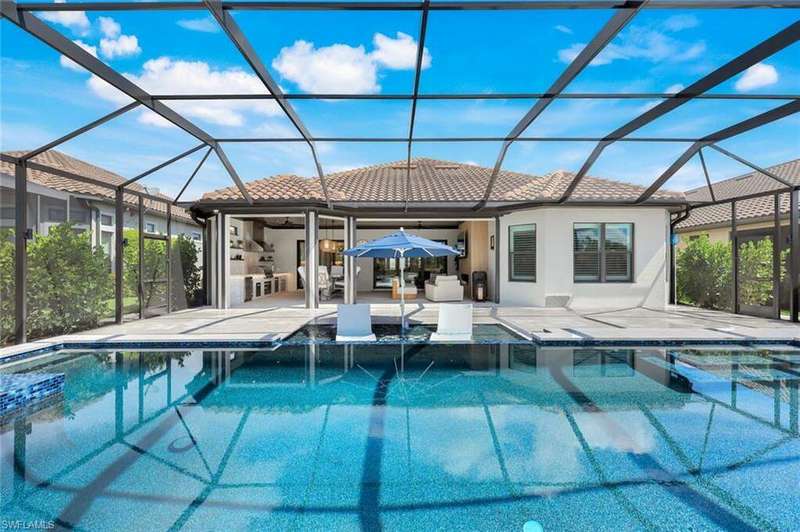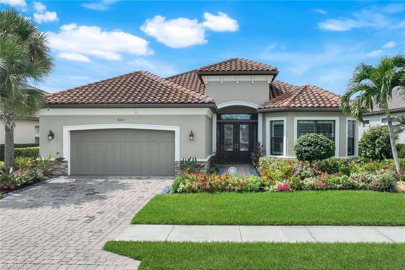 Welcome to 9223 Rialto Lane, where luxury and lifestyle come together in this stunning Pallazio open-concept home. Recently transformed with over $600K in upgrades, this residence offers an extraordinary blend of indoor elegance and resort-style outdoor living. The highlight of this home is the new oversized outdoor living oasis: infinity edge pool with sun shelf, large spa, outdoor fireplace, and state-of-the-art 16-foot summer kitchen. Entire outdoor area is porcelain tile flooring laid over a cement slab. Custom lighting on the picture frame screen cage, in and around the pool. This home offers one of the largest outdoor living areas in the community, making it truly exceptional. Perfect for entertaining or simply soaking in the sun and breathtaking western sunsets Naples is famous for. Inside, you'll find 3 gracious bedrooms plus a den. Plantation shutters, and wide-plank luxury vinyl flooring throughout, except master bath with marble. The newly expanded kitchen shines with quartz countertops, upgraded cabinetry, custom backsplashes, and top-of-the-line appliances, including a Wolf professional gas range with double ovens. Bonus beverage center with wine cooler. The reimagined primary suite boasts a bay window overlooking the lanai, upgraded spa shower, expanded dressing area, and custom storage solutions. Additional upgrades include a Lutron lighting system, climate-controlled over-sized 2-car garage, tankless water heater, newly added electric storm screens on the lanai and lush, colorful landscaping surrounding the entire home. As a bonus, GOLF MEMBERSHIP IS INCLUDED with this property. Esplanade's resort lifestyle features a free-form pool with cabanas, poolside restaurant and bar, fitness center, tennis, pickleball, bocce, full-service salon and spa, a culinary center with wine tasting room and wine lockers, and a dog park, plus an 18-hole championship golf course. Perfectly located, Esplanade provides easy access to Naples' renowned beaches, shopping, dining, and all the best the area has to offer.