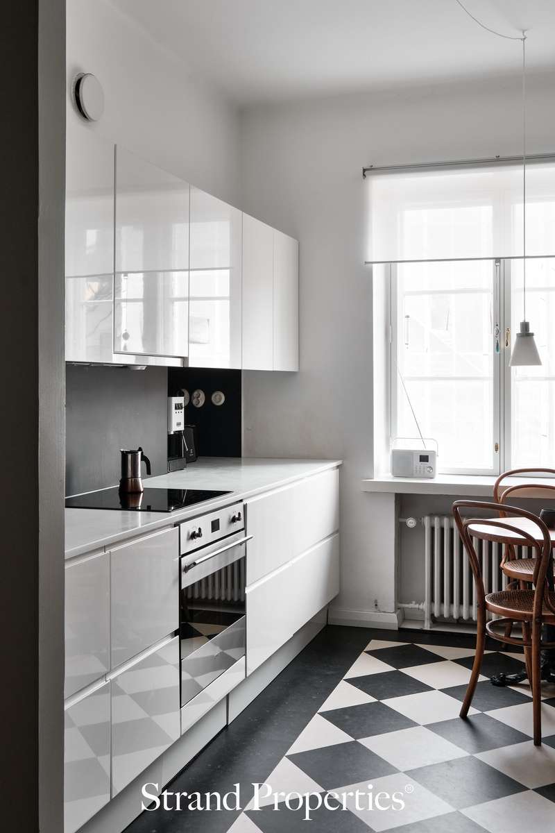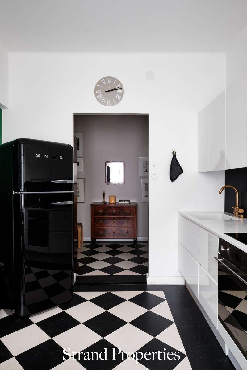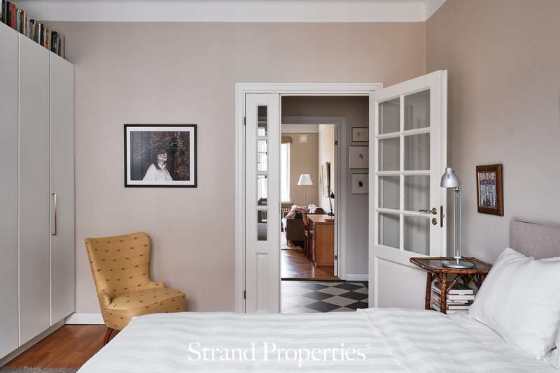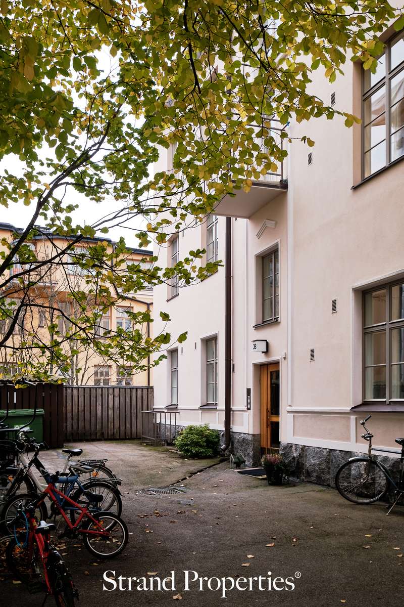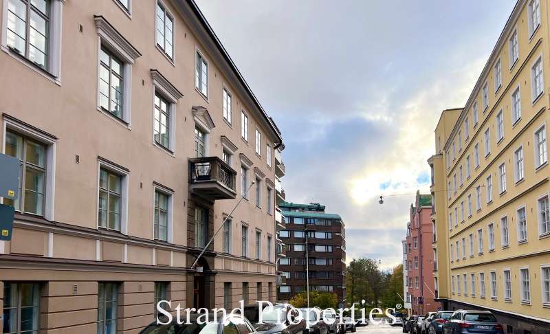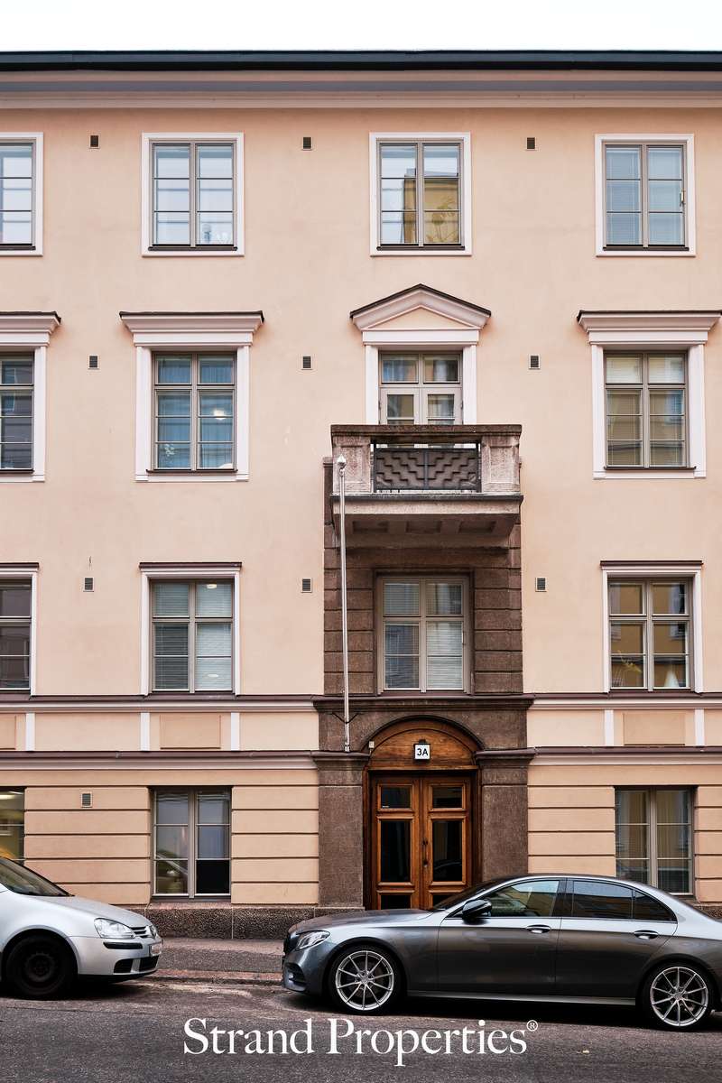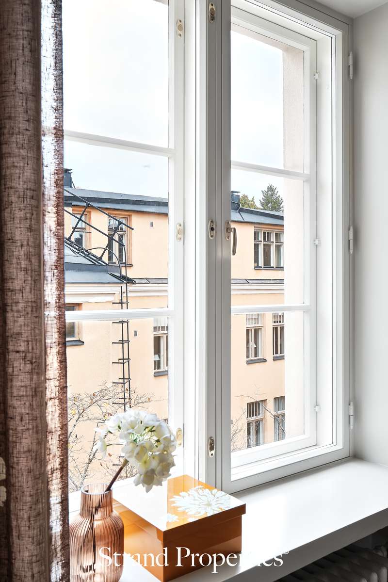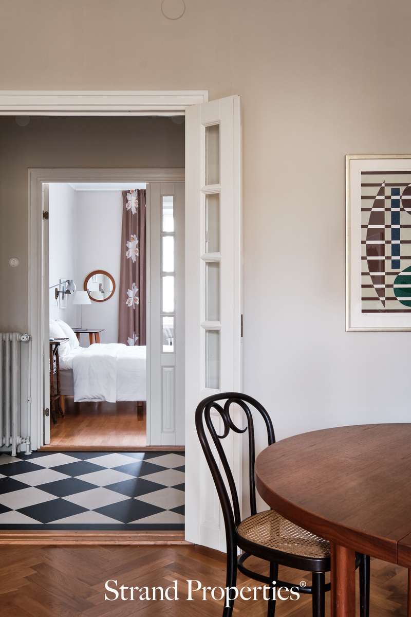 Viehättävä ja hyväkuntoinen kaksio Ullanlinnan sydämessä, Kaivopuiston ja meren läheisyydessä. Tervetuloa tutustumaan tähän hurmaavaan, hyväkuntoiseen 60 m² kaksioon, joka sijaitsee Raatimiehenkadulla, Arkkitehti Runar Finnilän piirtämässä talossa. Sijainti on yksi Helsingin halutuimmista – aivan Kaivopuiston vehreyden ja merenrantareittien vieressä ja omassa rauhassa sisäpihan suojassa. Tämä läpitalon huoneisto on remontoitu ajattoman tyylikkäästi. Olohuoneen ja makuuhuoneen pikkuruutuiset lasipariovet, eteisen ja keittiön klassiset shakkiruutulattiat ja kalanrutoparketti olohuoneessa sekä vitivalkoiset keittiön kaapistot yhdistettynä mustaan tekevät kokonaisuudesta täydellisen. Makuuhuoneessa on pitkä rivi vaatekaappeja, kerrankin tarpeeksi säilytystilaa. Kylpyhuoneeseen tuo viimeisen silauksen ja persoonallista raikkautta vihreät lasimosaiikit sekä Tapwellin messinkiset vesikalusteet.
