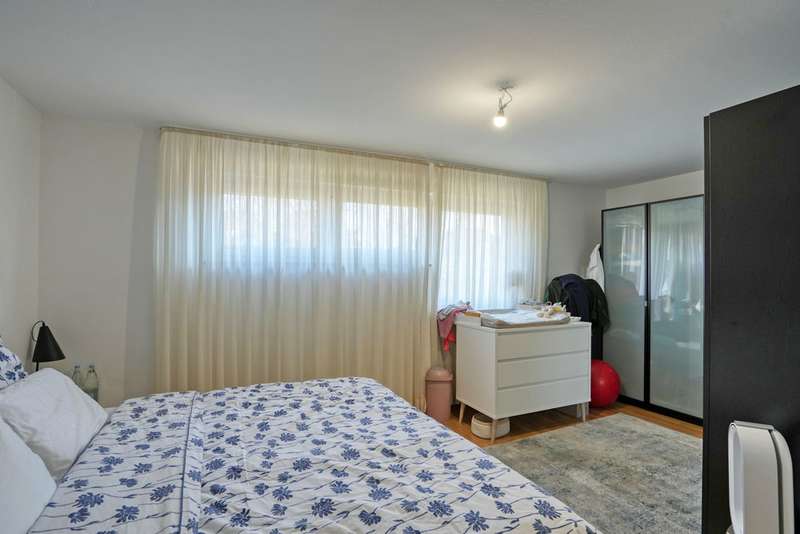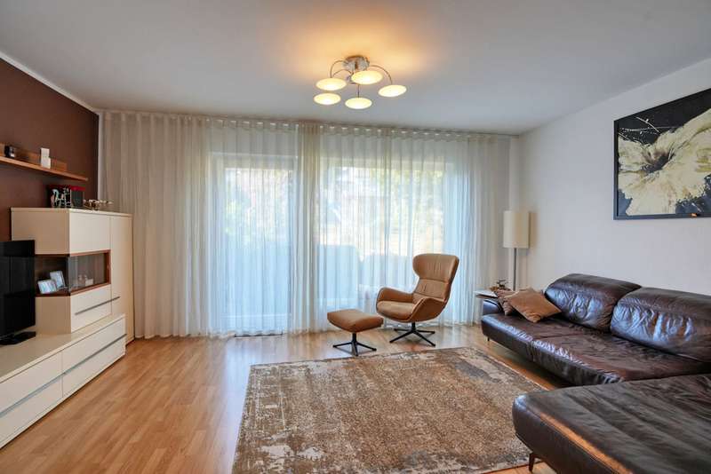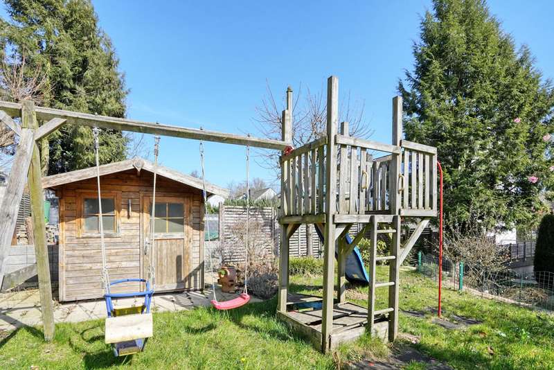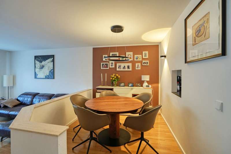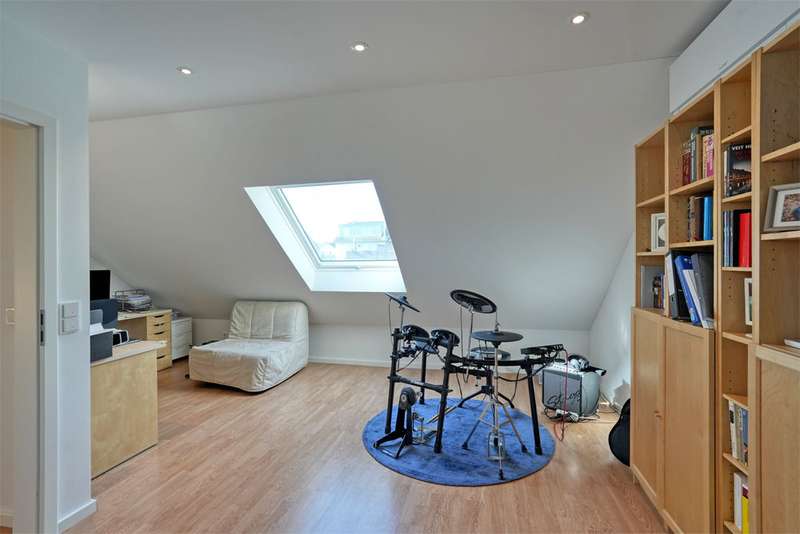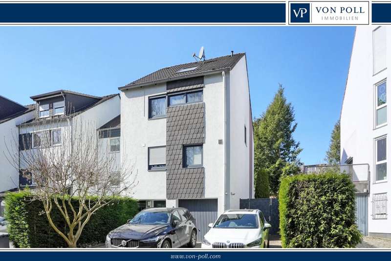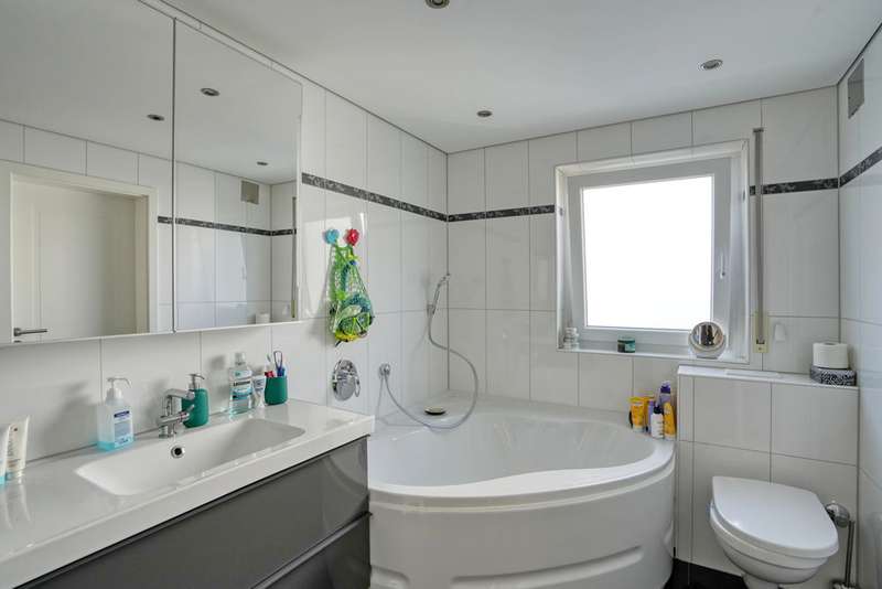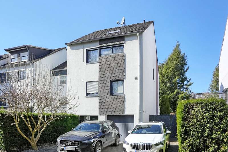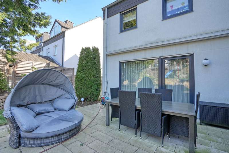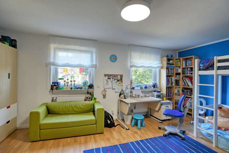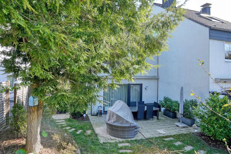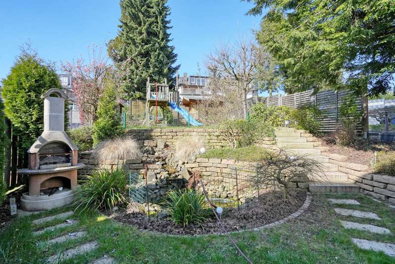 This generously proportioned single-family terraced house was built in 1986 as a solid construction and has been continuously modernized and maintained by the current owners since 2006. The entrance area with checkroom, the boiler room, a storage room and a utility room are located on the entrance level. On the first floor is the spacious living/dining area with access to the terrace and garden, the well-equipped kitchen and the guest bathroom, which is fitted with a shower. On the upper floor are the large bedroom and a large children's room, as well as the bathroom, which is equipped with a bathtub. There is a very spacious studio on the top floor, which can be easily divided if required. The garden offers space for various activities with lawns and planting areas. It is terraced and has a large play area at the back. There is a large terrace with awning next to the house. A garage in the house and parking spaces in front of it complete the offer.
