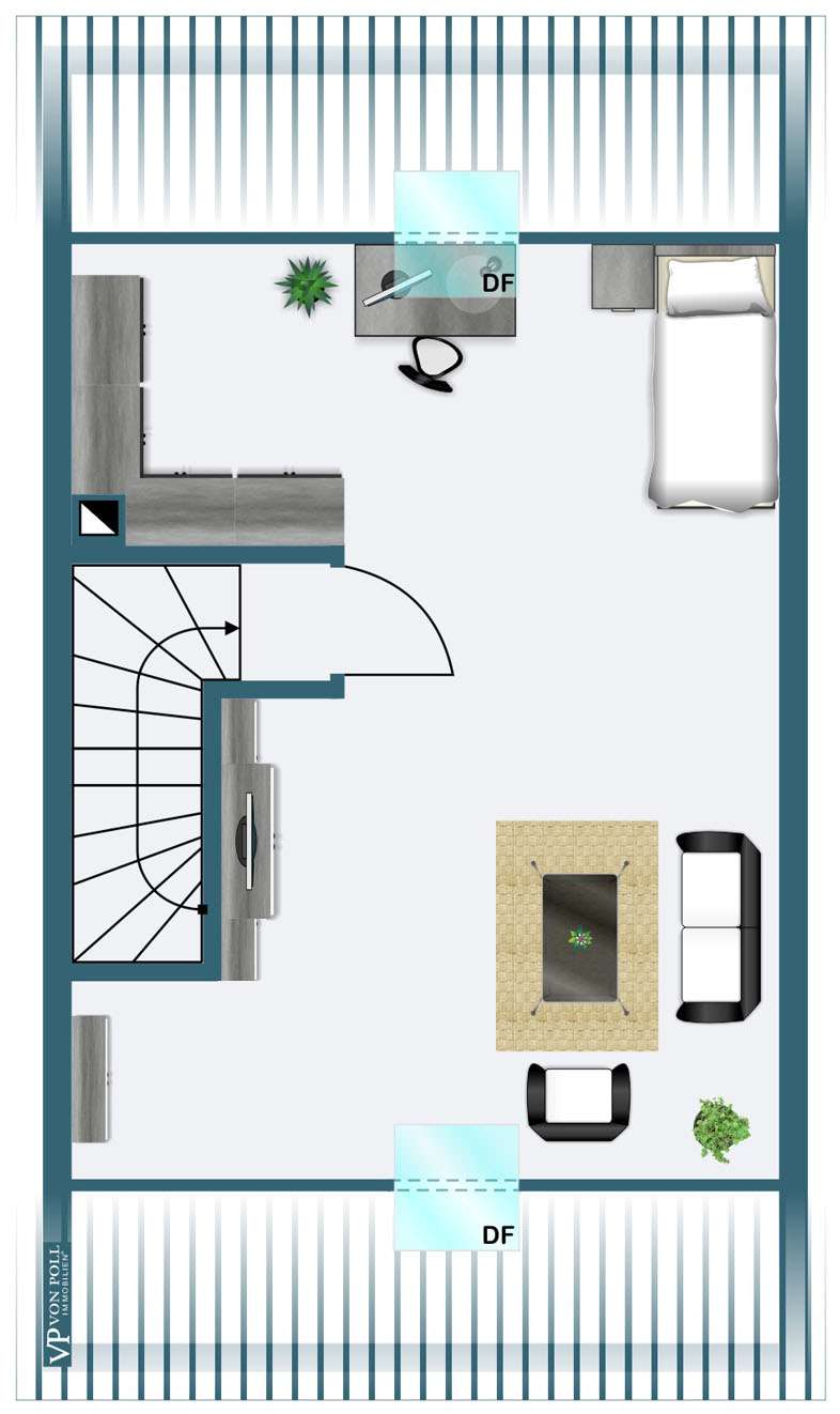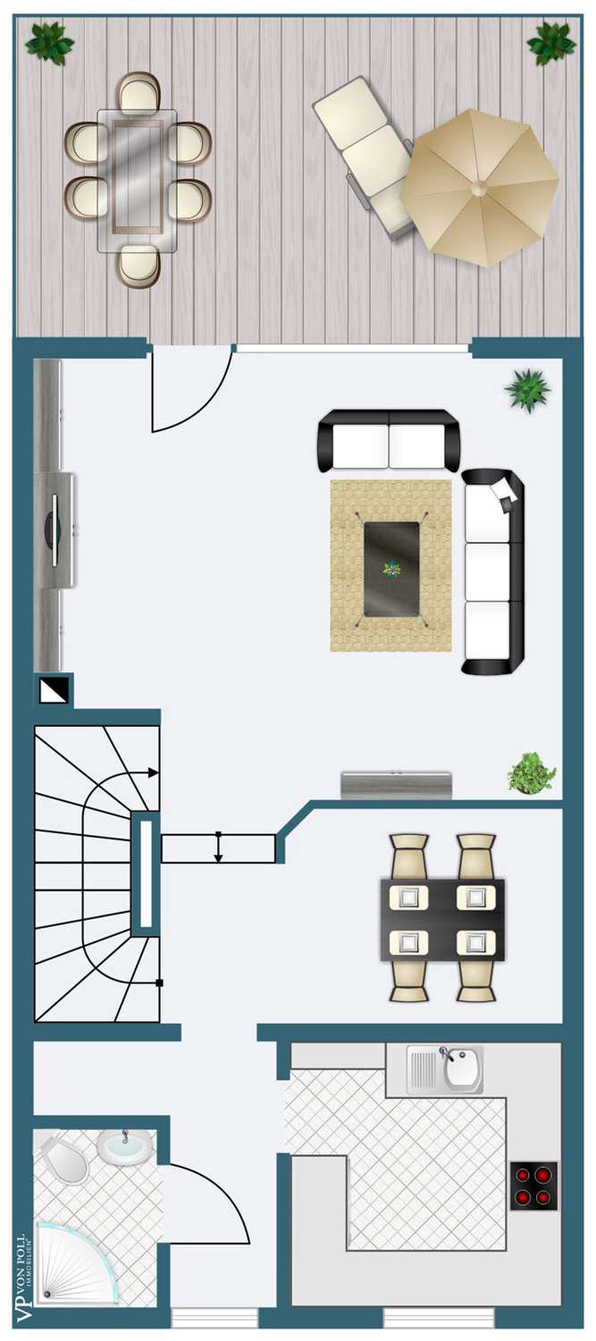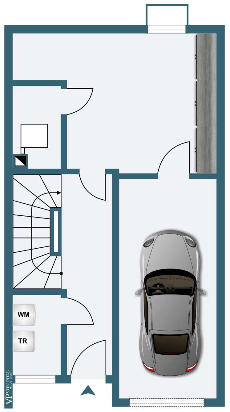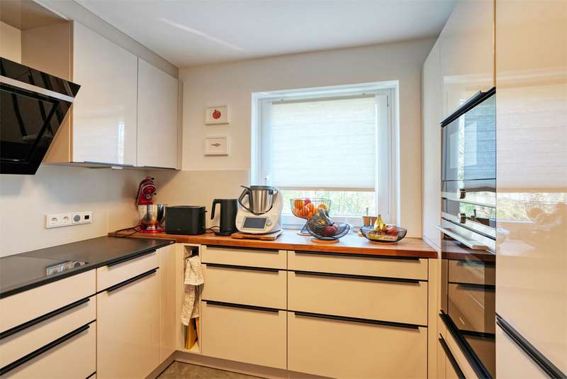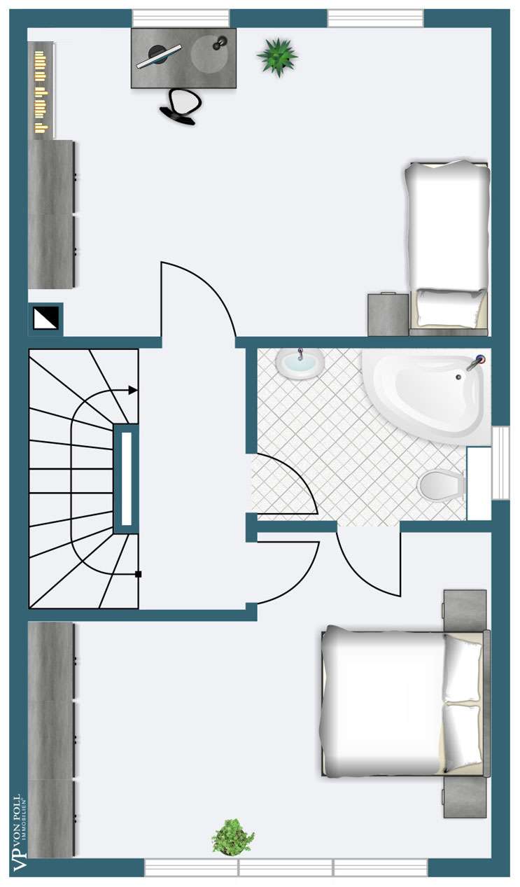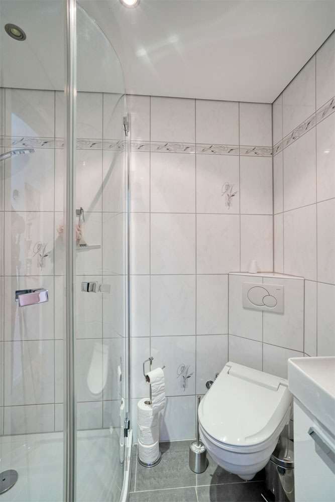 This generously proportioned single-family terraced house was built in 1986 as a solid construction and has been continuously modernized and maintained by the current owners since 2006. The entrance area with checkroom, the boiler room, a storage room and a utility room are located on the entrance level. On the first floor is the spacious living/dining area with access to the terrace and garden, the well-equipped kitchen and the guest bathroom, which is fitted with a shower. On the upper floor are the large bedroom and a large children's room, as well as the bathroom, which is equipped with a bathtub. There is a very spacious studio on the top floor, which can be easily divided if required. The garden offers space for various activities with lawns and planting areas. It is terraced and has a large play area at the back. There is a large terrace with awning next to the house. A garage in the house and parking spaces in front of it complete the offer.