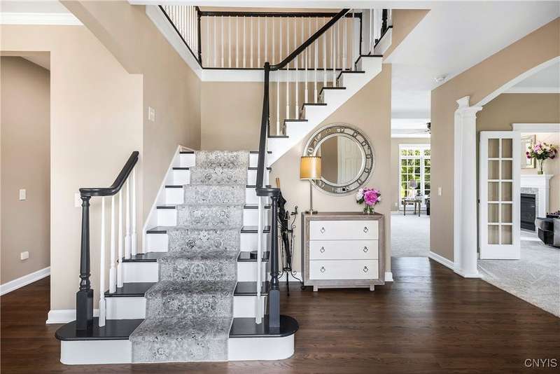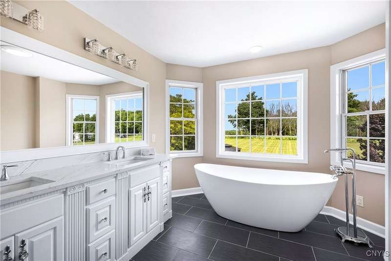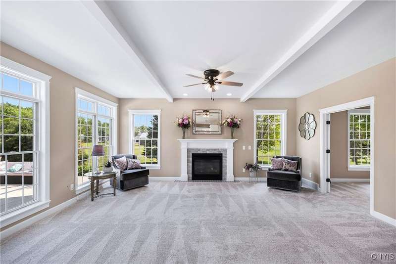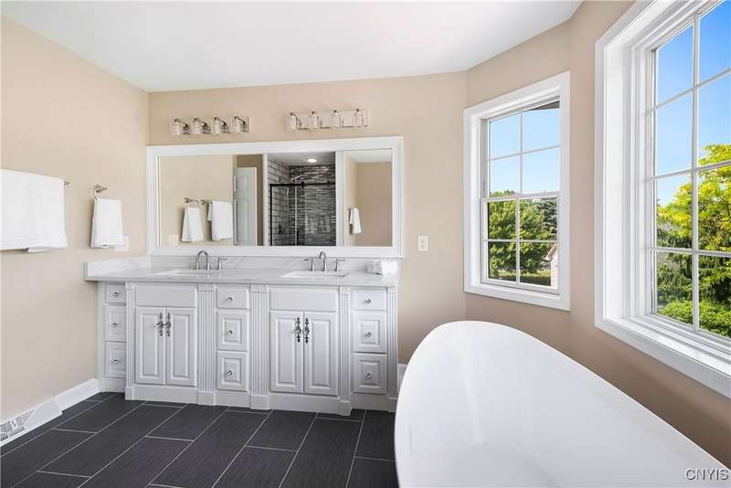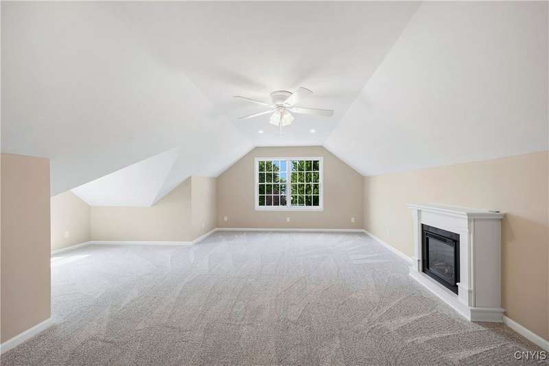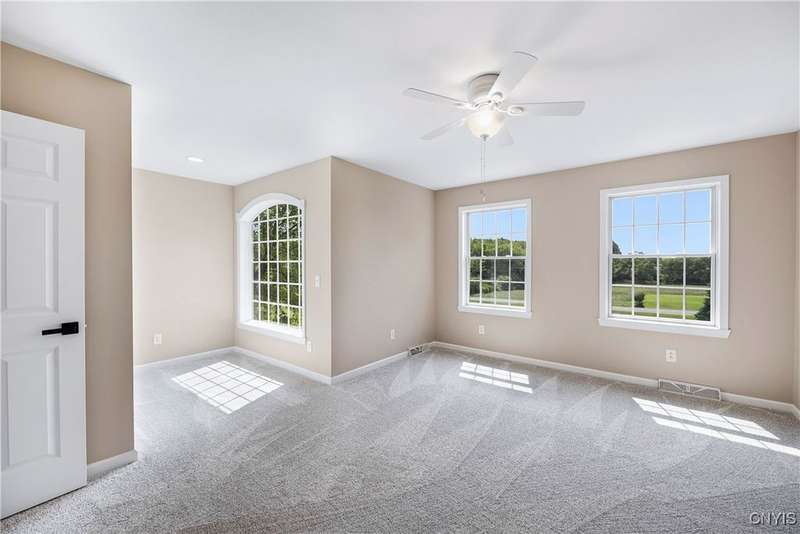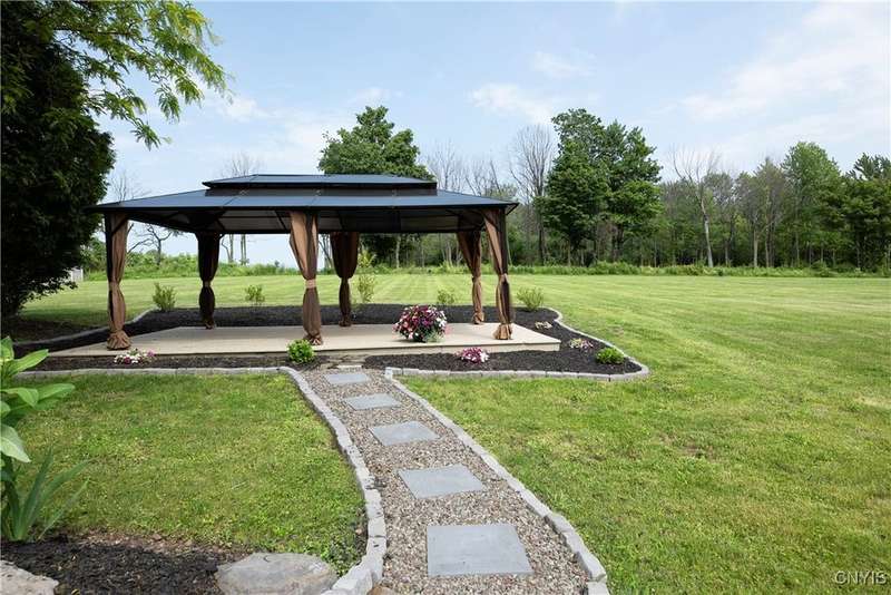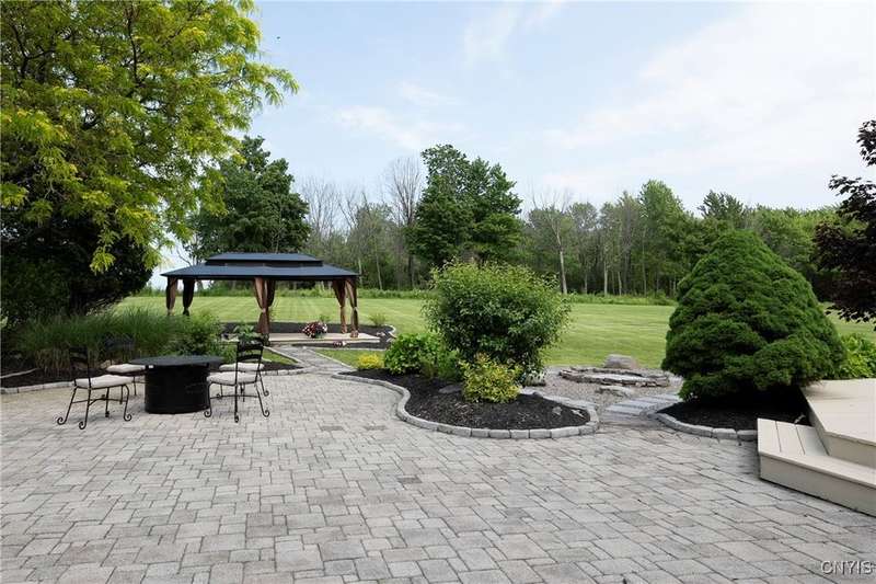 This magnificent custom-built Colonial residence is situated on over 18 acres of land, surrounded by beautifully landscaped grounds that enhance its overall curb appeal. The property features 4-5 bedrooms, two full bathrooms, and one half bathroom. As you step inside, you are greeted by a welcoming foyer, formal dining and living areas, and a recently updated kitchen with a convenient coffee station that flows into the cozy family room with a gas fireplace. The family room is bright and airy with plenty of windows and sliders that open up to the spacious back deck overlooking the lush yard. Additional amenities include a butler's pantry, mudroom with hooks, and a half bathroom. Upstairs, you will find a laundry room, a primary bedroom with an updated ensuite bathroom featuring a double vanity, soaking tub, tiled shower, water closet, and walk-in closet. There are also three more bedrooms, a bonus room above the garage that can serve as a fifth bedroom or office, and another updated full bathroom. The finished lower level offers an additional 1000 square feet of living space with a gas fireplace. Located in the award-winning Skaneateles school district and just a short drive away from schools and the village center, this exceptional property is truly a gem.