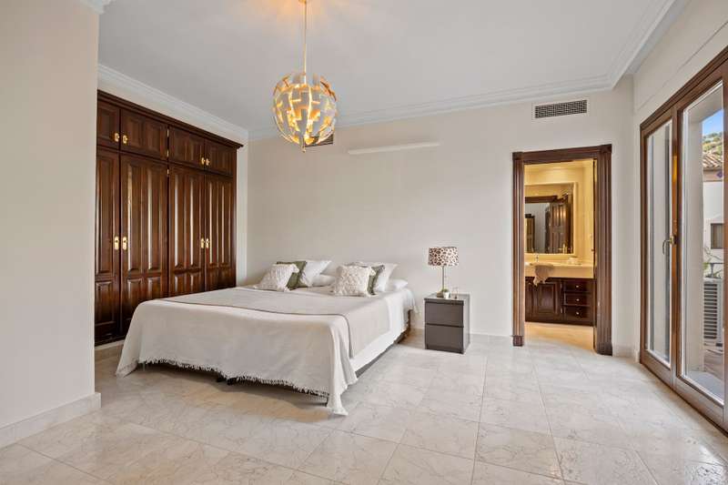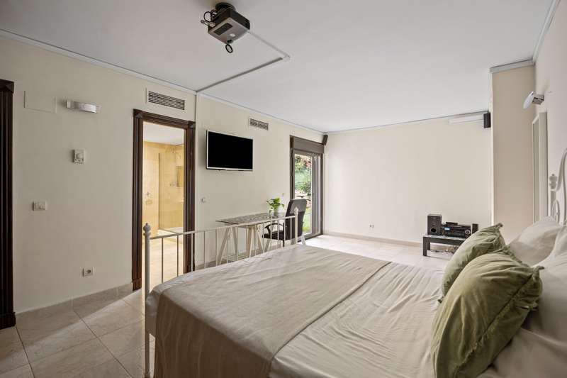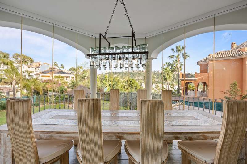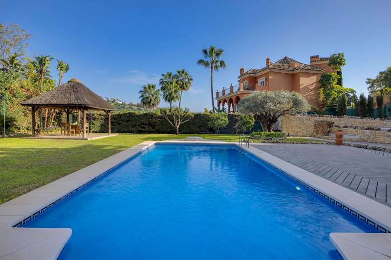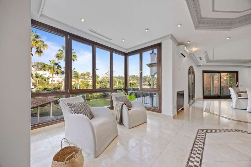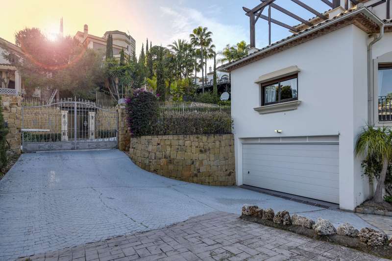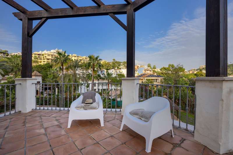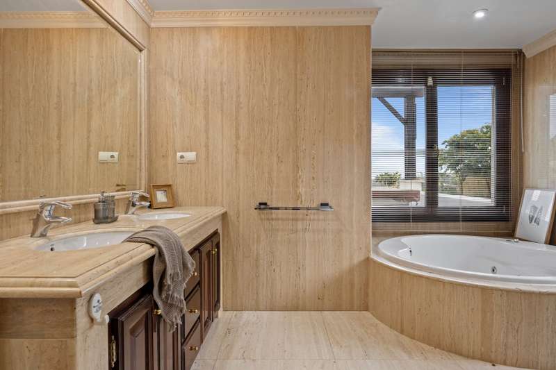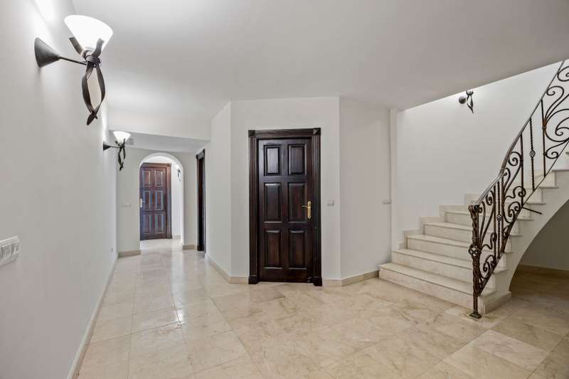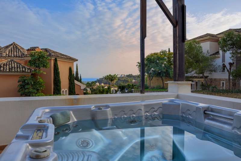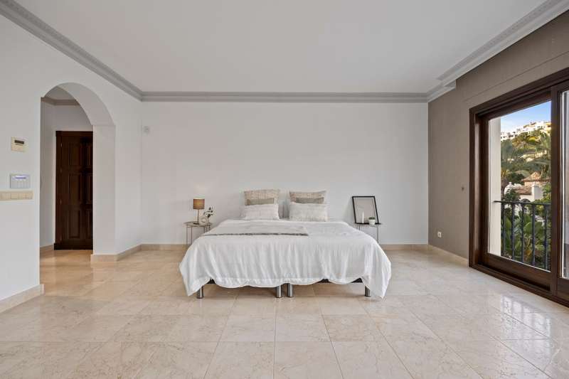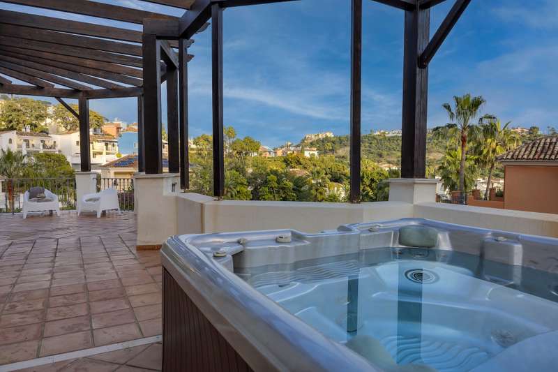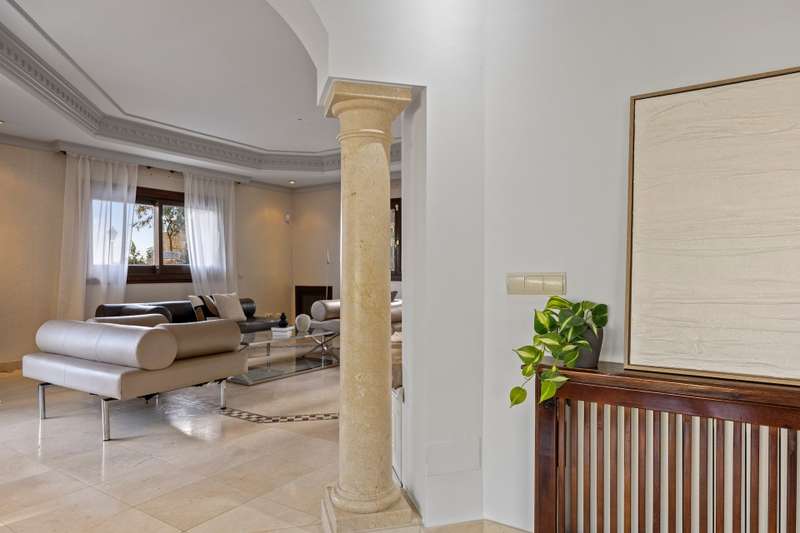 An architectural gem with character and investment potential Step into this remarkable family villa nestled within the prestigious Los Arqueros Golf & Country Club. Boasting a unique architectural design and generous living spaces, this property offers limitless potential—whether for comfortable living or as a high-return investment. The entrance level welcomes you with a grand double-height foyer featuring soaring ceilings and a striking marble staircase. The open layout flows seamlessly into a bright living area comprising a spacious lounge, dining space, and an enclosed terrace ideal as a winter garden. A cozy corner with a fireplace adds warmth and charm. This floor also includes a fully equipped kitchen, a guest toilet, and a bedroom with an en-suite bathroom and direct access to the terrace. Upstairs, the master suite stands out with its private terrace, sunbathing area, and jacuzzi. Two additional en-suite bedrooms each enjoy their own private terraces and ample built-in ward