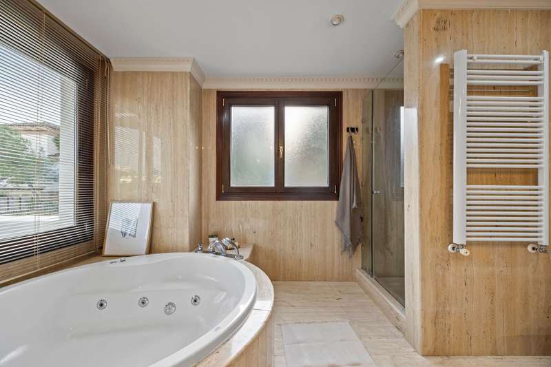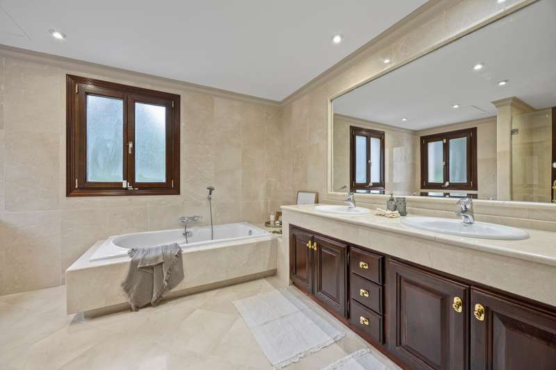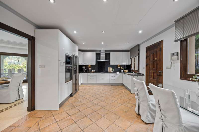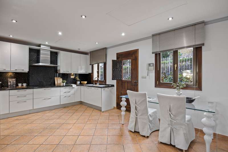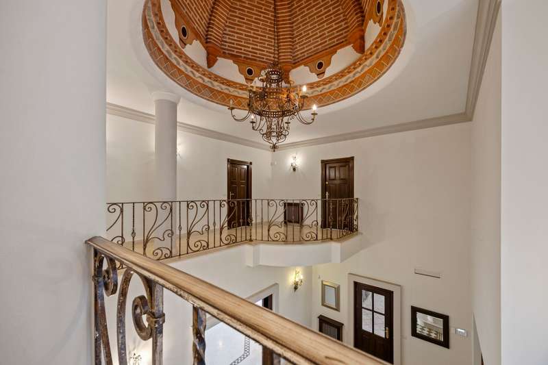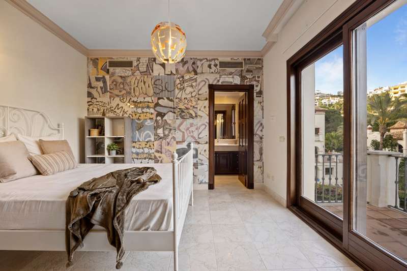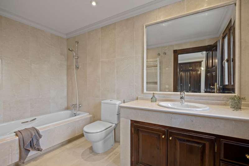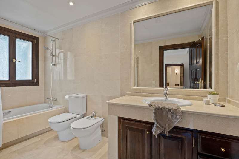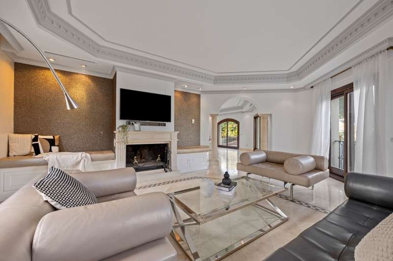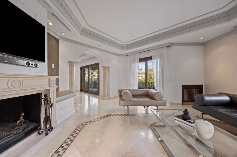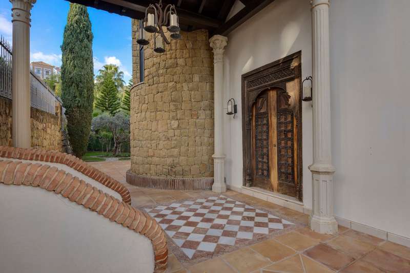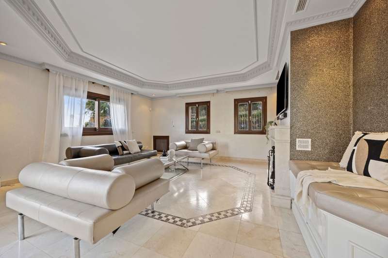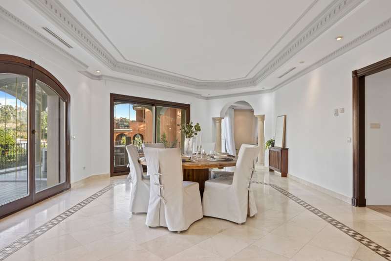 An architectural gem with character and investment potential Step into this remarkable family villa nestled within the prestigious Los Arqueros Golf & Country Club. Boasting a unique architectural design and generous living spaces, this property offers limitless potential—whether for comfortable living or as a high-return investment. The entrance level welcomes you with a grand double-height foyer featuring soaring ceilings and a striking marble staircase. The open layout flows seamlessly into a bright living area comprising a spacious lounge, dining space, and an enclosed terrace ideal as a winter garden. A cozy corner with a fireplace adds warmth and charm. This floor also includes a fully equipped kitchen, a guest toilet, and a bedroom with an en-suite bathroom and direct access to the terrace. Upstairs, the master suite stands out with its private terrace, sunbathing area, and jacuzzi. Two additional en-suite bedrooms each enjoy their own private terraces and ample built-in ward
