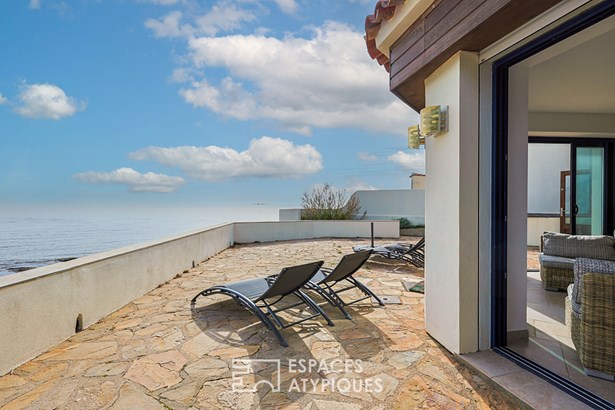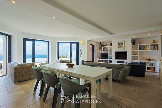 On the ground floor, a large living room bathed in natural light welcomes you with its large bay windows and opens onto a spacious terrace facing the deep blue sea. The kitchen, open to the living room, is a friendly and functional space, ideal for preparing delicious meals while admiring the seascape. A single-storey suite harmoniously completes this level.