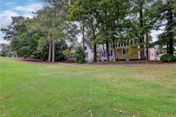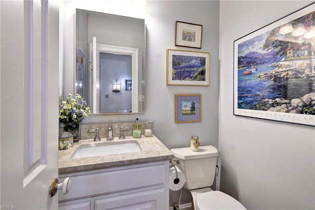 This fabulous golf-front home located on the 9th hole of the Marsh Hawk course in St. Andrews Village, Fords Colony is perfect for entertaining. The great room impresses with a cathedral ceiling, hardwood floors, built-ins, and fireplace, and opens to a bright sunroom/office. The elegant dining room with crown molding and wainscoting sets the stage for gatherings, while the kitchen offers granite counters, tiled backsplash, full-height cabinets, stainless appliances and a new KitchenAid gas range. A sunny breakfast area with window seat adds charm. The first-floor primary suite enjoys golf views and a stunning updated bath with Carrera marble and basket weave shower tile. Upstairs, two large guest bedrooms provide excellent closets and share a tiled full bath. A storage room offers built-in shelving. Whole-house water filtration and newer windows in the primary and upstairs bath add value. Enjoy the ease of St. Andrews living with beautiful golf views in this inviting home.