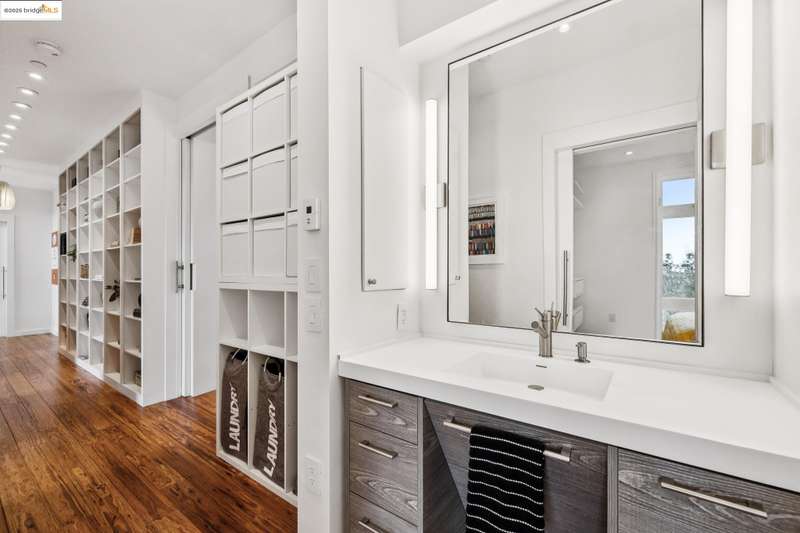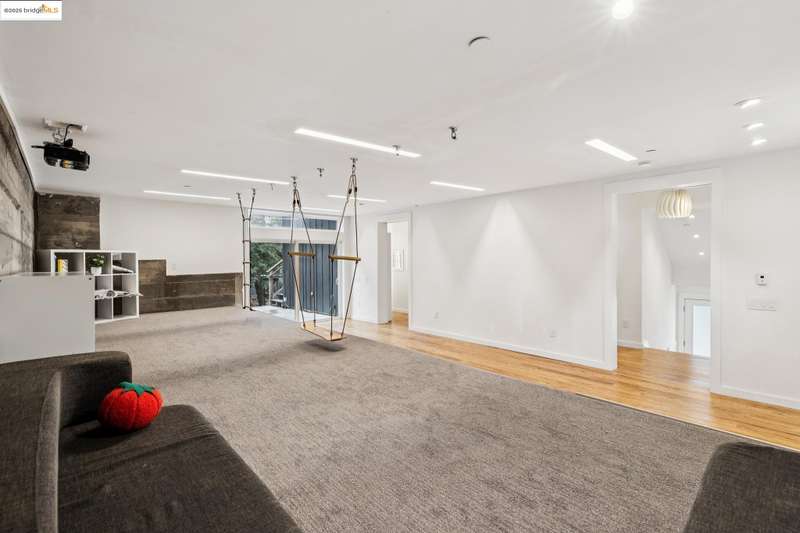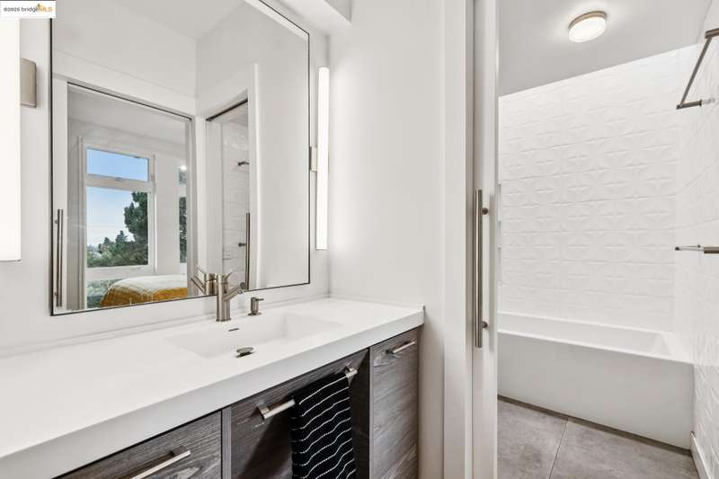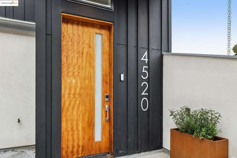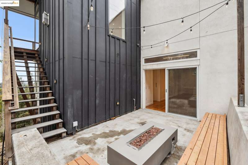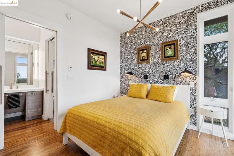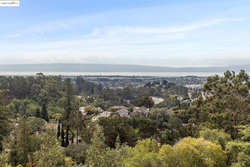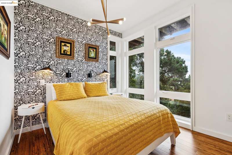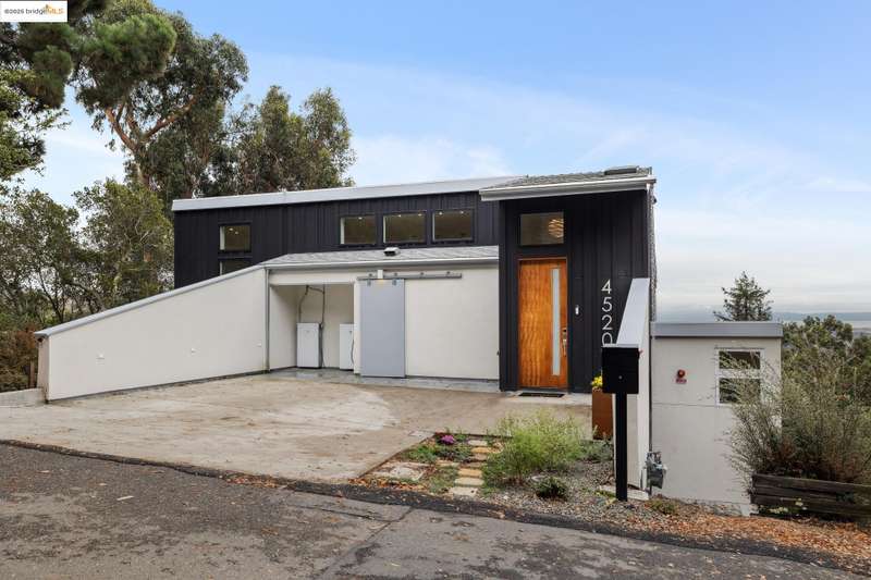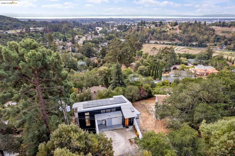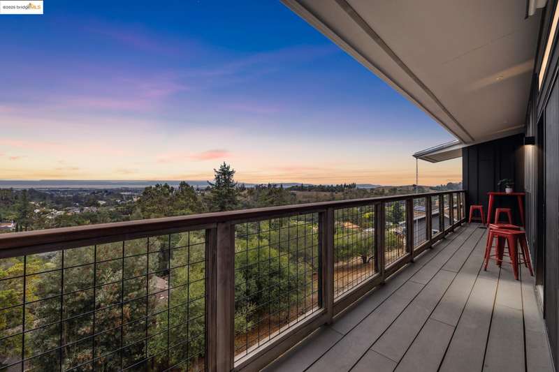 Perched in Oakland’s coveted Sequoyah Hills, this striking modern home feels like a luxe treehouse with panoramic water and skyline vistas. Soaring ceilings and views from every room! Completed in 2020, the home blends sleek design with refined comfort. A vaulted, skylit entry opens to a sun-drenched great room with floor-to-ceiling windows, gas fireplace, and seamless flow to a wraparound view deck and lower patio with built-in seating and firepit, perfect for relaxed entertaining. Downstairs, three airy bedrooms and an office boast high ceilings and enjoy bay views through 8' tall windows, alongside a spacious bonus room ideal for a media lounge, gym, or studio. Luxury finishes and modern systems elevate every detail: in-floor radiant heating, solar power with battery backup and EV charging, smart dim-to-warm lighting, solid-core pocket doors, chef’s kitchen with gas range and soft-close cabinetry, and WUI-rated exterior for wildfire safety. Nature lovers will relish the surroundings and nearby regional parks with hiking trails. Set on a private ¼-acre lot with two off-street parking spaces and bike storage, this home offers tranquility, technology, and timeless sophistication, all moments from Sequoyah Country Club and the Oakland Zoo.