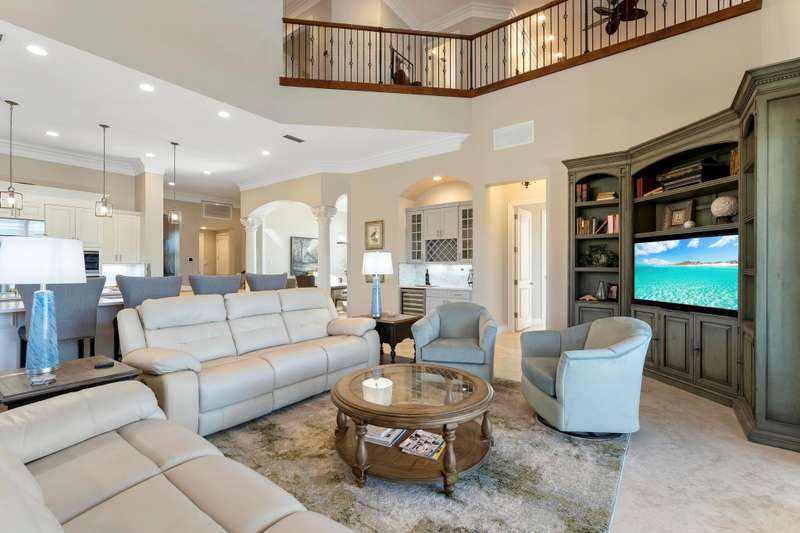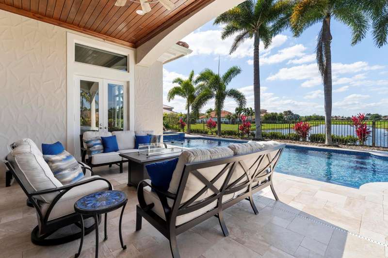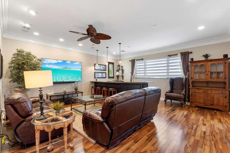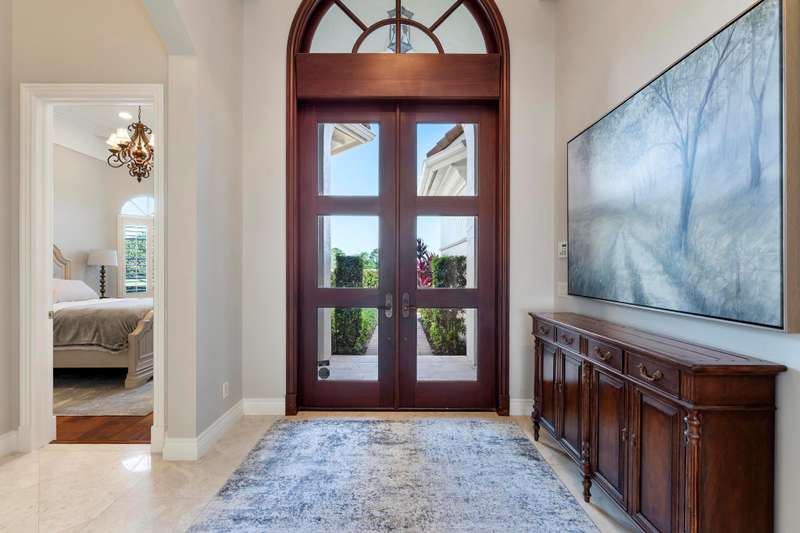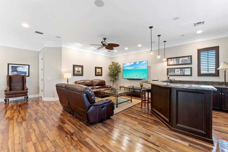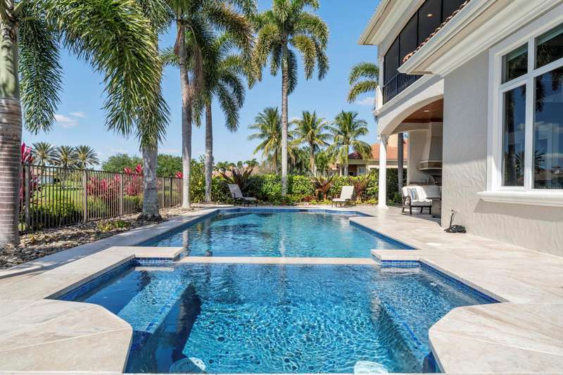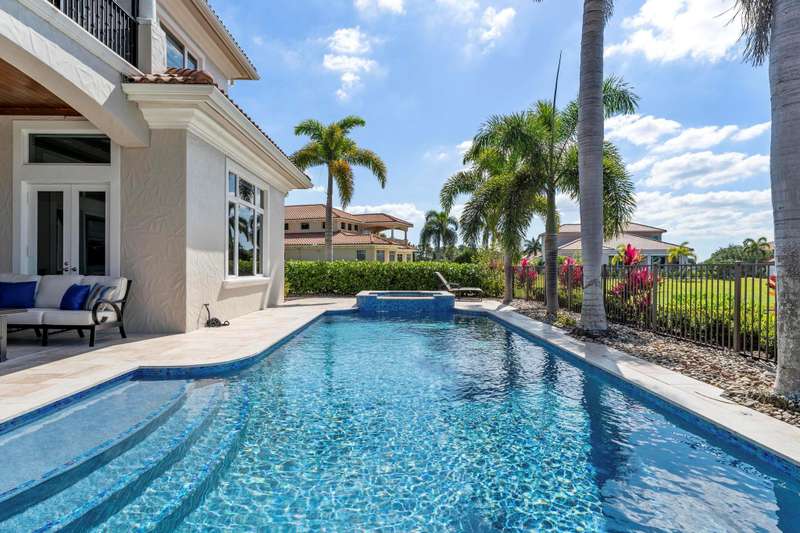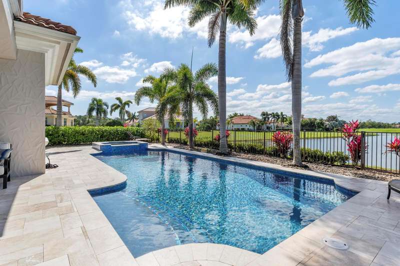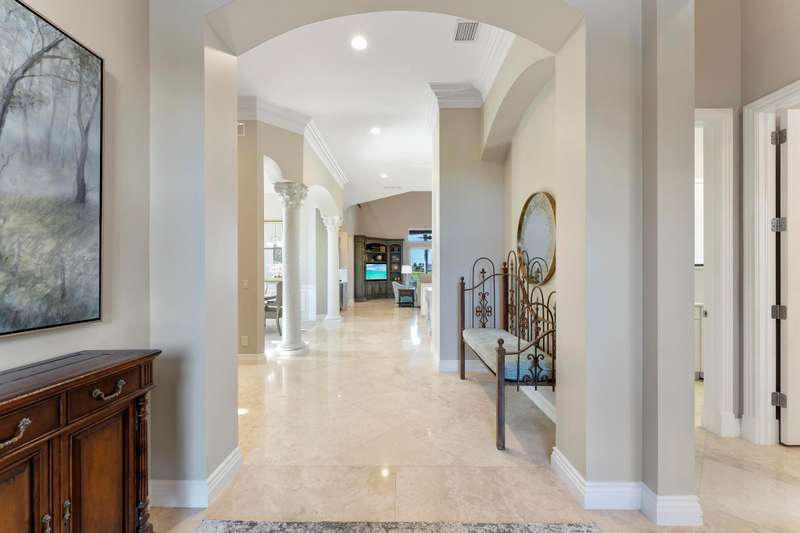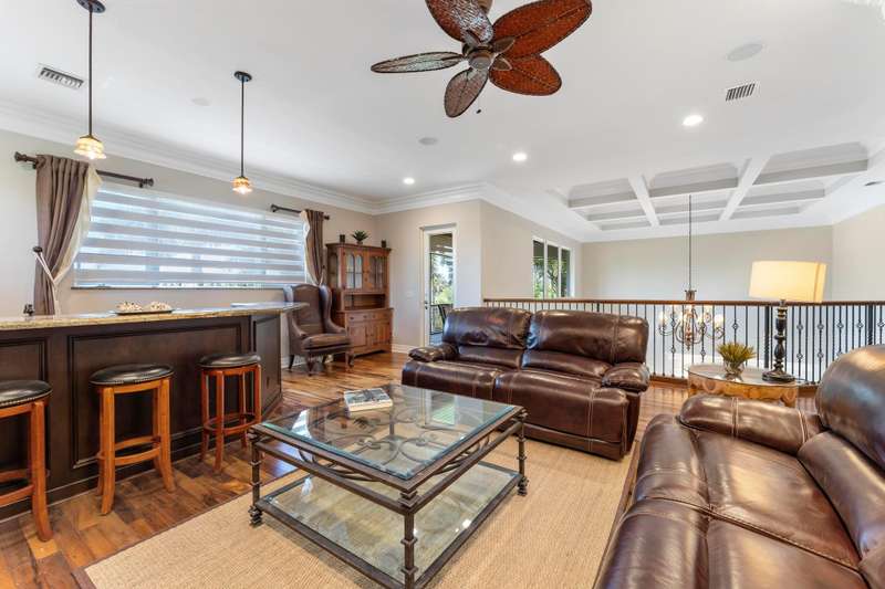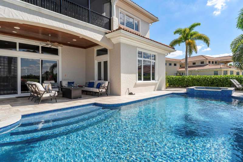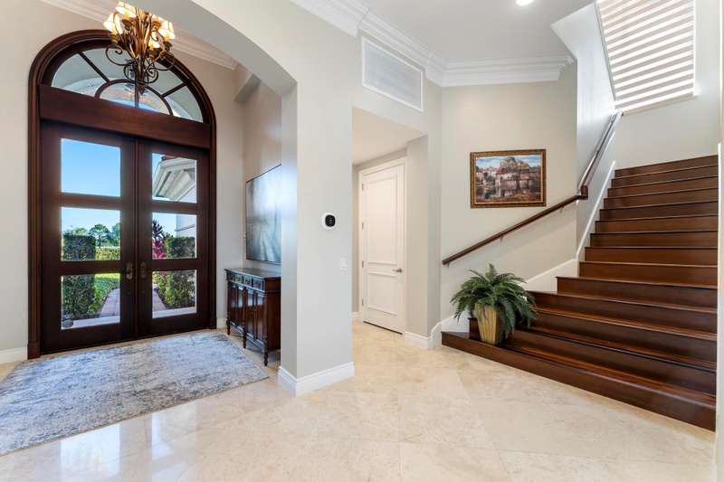 This exceptional three-bedroom residence, which includes a den and four bathrooms, is situated within the esteemed Tesoro Country Club. The layout incorporates an open floor plan that effectively showcases a newly renovated contemporary kitchen featuring a double island, substantial ceilings, and captivating views accessible from the primary living areas, balcony, and patio. The master bedroom is located on the first floor and includes a pre-installed elevator shaft, facilitating the potential installation of an elevator. Each bedroom is equipped with its own private ensuite bathroom, while the upper-level living space provides ample room for gatherings, enhanced by a sophisticated custom bar. The exterior of the property is equally impressive, featuring an oversized renovated pool and a