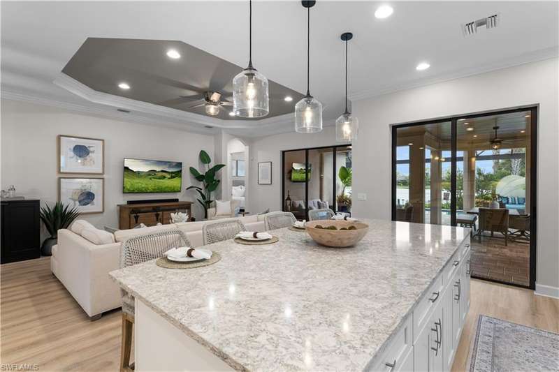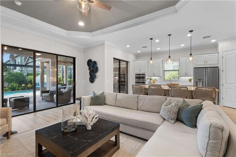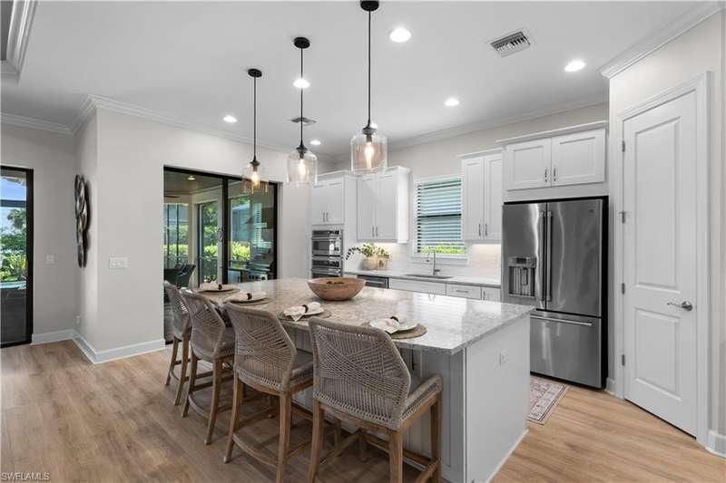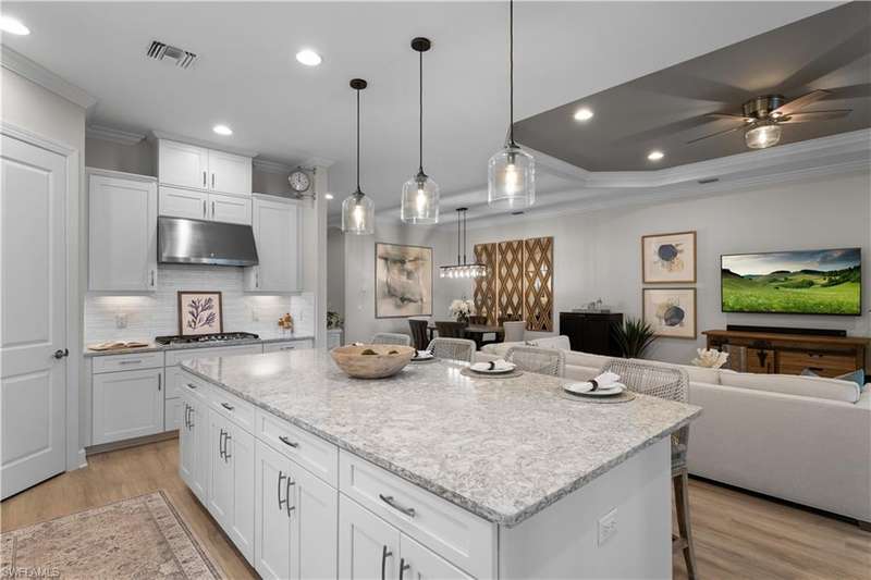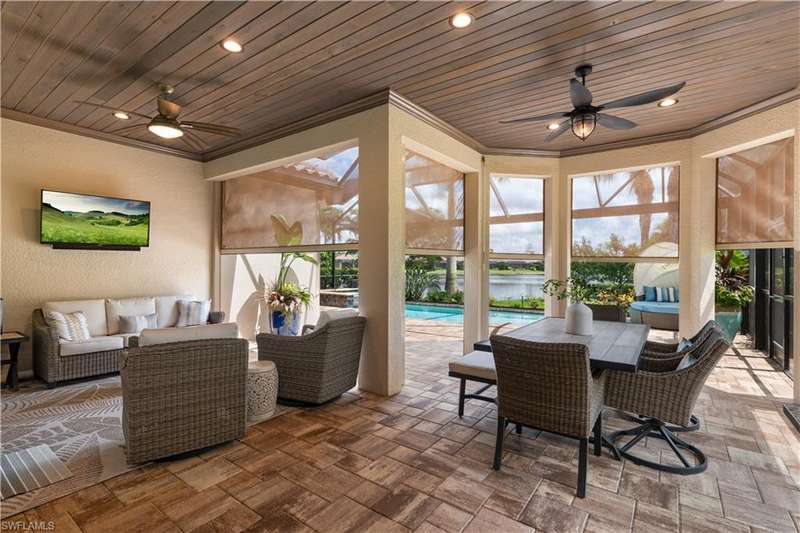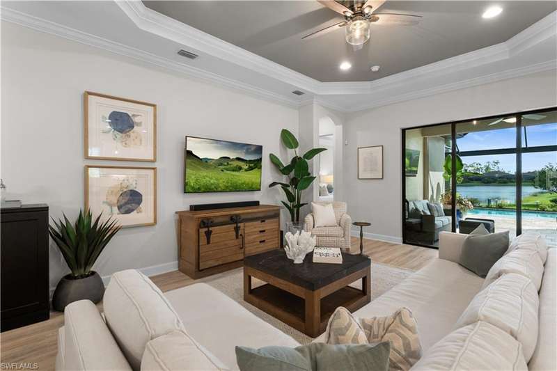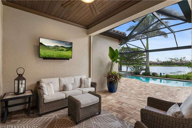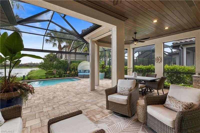 LIVE A VACATION LIFESTYLE IN ESPLANADE! FULL GOLF MEMBERSHIP INCLUDED! This immaculate and well appointed Lazio is situated near the end of a quiet cul-de-sac street with long and expansive views overlooking the lake. Inside, you will find 3 bedrooms, den, 3 full baths, and just over 2300 sq ft of open concept living space. From the moment you walk in the door, you are greeted with wood floors throughout the common areas & den and two sets of sliding glass doors to the extended lanai complete with custom outdoor kitchen, GAS heated pool with raised spa, picture window screen, motorized roll down hurricane shutters, stained cypress wood ceiling, and lush landscaping. The kitchen is the heart of the home and features shaker style cabinetry, Cambria quartz countertops, pantry with custom shelving, and GE Cafe appliances including a GAS cooktop & wall oven. This home is totally storm ready with a WHOLE HOUSE GENERATOR and complete hurricane protection. Other fine appointments include: BR
