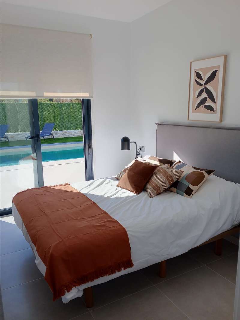 These properties for sale in Murcia, Spain showcase a pragmatic design infused with a Mediterranean flair. Spread across a single level, they feature generously proportioned outdoor spaces, including lush green areas, terraces, and a pool. Inside, you'll find convenient amenities like a laundry room and a guest toilet adjacent to the living room. The expansive living areas seamlessly connect with the open-plan kitchen. These Calasparra villas for sale encompass 3 bedrooms, each with fitted or walk-in wardrobes, with the master room exemplifying the latter.