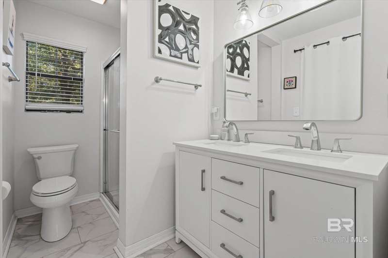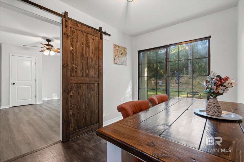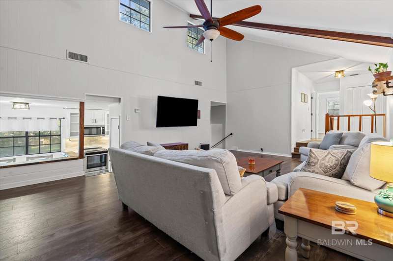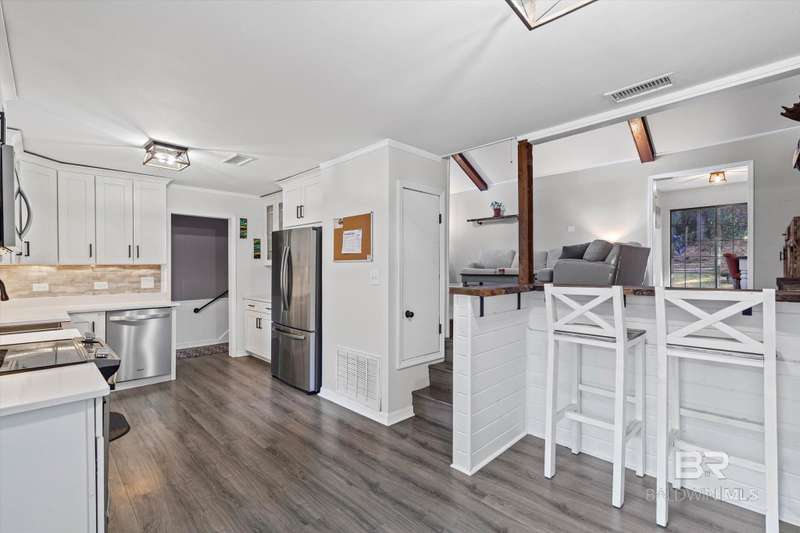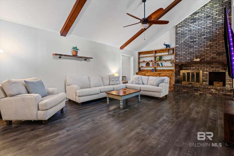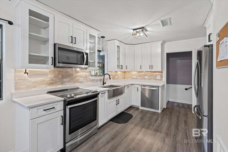 Welcome to your home on the Lake Forest Golf Course! This 3 bedroom, 2 bath home has been remodeled, now boasting modern finishes throughout. The kitchen offers new white cabinets, white quartz countertops, a farmhouse stainless steel sink, and stainless steel appliances. The breakfast bar comes with a custom live edge pine slab and stools. The living room is open with vaulted ceilings and features a brick floor-to-ceiling, wood-burning fireplace and clerestory windows, which fills the space with natural light. Primary bedroom is spacious and offers access to the back porch. The ensuite bathroom features a double vanity, walk-in shower, and walk-in closet. Both bathrooms have been remodeled with new bathtub/shower, vanities, quartz countertops, fixtures, and flooring. Enjoy your evenings on the back porch or covered patio. Home has custom plantation blinds, gutters, and an insulated garage door. Roof 2023, HVAC 2024. Residents of Lake Forest have access to many amenities: tennis courts, pools, boat launch, playgrounds, fishing pier, and more! Buyer to verify all information during due diligence.