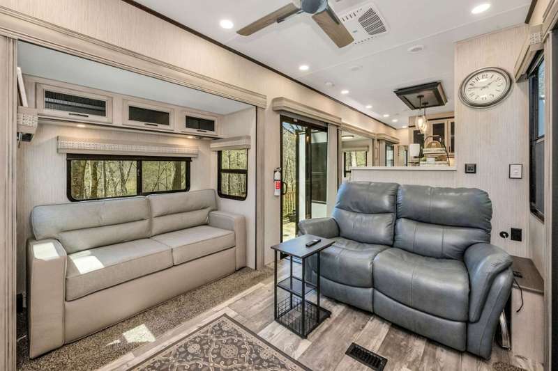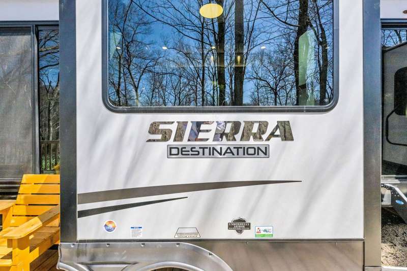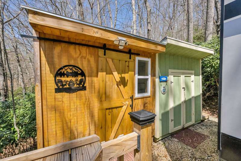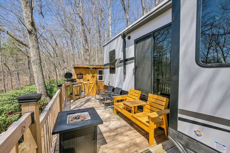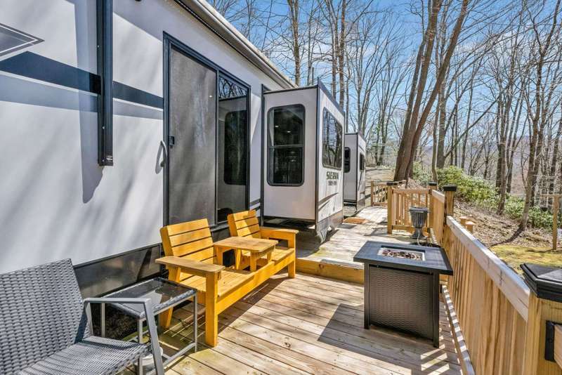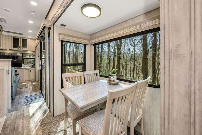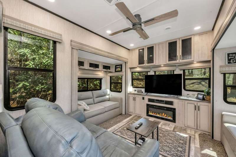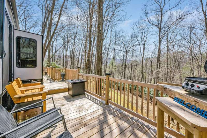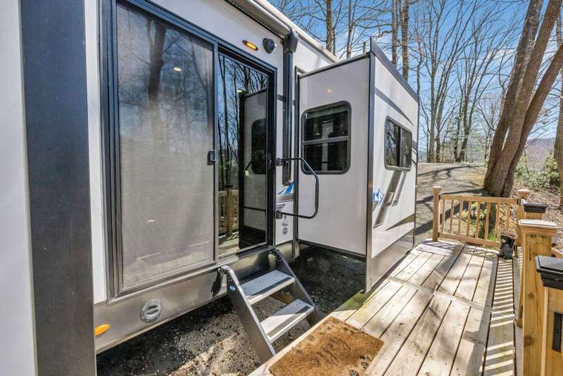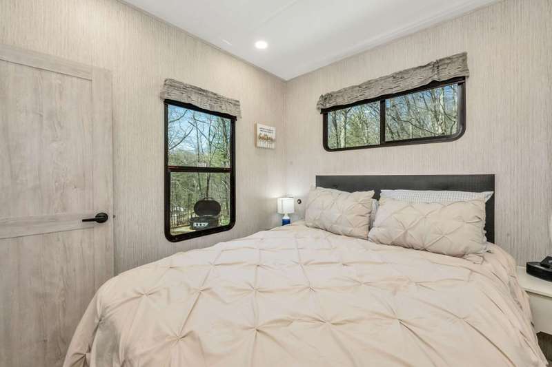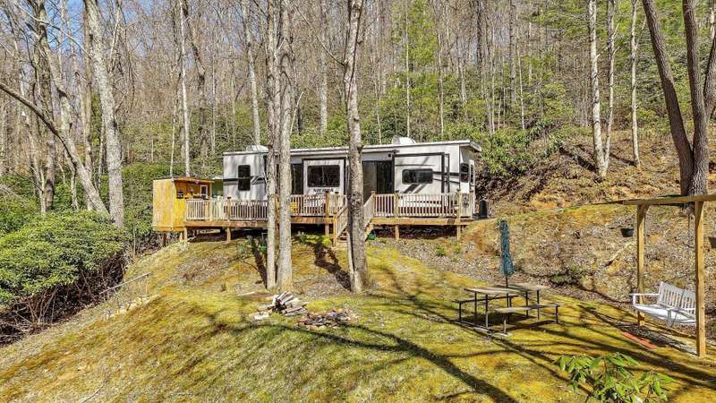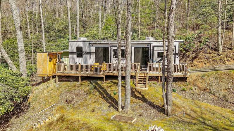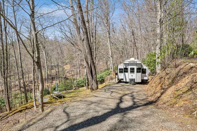 Escape to your private retreat in the serene Spicewood River community, nestled on the North Fork of the New River. Spend your days floating or fishing from the neighborhood river access and unwind in the evenings on the deck or gathered around the fire pit under the starry sky. Experience the enchanting seasonal views of Three Top Mountain, with the potential for year-round vistas through thoughtful tree trimming. This low-maintenance Park Model is designed for stress-free living, offering you the perfect home away from home. Step inside through one of two sliding glass doors and be greeted by a spacious living area where modern rustic charm meets comfort. The electric fireplace enhances the cozy ambiance, taking the chill off cool High Country mornings and evenings. With two sleeper sofas and a reclining leather loveseat, there's plenty of room for guests to relax. The kitchen boasts full-size stainless steel appliances, abundant cabinetry, and generous counter space, making meal prep a breeze. Enjoy casual dining in the cozy dining nook surrounded by windows overlooking the wooded setting. The comfortable bath with a shower is one of two on the property. Retreat to the bedroom, featuring a queen bed, ample storage, and a wall of closets. Additional storage under the bed is accessible from the outside, and a dedicated closet offers washer/dryer hookups for added convenience. Just outside, off the deck, you'll find a second bathroom with a shower and a laundry area with a full-size washer and dryer. Live your Blue Ridge Mountain dream from this ideally located getaway, perfectly positioned near West Jefferson, Lansing, Mount Rogers, and Grayson Highlands Park offering dining, shopping, golfing, hiking, and so much more! Additional parking for a guest camper at the top of the lot. Invite your friends to come visit and hook up to the Mountain Life with this 2023 Forest River Sierra Destination-37'10 x 8' retreat with 382 square feet of living space. Call today for additional information or an appointment to view our listing B235.