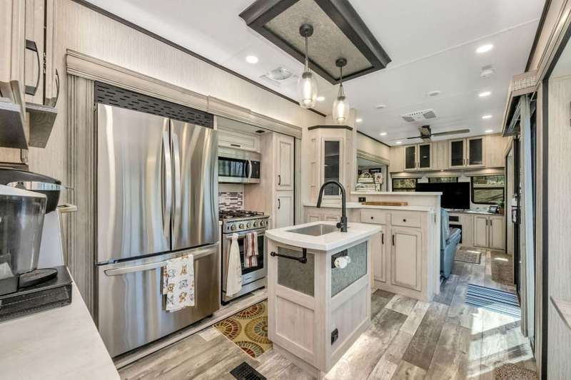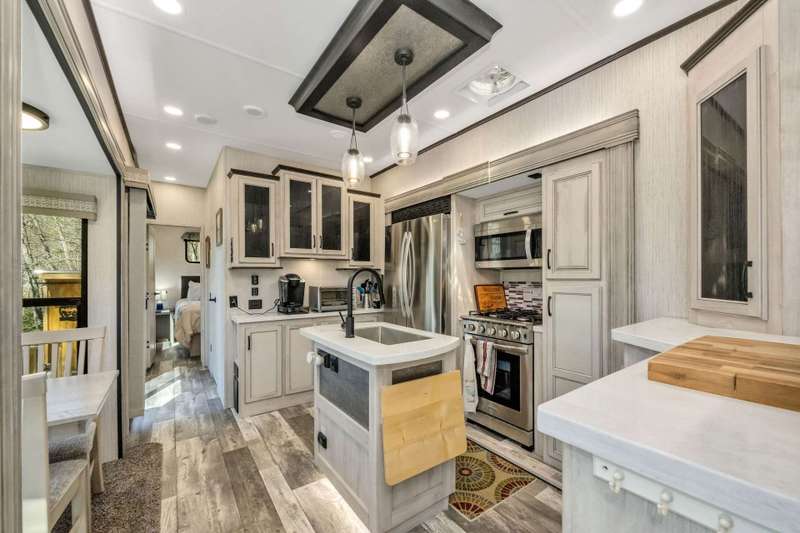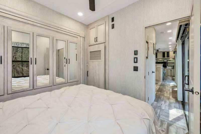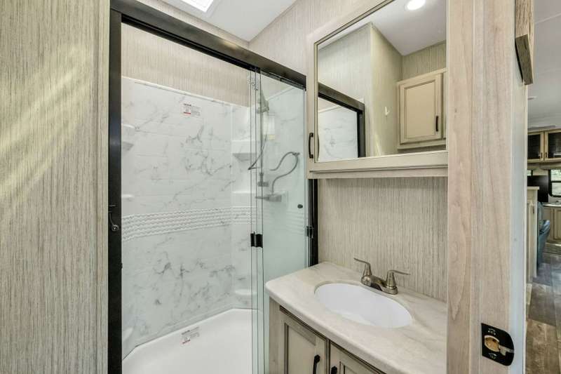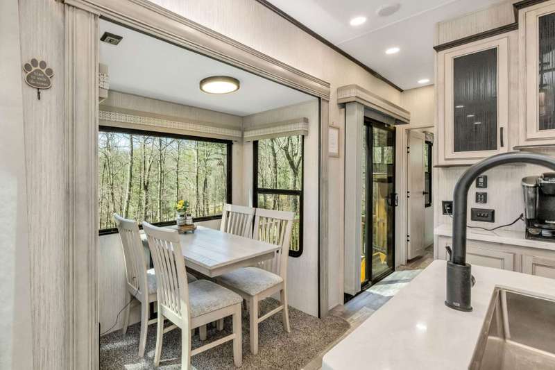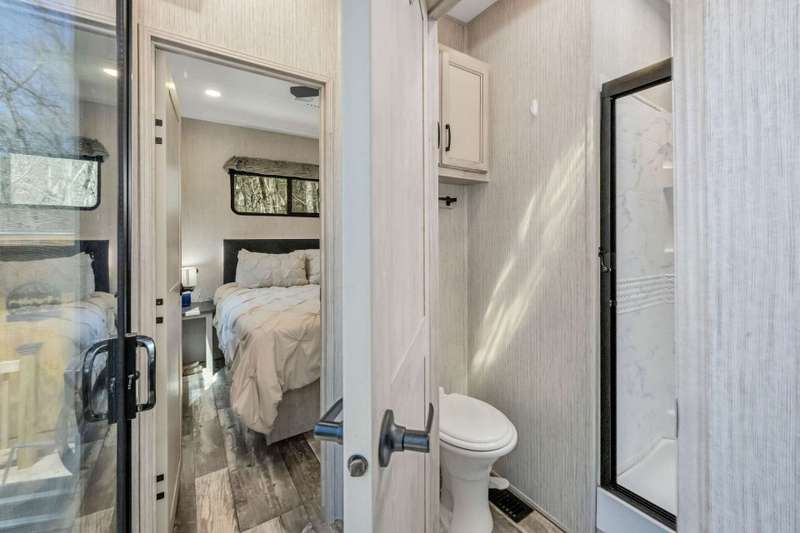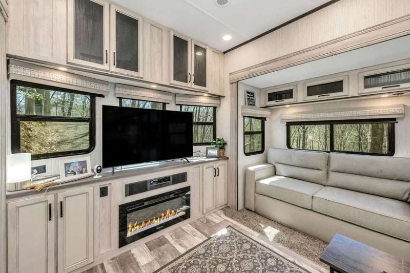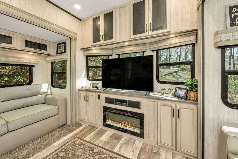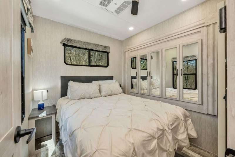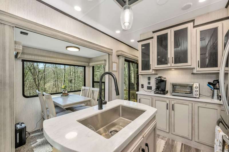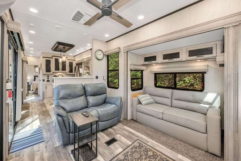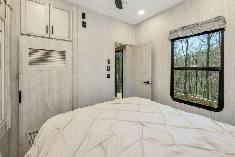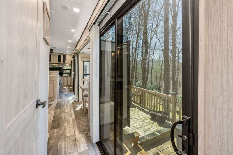 Escape to your private retreat in the serene Spicewood River community, nestled on the North Fork of the New River. Spend your days floating or fishing from the neighborhood river access and unwind in the evenings on the deck or gathered around the fire pit under the starry sky. Experience the enchanting seasonal views of Three Top Mountain, with the potential for year-round vistas through thoughtful tree trimming. This low-maintenance Park Model is designed for stress-free living, offering you the perfect home away from home. Step inside through one of two sliding glass doors and be greeted by a spacious living area where modern rustic charm meets comfort. The electric fireplace enhances the cozy ambiance, taking the chill off cool High Country mornings and evenings. With two sleeper sofas and a reclining leather loveseat, there's plenty of room for guests to relax. The kitchen boasts full-size stainless steel appliances, abundant cabinetry, and generous counter space, making meal prep a breeze. Enjoy casual dining in the cozy dining nook surrounded by windows overlooking the wooded setting. The comfortable bath with a shower is one of two on the property. Retreat to the bedroom, featuring a queen bed, ample storage, and a wall of closets. Additional storage under the bed is accessible from the outside, and a dedicated closet offers washer/dryer hookups for added convenience. Just outside, off the deck, you'll find a second bathroom with a shower and a laundry area with a full-size washer and dryer. Live your Blue Ridge Mountain dream from this ideally located getaway, perfectly positioned near West Jefferson, Lansing, Mount Rogers, and Grayson Highlands Park offering dining, shopping, golfing, hiking, and so much more! Additional parking for a guest camper at the top of the lot. Invite your friends to come visit and hook up to the Mountain Life with this 2023 Forest River Sierra Destination-37'10 x 8' retreat with 382 square feet of living space. Call today for additional information or an appointment to view our listing B235.