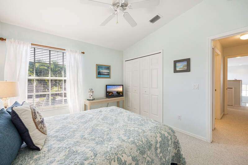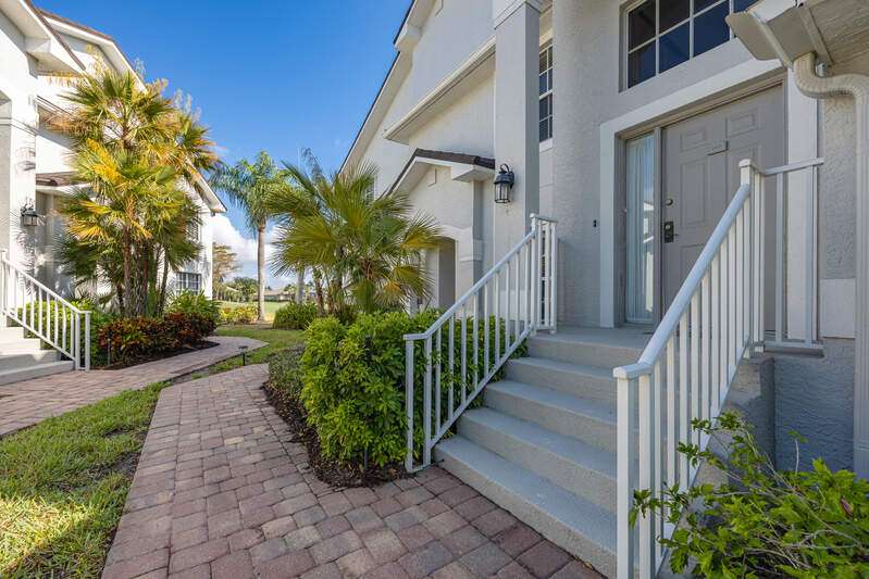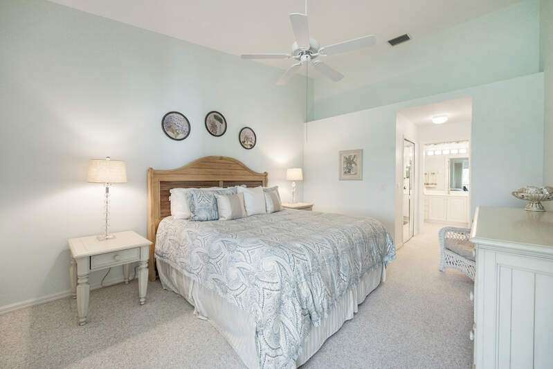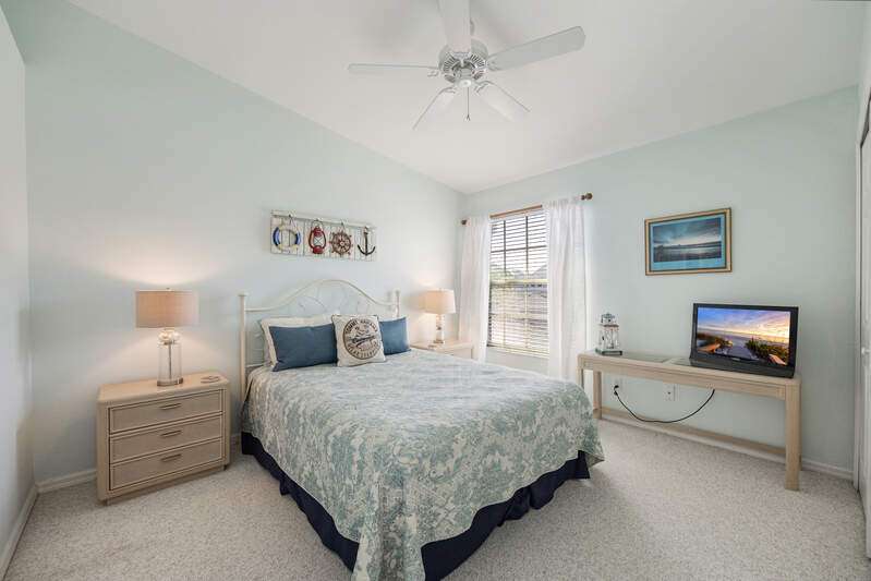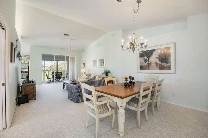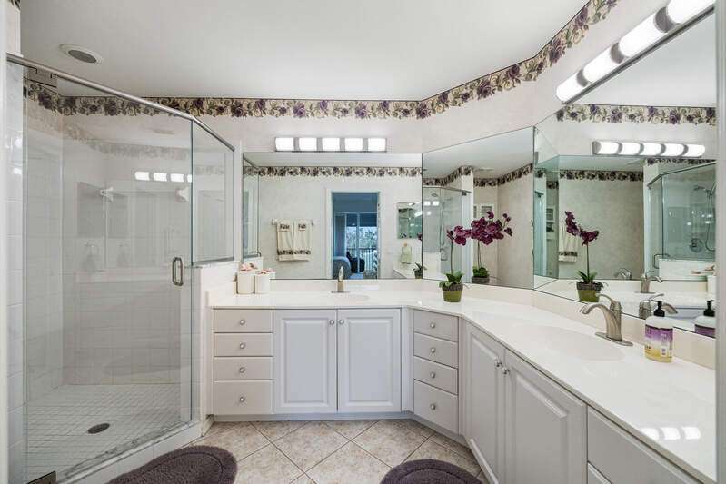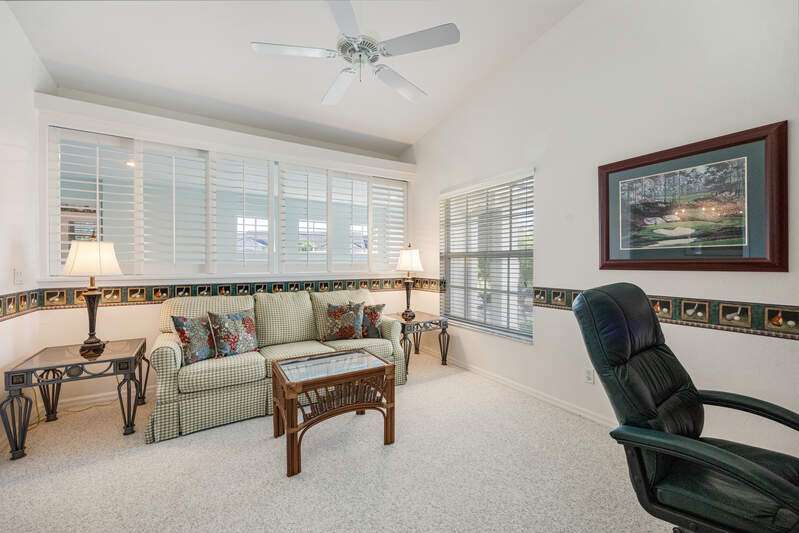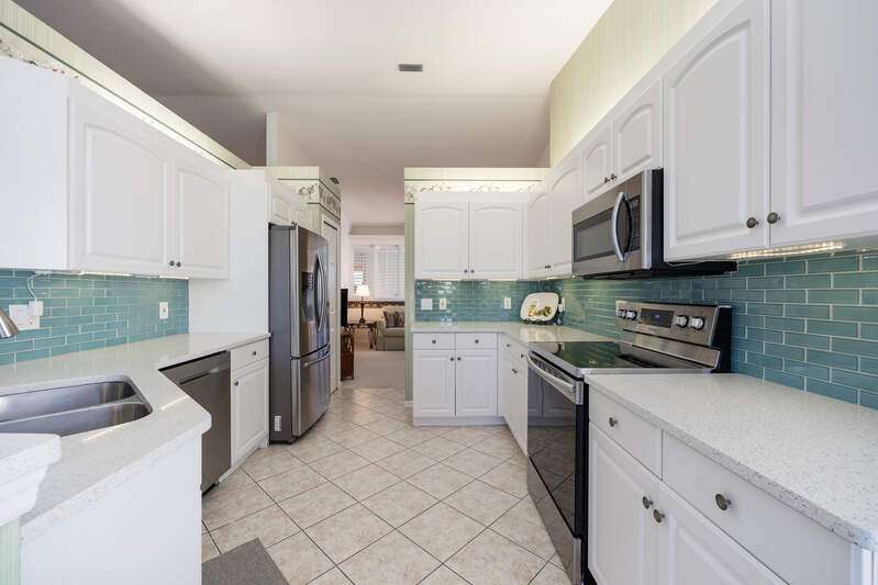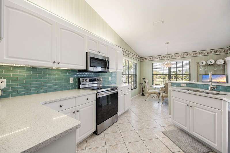 Rarely available 2nd-floor condo in the coveted Clubside at The Strand. Picture yourself sipping your morning coffee on the newly tiled lanai, gazing at the serene views of the golf course and sparkling lake with its fountain. Best of all, this 2-bedroom plus den condo is offered turnkey, allowing for an effortless transition to your new Florida lifestyle. Plantation shutters provide privacy for the versatile den, while the updated kitchen shines with Samsung stainless steel appliances, elegant quartz countertops, a new sink and faucet, stylish backsplash, and subtle undercounted lighting. Retreat to the primary bathroom with its sleek frameless shower door, and appreciate the brand-new faucets and light fixtures in both bathrooms. Guests will enjoy their privacy in the ensuite bedroom with its own bathroom, thanks to the desirable split floorplan. Cathedral ceilings soar above, creating an airy and light-filled ambiance. Added conveniences include a relatively new (2.5 years) A/C unit, hurricane shutters and the peace of mind of a 3-year-old stone coat metal roof with a 50-year lifespan. The attached, generous 2-car garage offers ample space. Beyond your doorstep, The Strand offers an unparalleled lifestyle just a short drive from the beach, with shopping and restaurants conveniently close. Dive into an active social scene with three 9-hole golf courses, tennis, pickleball, a Jr. Olympic pool, three restaurants, and a state-of-the-art fitness center. Forge new friendships while enjoying the pool, bocce, and croquet.