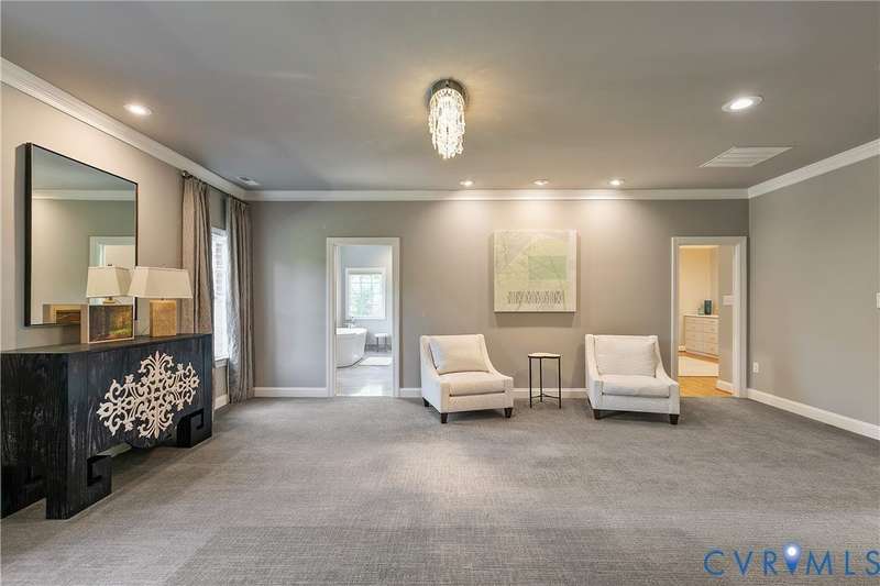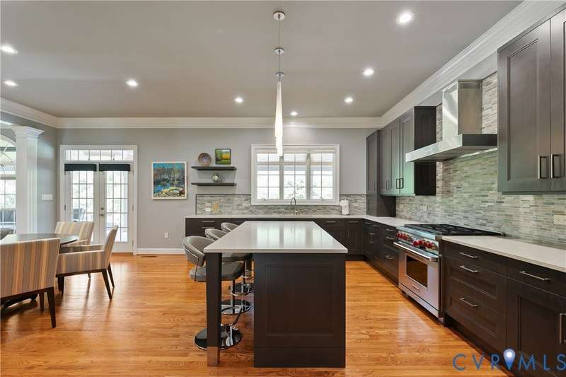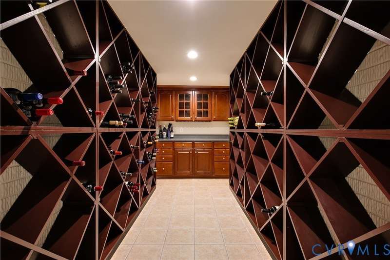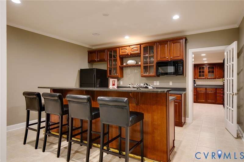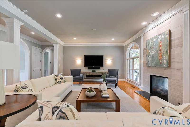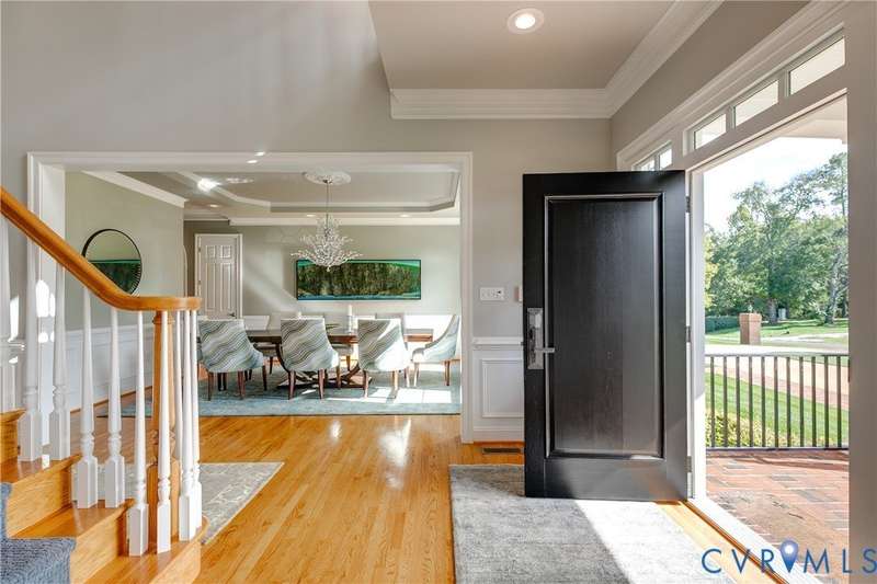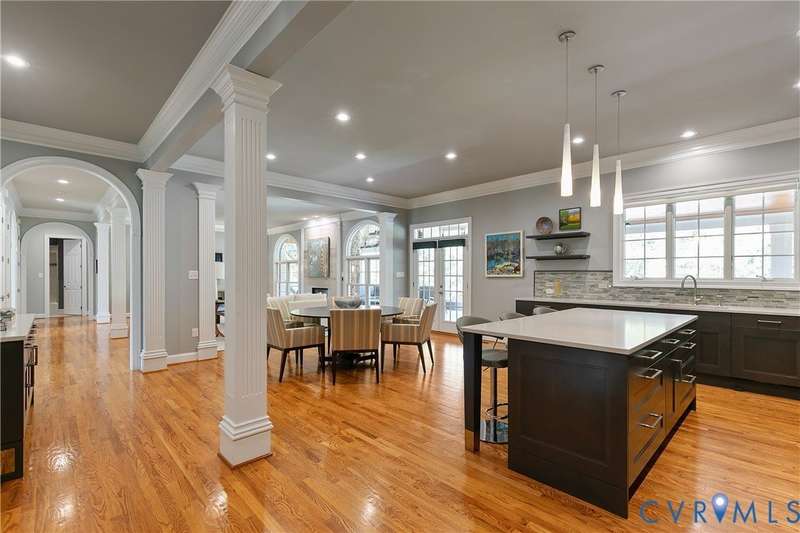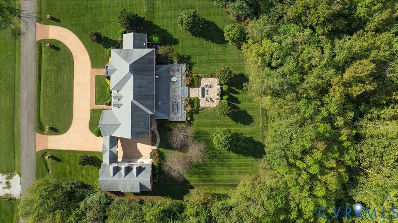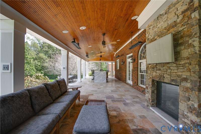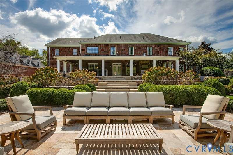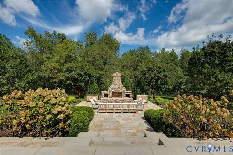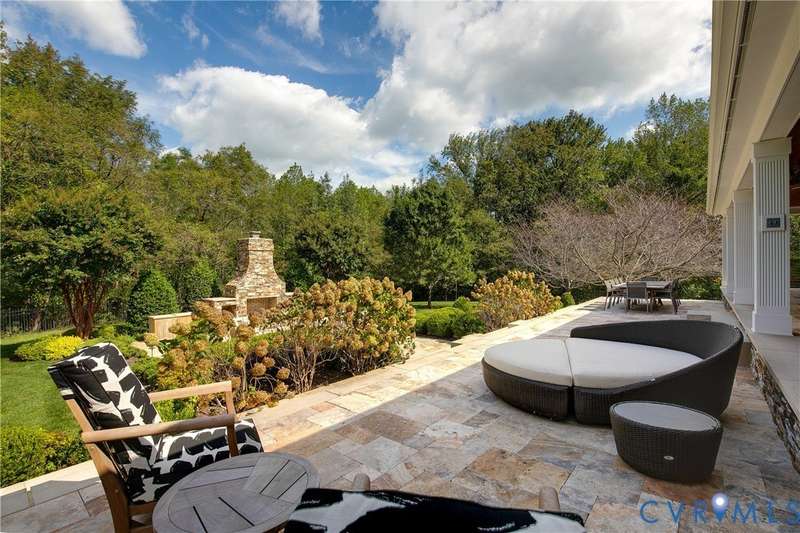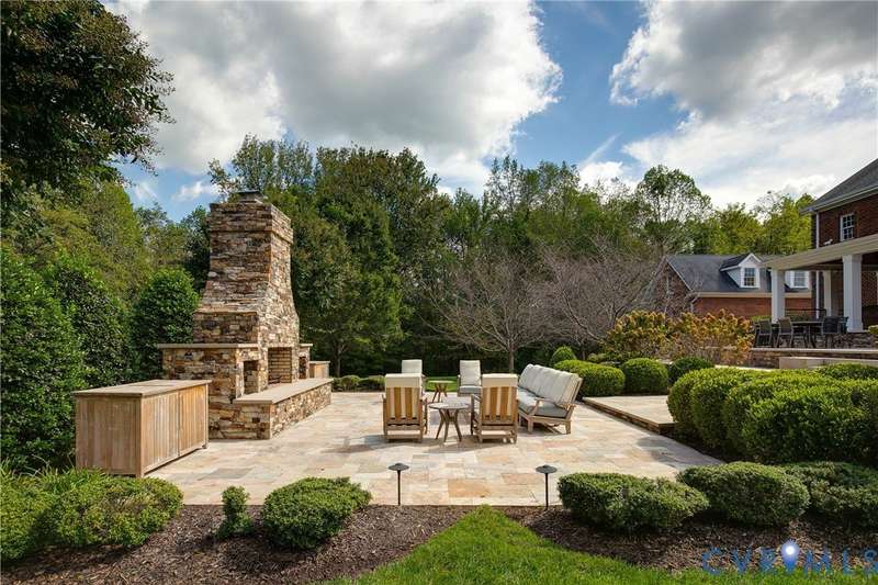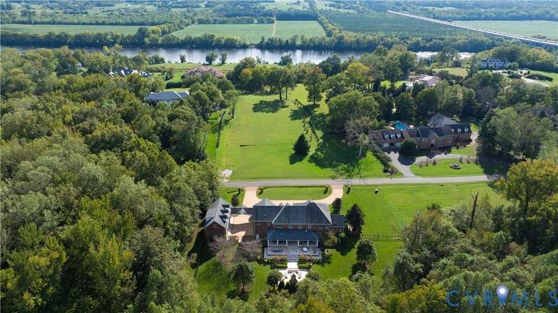 Welcome to this stately brick Colonial set on over 5 acres of professionally landscaped, private grounds in the gated community of Pembroke Farms. Enjoy exclusive neighborhood access to a wide, navigable stretch of the James River conveniently located on the River Road Corridor. Spanning three finished levels, this home offers 5 bedrooms, numerous formal and informal living spaces and multiple flex rooms that could serve a variety of purposes. The thoughtfully designed interior includes a first floor with 10 ft ceilings, a formal living and dining room, an office, a sitting room enveloped by windows, and a large family room that seamlessly opens to the renovated gourmet kitchen with quartz countertops, marble backsplash, custom cabinetry, and top-tier appliances. A butler's pantry/drop zone connects to the attached garage for everyday convenience. Upstairs, the primary suite is a private retreat with a spa-inspired en suite bath, a dressing room, and a custom walk-in closet. Three spacious bedrooms complete the second floor, each with walk-in closets, and two featuring en suite baths. The lower level has a rec room with projector, a kitchenette with bar style seating, and a wine cellar-perfect for entertaining. Additionally, there is another kitchenette, one bedroom and full bath, two flex rooms as well as ample storage closets. This exceptional home offers an 8-bay garage, 4 bays attached and 4 bays detached. The detached 4 bay garage includes car lifts and over 900 sq. ft. of unfinished space-already roughed in for a bath-ideal for a future guest suite or studio. The outdoor living space is equally impressive with a multi-tiered travertine terrace, complete with a grilling station, space heaters, and a striking stone fireplace, all overlooking serene, manicured grounds. A rare offering of craftsmanship, privacy, and luxury in one of Richmond's most sought-after riverfront enclaves.