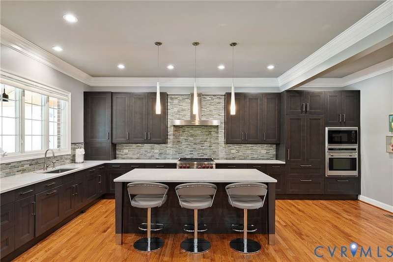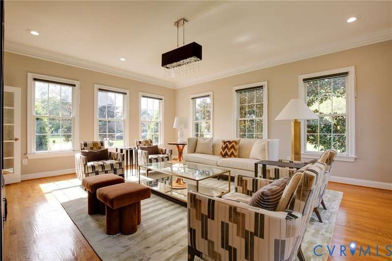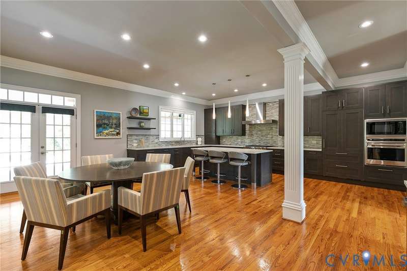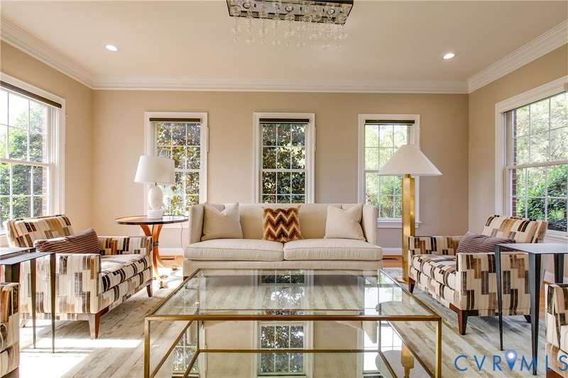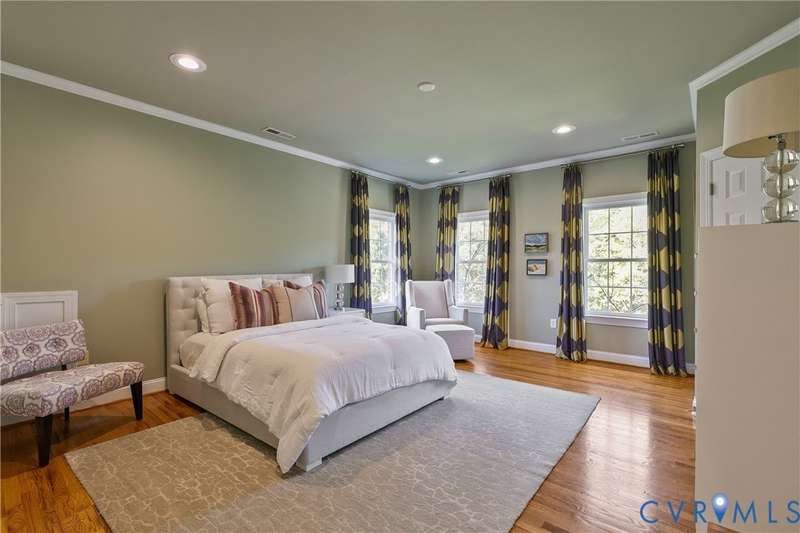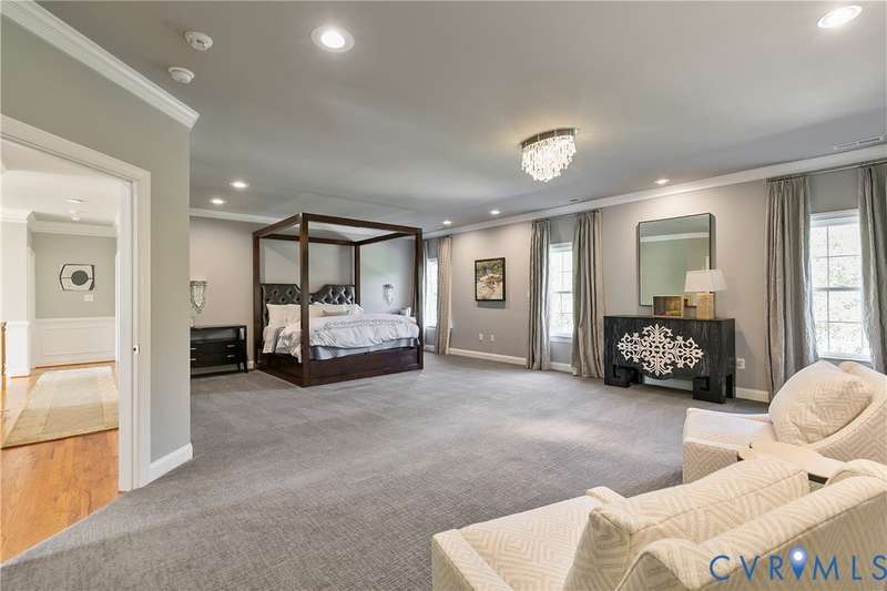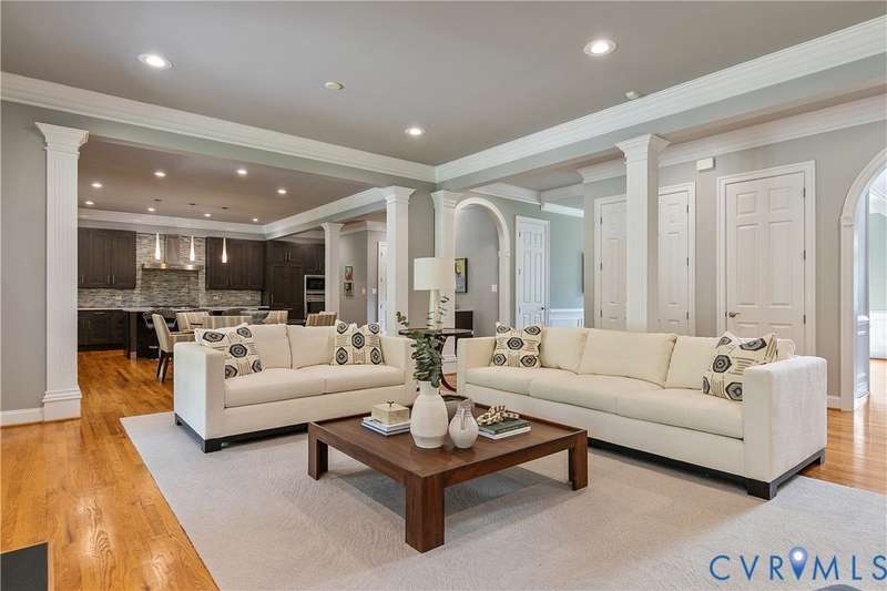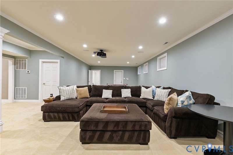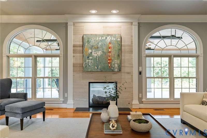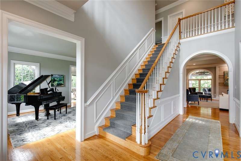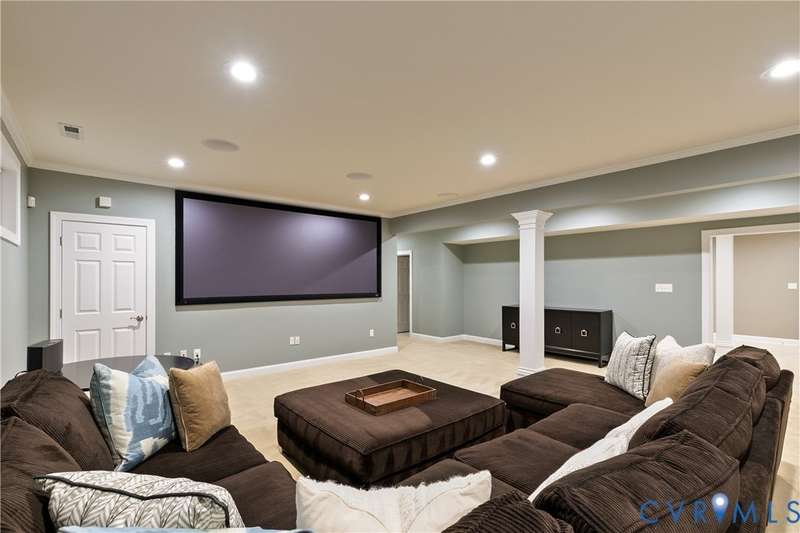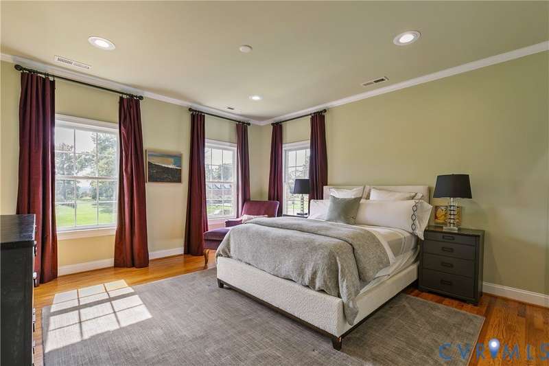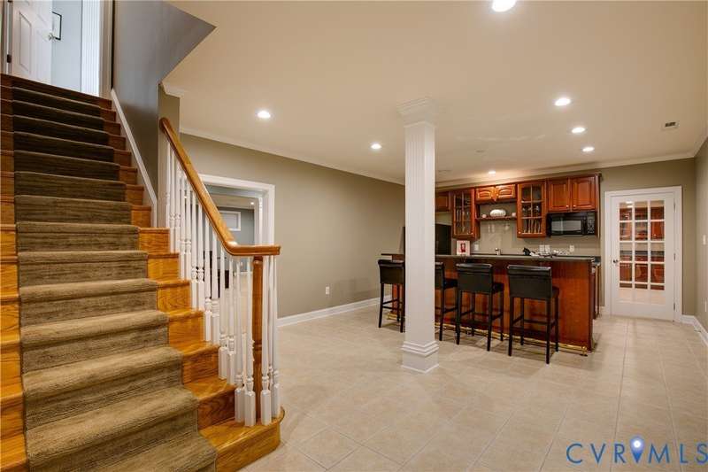 Welcome to this stately brick Colonial set on over 5 acres of professionally landscaped, private grounds in the gated community of Pembroke Farms. Enjoy exclusive neighborhood access to a wide, navigable stretch of the James River conveniently located on the River Road Corridor. Spanning three finished levels, this home offers 5 bedrooms, numerous formal and informal living spaces and multiple flex rooms that could serve a variety of purposes. The thoughtfully designed interior includes a first floor with 10 ft ceilings, a formal living and dining room, an office, a sitting room enveloped by windows, and a large family room that seamlessly opens to the renovated gourmet kitchen with quartz countertops, marble backsplash, custom cabinetry, and top-tier appliances. A butler's pantry/drop zone connects to the attached garage for everyday convenience. Upstairs, the primary suite is a private retreat with a spa-inspired en suite bath, a dressing room, and a custom walk-in closet. Three spacious bedrooms complete the second floor, each with walk-in closets, and two featuring en suite baths. The lower level has a rec room with projector, a kitchenette with bar style seating, and a wine cellar-perfect for entertaining. Additionally, there is another kitchenette, one bedroom and full bath, two flex rooms as well as ample storage closets. This exceptional home offers an 8-bay garage, 4 bays attached and 4 bays detached. The detached 4 bay garage includes car lifts and over 900 sq. ft. of unfinished space-already roughed in for a bath-ideal for a future guest suite or studio. The outdoor living space is equally impressive with a multi-tiered travertine terrace, complete with a grilling station, space heaters, and a striking stone fireplace, all overlooking serene, manicured grounds. A rare offering of craftsmanship, privacy, and luxury in one of Richmond's most sought-after riverfront enclaves.