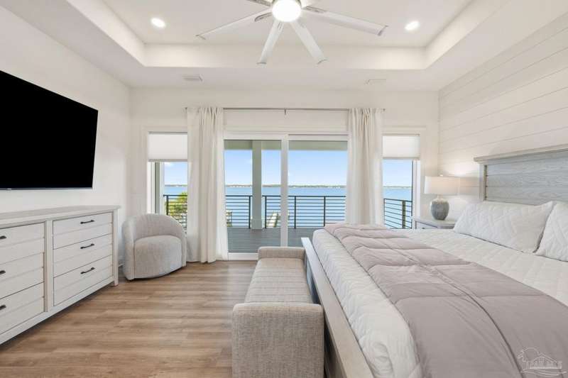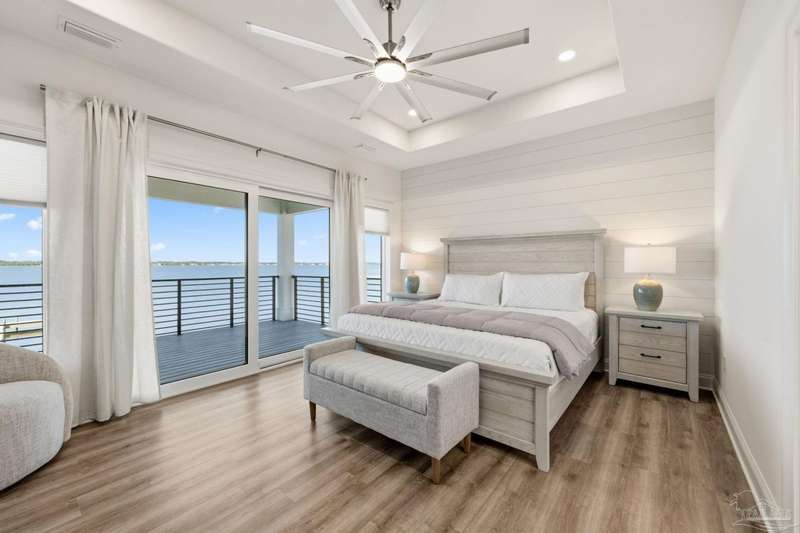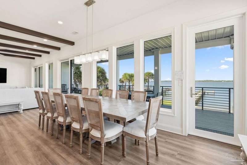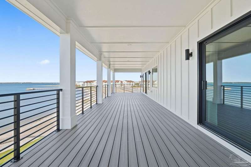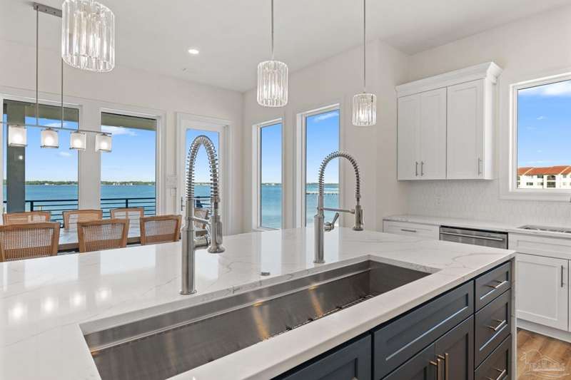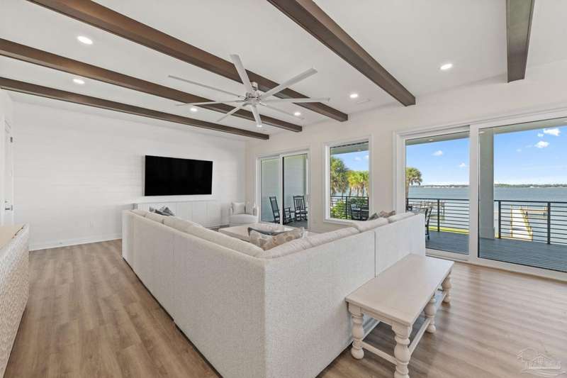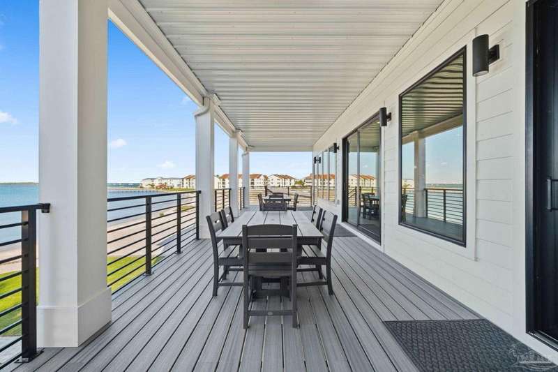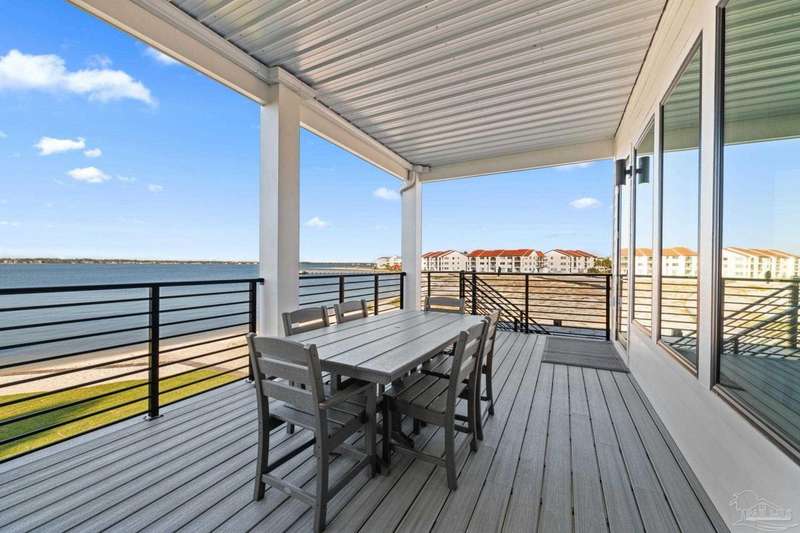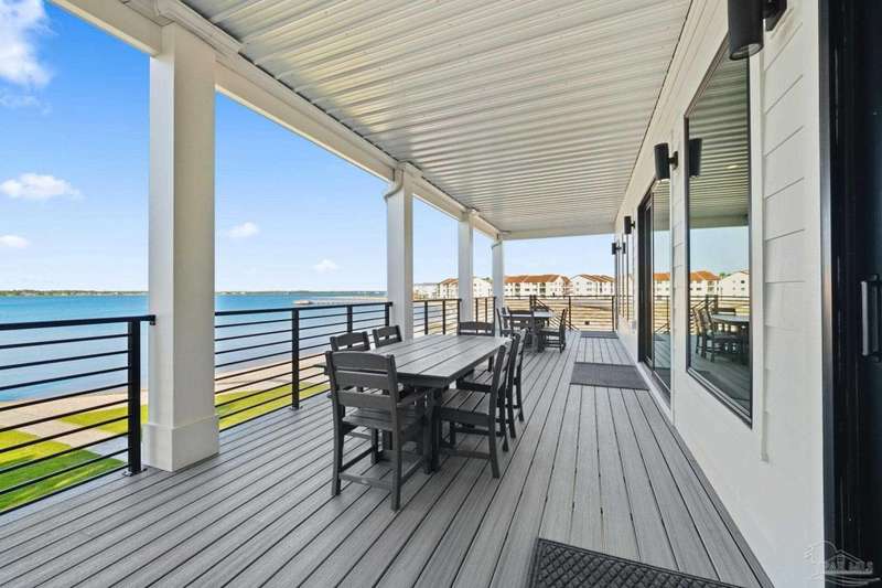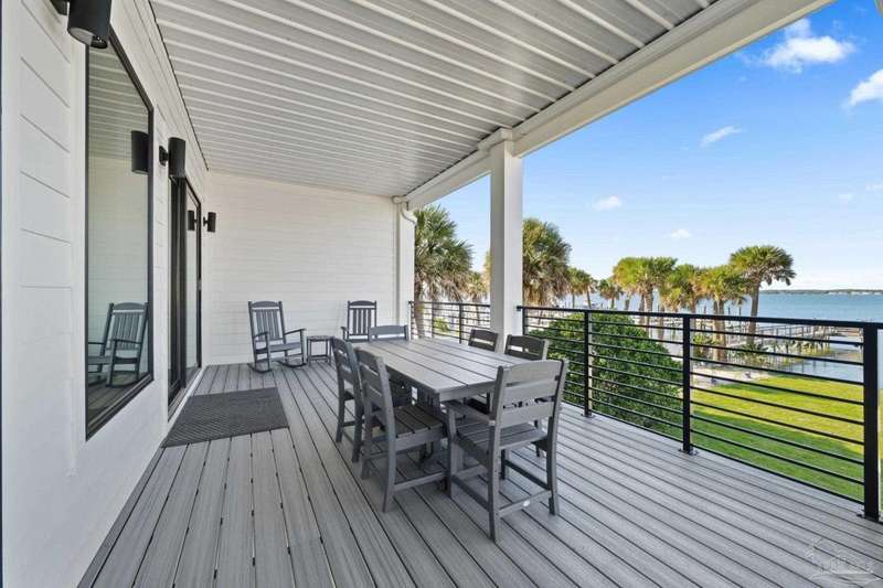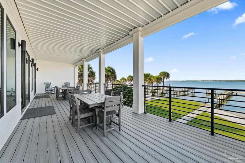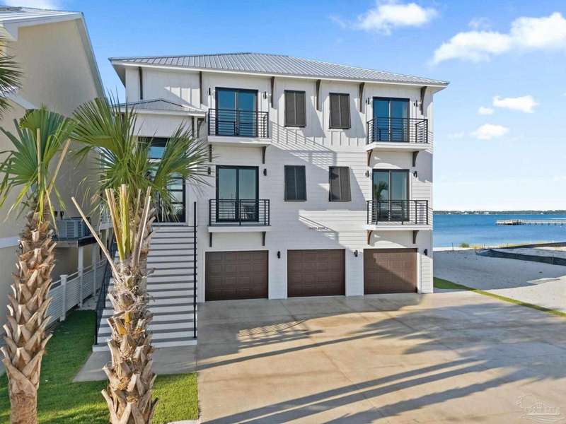 Brand new construction on a deep water lot with a dock on the Sound at beautiful Navarre Beach! This Bock Construction home was just completed and is ready for you. This home is being sold fully furnished and could be an amazing waterfront home with a place to keep your boat in your own backyard or as an amazing turnkey vacation rental. Excellent water depth at the dock. Enjoy multiple 50 feet waterfront decks to watch the birds and the dolphins while being steps away from a relaxing great room with room for everybody. Plenty of storage underneath for all your toys and beach gear along with an elevator so everyone has easy access to this beautiful home. The outside is as beautiful as the gorgeous interior and features the dock, a sodded yard, and a white sandy beach out back!