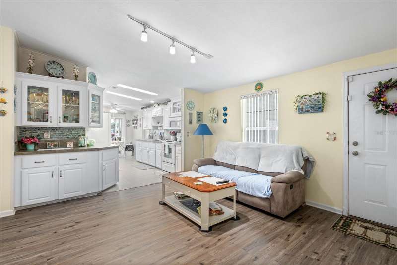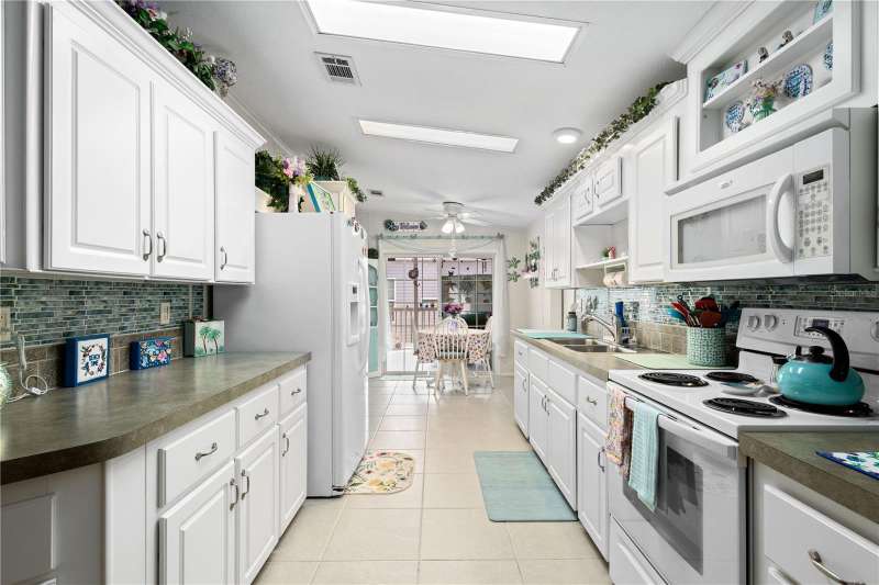 North River Estates is a charming 55+ community of manufactured homes - perfect as a permanent Florida residence or a winter getaway! A rare find, it features a 4-car tandem garage —ideal for car enthusiasts, a workshop, or abundant storage—plus a 2-car carport for extra covered parking. This charming and spacious 3 bedroom, 2 bath floorplan features an updated eat-in kitchen and a slider that leads to a spacious covered and screened porch area from which you can enjoy the lovely landscaped yard and tree-line beyond. Primary features an ensuite bath with separate jetted tub and shower. Spacious corner lot on a quiet cul-de-sac is maintained by the association. The community features a pool, clubhouse with a fitness room, library, games room, billiards and gathering space. North River Estates is a conveniently located and vibrant community, a must-see property that combines many low-maintenance features—making this home a smart and stress-free investment.