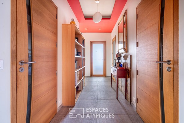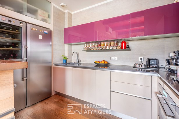 Upstairs, accessible via a metal staircase, a veranda with a summer kitchen leads to a 100 m2 rooftop. The fully furnished and landscaped rooftop offers a 360° panoramic view.