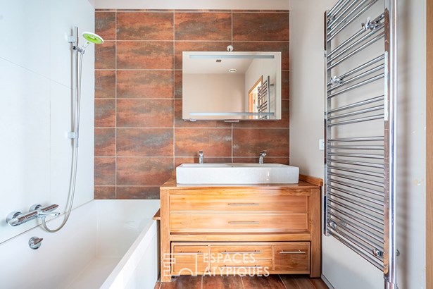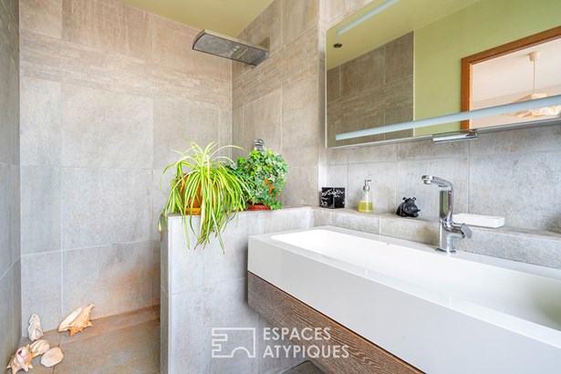 The entrance opens onto a 55 m2 living room at 3.40 meters above ground level, converted into a living and dining room with generous volumes. The numerous windows provide beautiful light, accentuated by a west-facing exposure. A semi-open kitchen completes the living area.