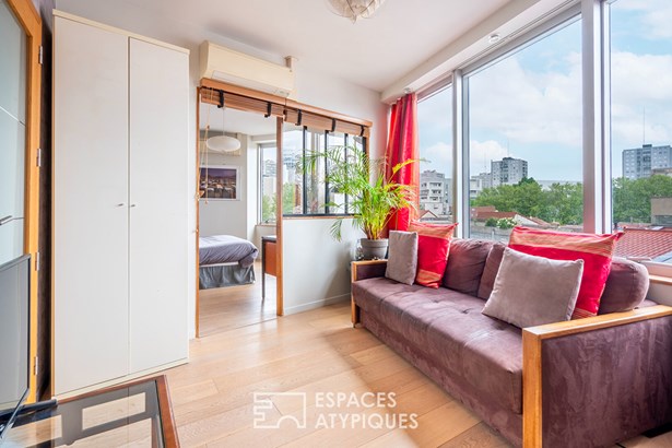 Located in Les Lilas, near Serge Gainsbourg, this 120 m2 (117.22 m2 Carrez law) residential loft boasts a rooftop of approximately 100 m2 and a 15 m2 veranda.