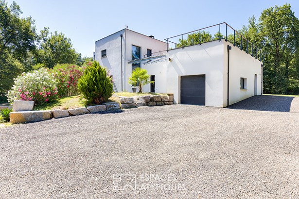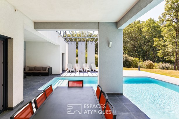 Just a few minutes from Toulouse and close to amenities, this contemporary architect-designed house from 2014 offers approximately 200 sqm of living space, nestled within a hectare of greenery. Designed to combine family privacy and conviviality, this property is distinguished by its 6 main rooms, including 5 bedrooms, an office, 1 bathroom, 2 shower rooms, and carefully landscaped outdoor spaces. It sits on a wooded plot of approximately 1 hectare, featuring a salt-water swimming pool, a garage, and a 250 sqm basement offering numerous possibilities. From the entrance, the house reveals a refined and bright atmosphere, enhanced by a ceiling height of over 5 meters, which gives the place a feeling of comfortable space. The spacious living room, bathed in natural light, blends harmoniously with a semi-open, fully equipped kitchen. This central living space opens seamlessly to the outdoors, naturally extending the interior life towards the terrace and the swimming pool, for moments of sharing.