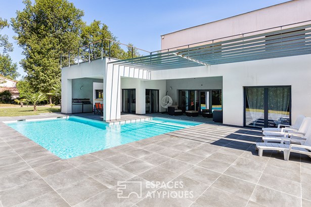 The ground floor also offers a master suite, with its own shower room, guaranteeing comfort and privacy. Two additional bedrooms, a bathroom, an office, a practical laundry room as well as two separate toilets complete this level, providing optimal functionality for everyday life. Upstairs, two other bedrooms share a shower room with toilet and benefit from privileged access to the roof terrace, a true outdoor living space with a soothing view of the garden. Outside, the large terrace can accommodate family and friends for al fresco meals, while the salt-water swimming pool, a true extension of the house, promises relaxation and refreshment throughout the sunny days. Located on a landscaped park of approximately 1 hectare, this property benefits from a calm, green environment with no overlooked vis-a-vis, conducive to relaxation.