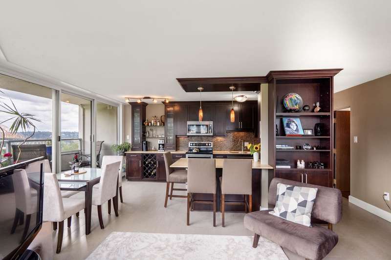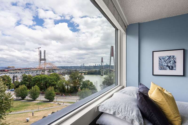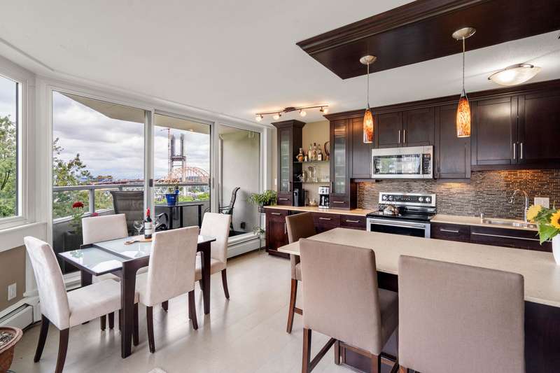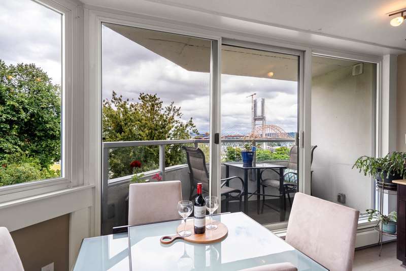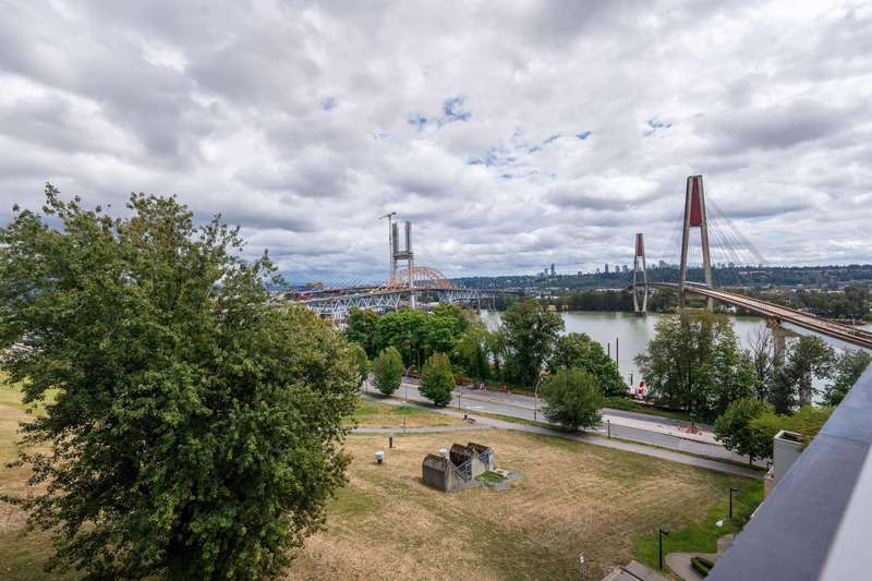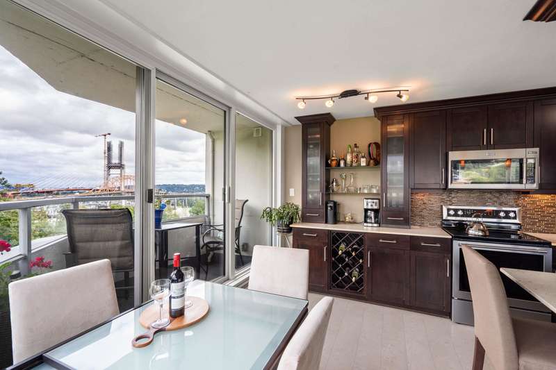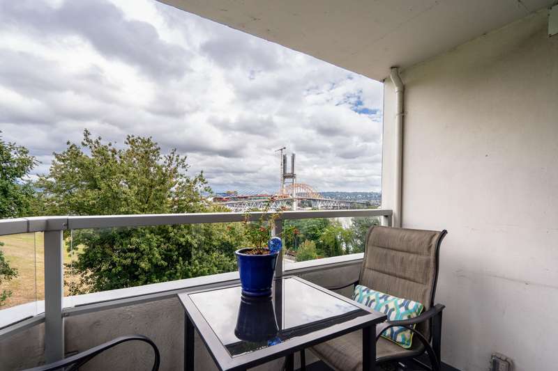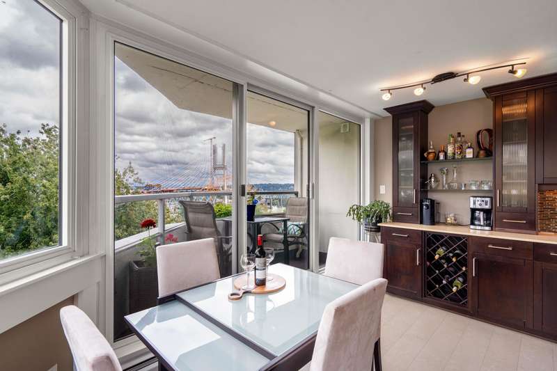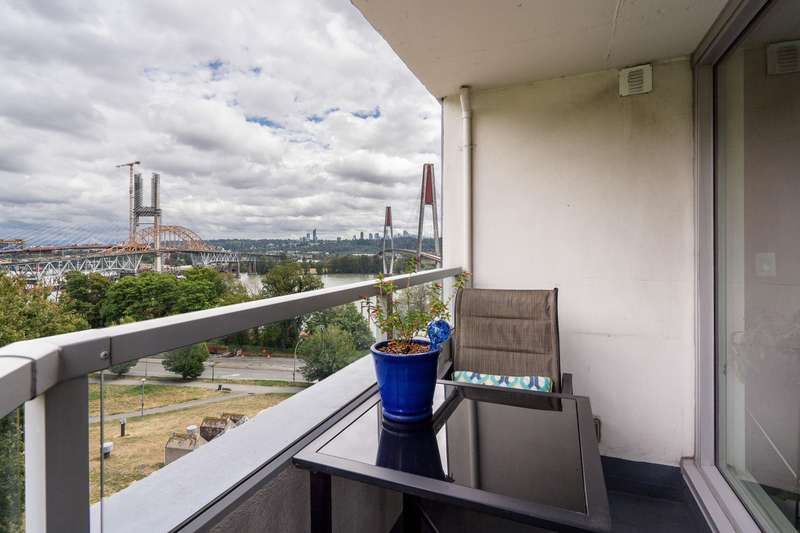 First comes the spell binding views from this top quality home. Many custom upgrades -wood cupboards, built-in china and other cabinets-top of the line products used-Sile Stone Yellow Nile Counter Tops - Torely Cork Flooring - the list goes on - Plus this 8th floor home is move in ready! The concrete construction throughout the building and conscientious Strata care all add up to a well maintained quiet Building. So close to transportation - schooling-shopping - skytrain - easy access to new bridge connecting Surrey and points East. This home will last a lifetime and provide the home you will enjoy in comfort. Additionally, there are the 2 secured parking places. Call today to view it all before it is "All Gone"!