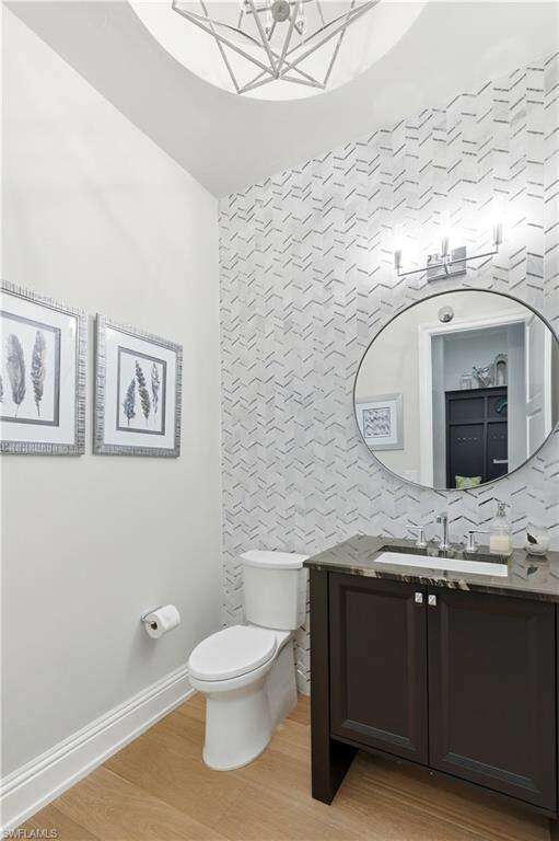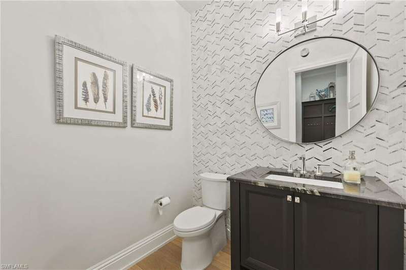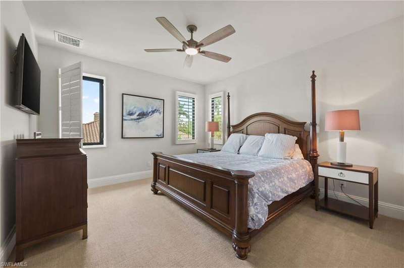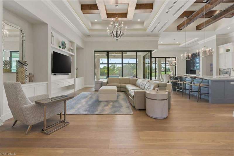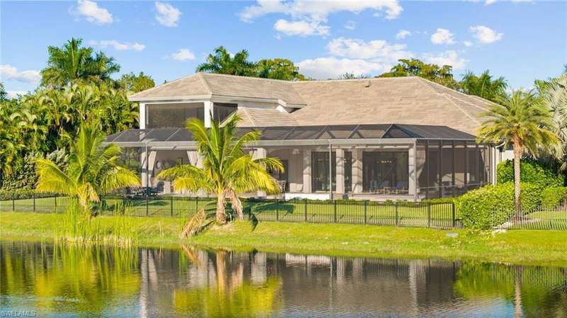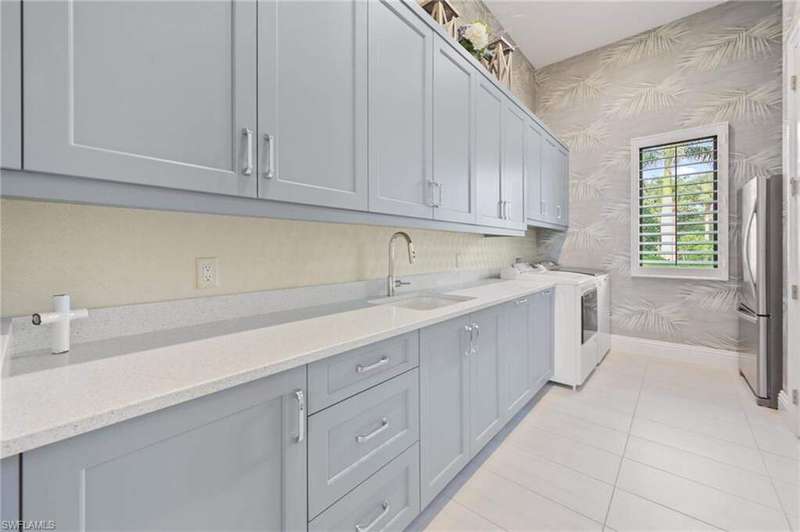 IMMEDIATE GOLF MEMBERSHIP AVAILABLE with this stunning custom home built by Florida Lifestyle. Elevated 16'1 feet above sea level and equipped with impact-resistant glass and a full-house generator, this home was meticulously designed for peace of mind and modern comfort. Every detail has been thoughtfully curated-from wide-plank Legno Bastone flooring to a 1,000-gallon propane tank, water filtration system, elevator, full security setup, and Sonos sound throughout. Beautifully furnished by Clive Daniel and Norris, this home is move-in ready for effortless Florida living. The chef's kitchen is an entertainer's dream, featuring dual porcelain islands, Thermador appliances, a wine refrigerator, and a spacious auto-lit walk-in pantry. A nearby bar area includes an additional wine fridge and seamlessly connects to the dining space for relaxed hosting.The luxurious primary suite offers a tranquil retreat with a custom ceiling accent, blackout shades, dual walk-in closets, and a spa-like bath with new shower heads and dual water closets. Two additional en-suite guest rooms are located on the main level in a split-bedroom layout, providing ultimate privacy.Take the elevator upstairs to a spacious fourth bedroom with double vanities and ample closet storage. This upper-level guest suite also features a lounge area, TV space, kitchenette, bar, and Sub-Zero wine cooler. The upstairs private screened lanai offers gorgeous golf views. On the main level, enjoy a generously sized laundry room with pull-out bins, extra cabinetry, a storage closet, and an additional refrigerator. The oversized four-car garage includes built-in storage, a refurbished four-seat "Hole In One" golf cart, and yet another refrigerator. For even more storage, a built-in mudroom with cubbies keeps everything organized. Entertain in style on the expansive lanai, featuring a beautiful wood ceiling, gas fireplace, covered lounging and dining areas, an air-conditioned pool bath, and a two-story panoramic cage. The fully equipped outdoor kitchen includes three TVs and custom drapes, creating an intimate yet chic setting for outdoor living. With western exposure and breathtaking water and golf course views, you'll enjoy glorious sunsets from the gas-heated saltwater pool and spa.This home truly has it all-style, functionality, and luxury-ready for you to enjoy the ultimate Florida lifestyle.