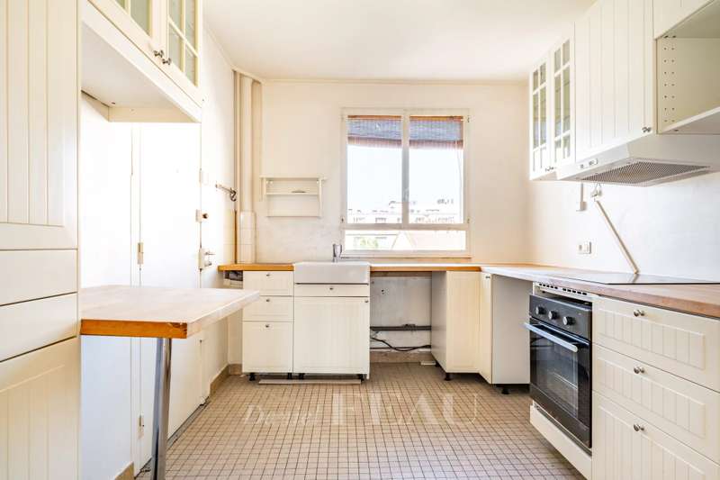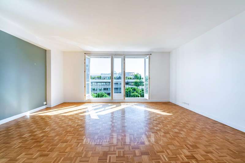 This dual-aspect apartment offering 97.80 sqm of living space as defined by the Carrez Law is on the 4th floor of a luxurious mid 20th century building located in a peaceful street near Porte de Saint Cloud. East and west facing, it includes a spacious living/reception room enjoying open views over leafy greenery, a kitchen, three bedrooms (two overlooking a garden), a bathroom and a separate wc. Fitted storage space. With a cellar. A courtyard lock-up garage may be acquired for a further 30000€.