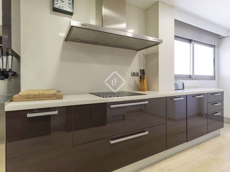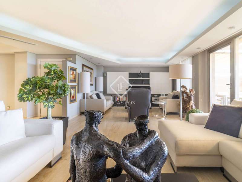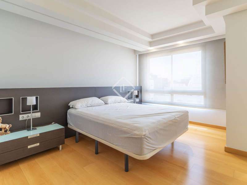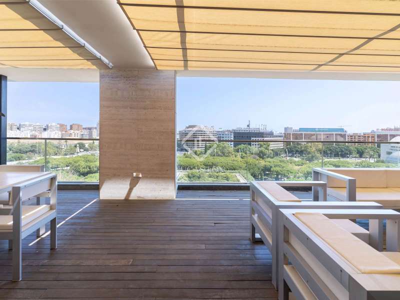 This incredible penthouse is located on a high floor of an elegant building in the Gran Vía neighbourhood of Valencia, with perfectly maintained common areas and 24-hour concierge and security service. It is located in an exclusive location in the Eixample, opposite the wonderful Turia River Gardens, one of the largest green areas in the city, but at the same time very close to the city's commercial area. The property benefits from a current renovation , with a rectangular floor and hardly any corridor, to make the most of all the spaces. We enter directly through the living-dining room, floor and generously sized, with several areas and huge windows that lead access to the impressive terrace of approximately 50 m². The terrace is the ideal size to enjoy the incredible Mediterranean climate, with enough space for a table with chairs and a bedroom area and has electric awnings to protect it from the sun. Enjoy privileged and incredible unobstructed views of the garden areas of the city, while enjoying great privacy. Further ahead is the kitchen, floor in shape, adjacent to the living room, with a large worktop area and plenty of storage space, which is equipped with all the high-end appliances . It has an ironing and utility room room and service entrance. In the day area there is a guest toilet. The night area is located at the back of the property, clearly separated from the day area for greater comfort and privacy on a day-to-day basis. It is distributed in two very large bedrooms, very bright and sunny, facing a large courtyard, both with a dressing area and both with private bathrooms. In addition, we find an study area. The property includes marble floors in the day area and natural wood floors in the bedrooms, hot/cold air conditioning through ducts in all rooms, exterior carpentry with thermal and acoustic insulation and interior carpentry made of natural wood. The property has a parking space included in the price. Please contact for more information.