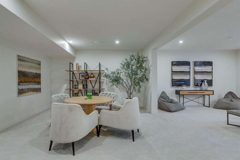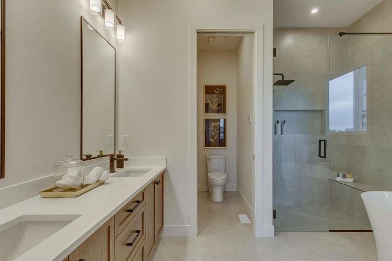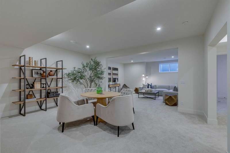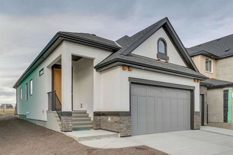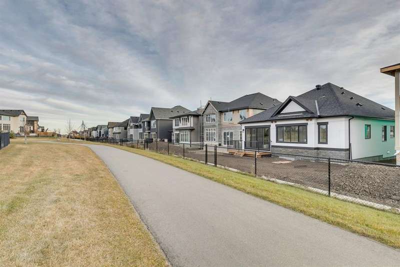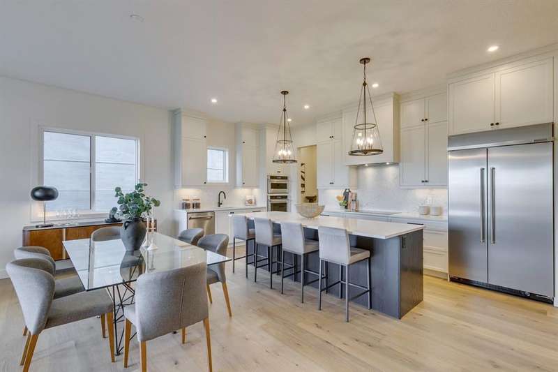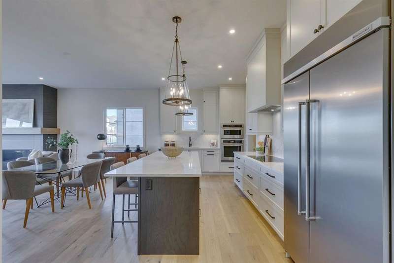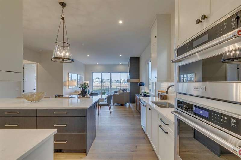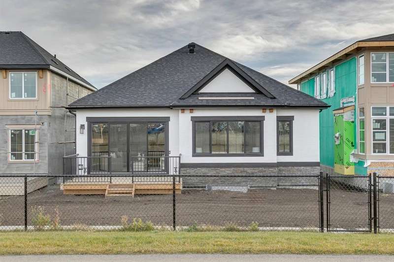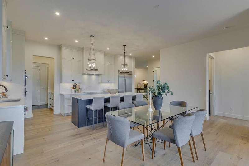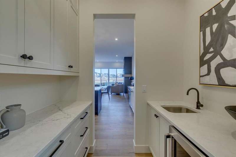 Nestled in the heart of Calgary's prestigious Mahogany Estates, this brand-new custom-built, 3,200 sq ft bungalow by Baywest Homes redefines lakeside living. With exclusive access to a semi-private dock and beach, this home offers an unparalleled lifestyle in one of the city's most sought-after lake communities. The main level, spanning nearly 1,700 square feet, boasts soaring nine-foot ceilings and wide plank luxury hardwood flooring in natural wood tones, creating a warm and inviting ambiance. The open-concept design seamlessly integrates the living, dining, and kitchen areas, making it perfect for both entertaining and everyday living. The kitchen is a chef's dream, featuring full-height white cabinetry, a striking oversized dark island, and a high-end appliance package that includes a high-end Kitchen Aid fridge-freezer and built-in oven with a convention microwave. Quartz countertops extend as a sleek backsplash, complemented by designer lighting and a butler’s pantry equipped with a bar sink and beverage fridge. The living room, with its elegant feature fireplace, opens onto a north-facing deck overlooking serene green space, complete with a gas line for effortless outdoor grilling. The master suite is a private retreat, offering a spa-like en-suite with heated tile floors, an oversized shower, a freestanding soaker tub, dual vanities, and a private water closet. A spacious walk-in closet and adjacent laundry room add to the convenience and luxury of this space. The main floor also includes a private office with glass French doors, a well-appointed mudroom, and a walk-in closet. Descending to the fully finished basement, you'll find a large recreation room, a family room, two generously sized bedrooms, and a full bathroom with heated floors. The home is thoughtfully designed with ample storage and numerous upgrades, including tankless hot water and triple-paned windows. The attached triple garage, with its 14-foot ceilings, offers ample space for a car lift and is equipped with 220V for a vehicle charging station. This property is a masterpiece of design and functionality, offering the perfect blend of luxury, comfort, and convenience. With its prime location and exclusive amenities, lakeside living in Mahogany has never been more enticing.