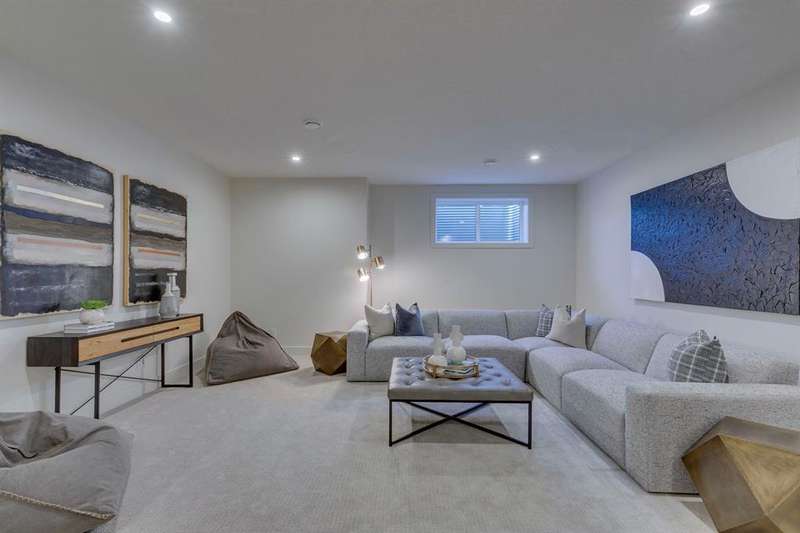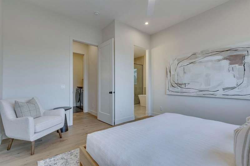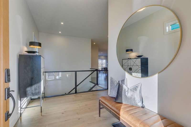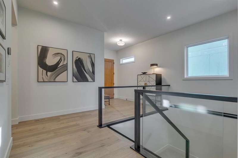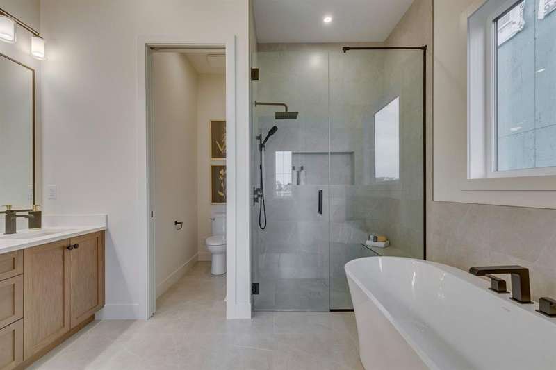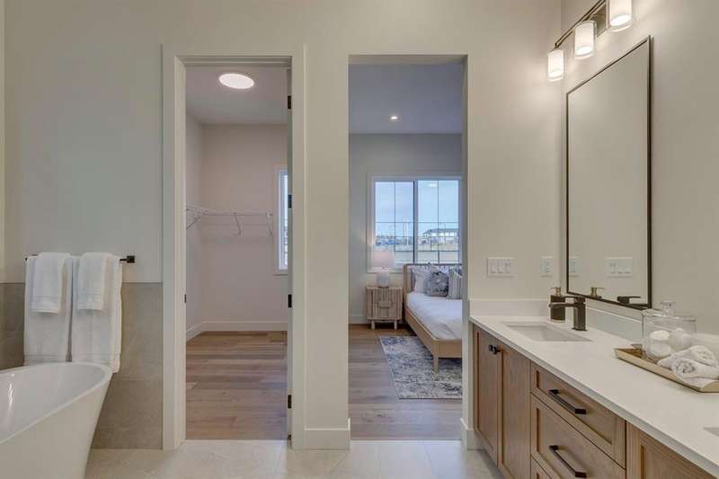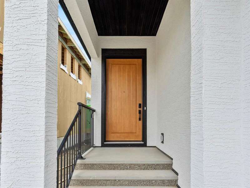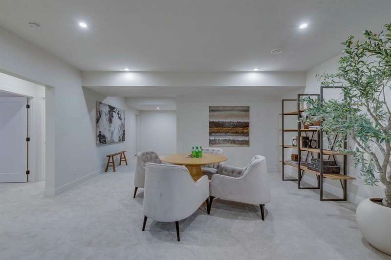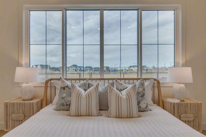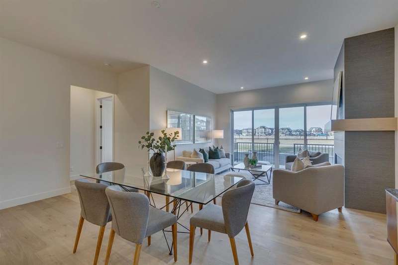Nestled in the heart of Calgary's prestigious Mahogany Estates, this brand-new custom-built, 3,200 sq ft bungalow by Baywest Homes redefines lakeside living. With exclusive access to a semi-private dock and beach, this home offers an unparalleled lifestyle in one of the city's most sought-after lake communities. The main level, spanning nearly 1,700 square feet, boasts soaring nine-foot ceilings and wide plank luxury hardwood flooring in natural wood tones, creating a warm and inviting ambiance. The open-concept design seamlessly integrates the living, dining, and kitchen areas, making it perfect for both entertaining and everyday living. The kitchen is a chef's dream, featuring full-height white cabinetry, a striking oversized dark island, and a high-end appliance package that includes a high-end Kitchen Aid fridge-freezer and built-in oven with a convention microwave. Quartz countertops extend as a sleek backsplash, complemented by designer lighting and a butler’s pantry equipped with a bar sink and beverage fridge. The living room, with its elegant feature fireplace, opens onto a north-facing deck overlooking serene green space, complete with a gas line for effortless outdoor grilling. The master suite is a private retreat, offering a spa-like en-suite with heated tile floors, an oversized shower, a freestanding soaker tub, dual vanities, and a private water closet. A spacious walk-in closet and adjacent laundry room add to the convenience and luxury of this space. The main floor also includes a private office with glass French doors, a well-appointed mudroom, and a walk-in closet. Descending to the fully finished basement, you'll find a large recreation room, a family room, two generously sized bedrooms, and a full bathroom with heated floors. The home is thoughtfully designed with ample storage and numerous upgrades, including tankless hot water and triple-paned windows. The attached triple garage, with its 14-foot ceilings, offers ample space for a car lift and is equipped with 220V for a vehicle charging station. This property is a masterpiece of design and functionality, offering the perfect blend of luxury, comfort, and convenience. With its prime location and exclusive amenities, lakeside living in Mahogany has never been more enticing.