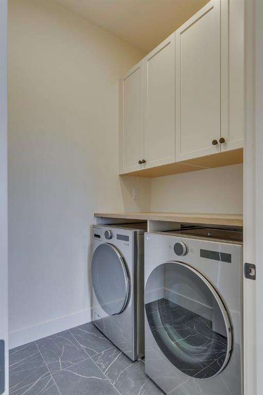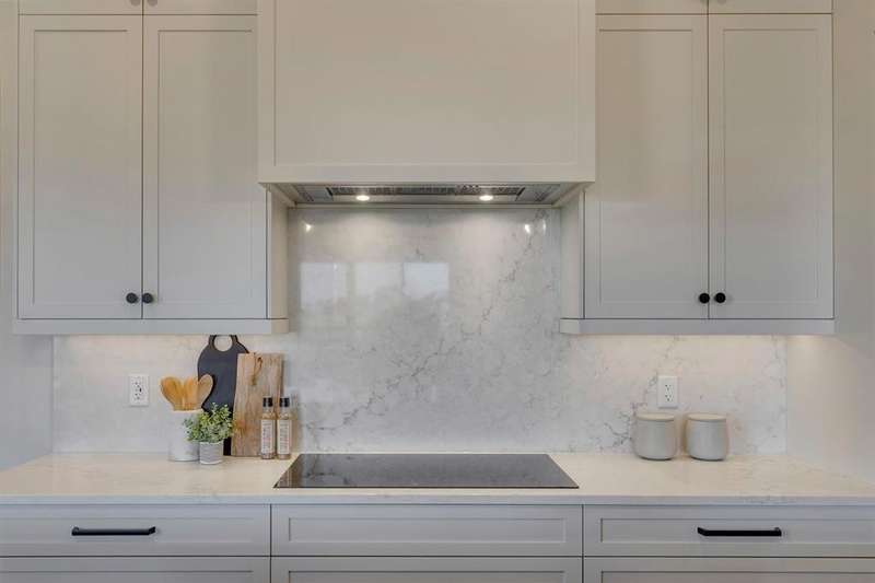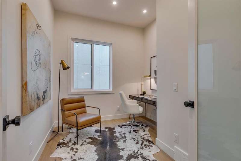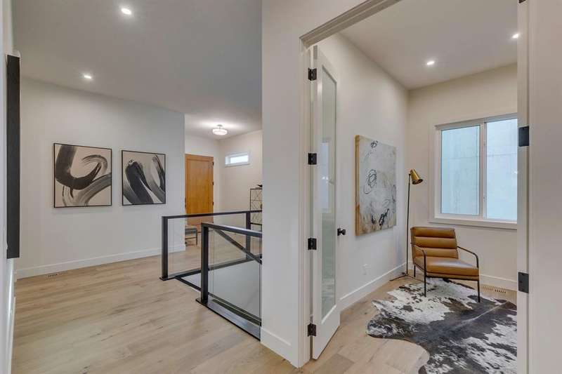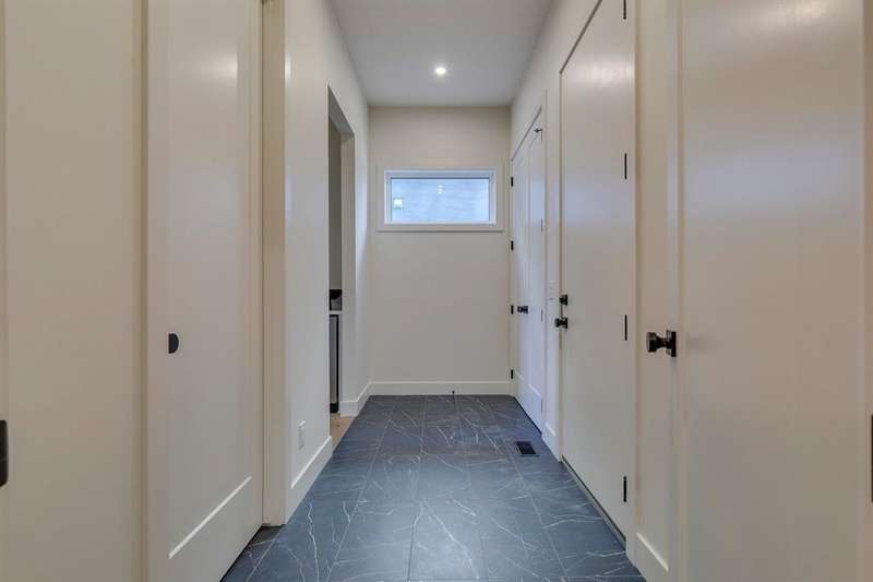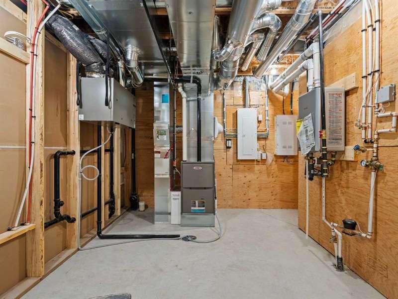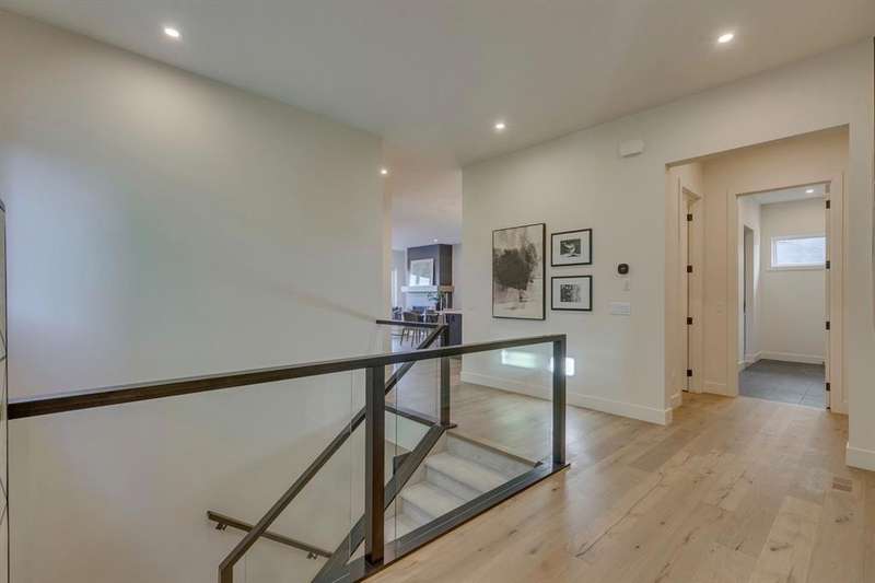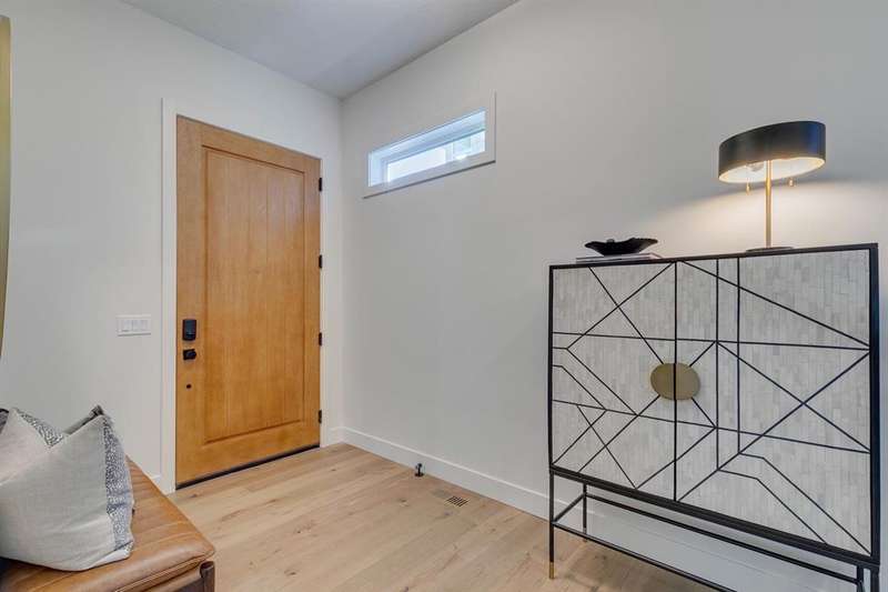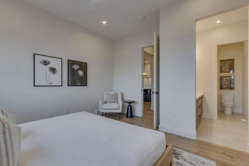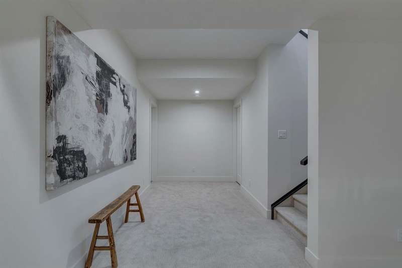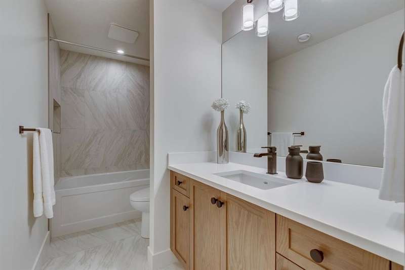 Nestled in the heart of Calgary's prestigious Mahogany Estates, this brand-new custom-built, 3,200 sq ft bungalow by Baywest Homes redefines lakeside living. With exclusive access to a semi-private dock and beach, this home offers an unparalleled lifestyle in one of the city's most sought-after lake communities. The main level, spanning nearly 1,700 square feet, boasts soaring nine-foot ceilings and wide plank luxury hardwood flooring in natural wood tones, creating a warm and inviting ambiance. The open-concept design seamlessly integrates the living, dining, and kitchen areas, making it perfect for both entertaining and everyday living. The kitchen is a chef's dream, featuring full-height white cabinetry, a striking oversized dark island, and a high-end appliance package that includes a high-end Kitchen Aid fridge-freezer and built-in oven with a convention microwave. Quartz countertops extend as a sleek backsplash, complemented by designer lighting and a butler’s pantry equipped with a bar sink and beverage fridge. The living room, with its elegant feature fireplace, opens onto a north-facing deck overlooking serene green space, complete with a gas line for effortless outdoor grilling. The master suite is a private retreat, offering a spa-like en-suite with heated tile floors, an oversized shower, a freestanding soaker tub, dual vanities, and a private water closet. A spacious walk-in closet and adjacent laundry room add to the convenience and luxury of this space. The main floor also includes a private office with glass French doors, a well-appointed mudroom, and a walk-in closet. Descending to the fully finished basement, you'll find a large recreation room, a family room, two generously sized bedrooms, and a full bathroom with heated floors. The home is thoughtfully designed with ample storage and numerous upgrades, including tankless hot water and triple-paned windows. The attached triple garage, with its 14-foot ceilings, offers ample space for a car lift and is equipped with 220V for a vehicle charging station. This property is a masterpiece of design and functionality, offering the perfect blend of luxury, comfort, and convenience. With its prime location and exclusive amenities, lakeside living in Mahogany has never been more enticing.