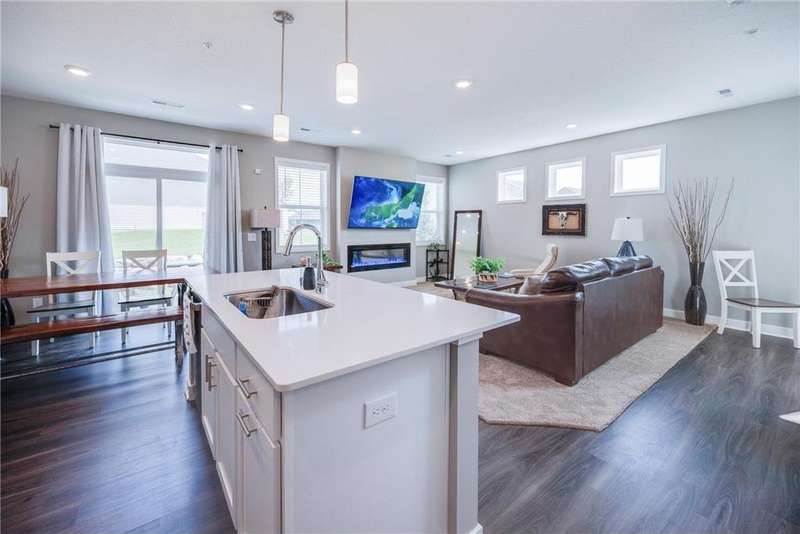 Better than new construction! All New Carpeting throughout! Welcome to this fantastic end-unit townhome with 2 car-garage. Enjoy the green space out the sliding glass door for relaxing on nice evenings on the patio or let your dog out. This "almost new" unit features an upgraded kitchen with white cabinetry, quartz countertops, center island with undermount sink, and upgraded stainless appliances. The nicely sized informal dining area fits a full size dining table. Living area includes TV mount, a beautiful LED fireplace (that produces heat), and tons of windows to let the light shine in. The upper level includes three spacious bedrooms including a primary bedroom with attached 3/4 bath, double vanities, and walk-in closet along with a shared bath and laundry room. Brand new Lifetime Fitness just a short walk away and new Quik Trip just opened right down the road. Move right in and enjoy!